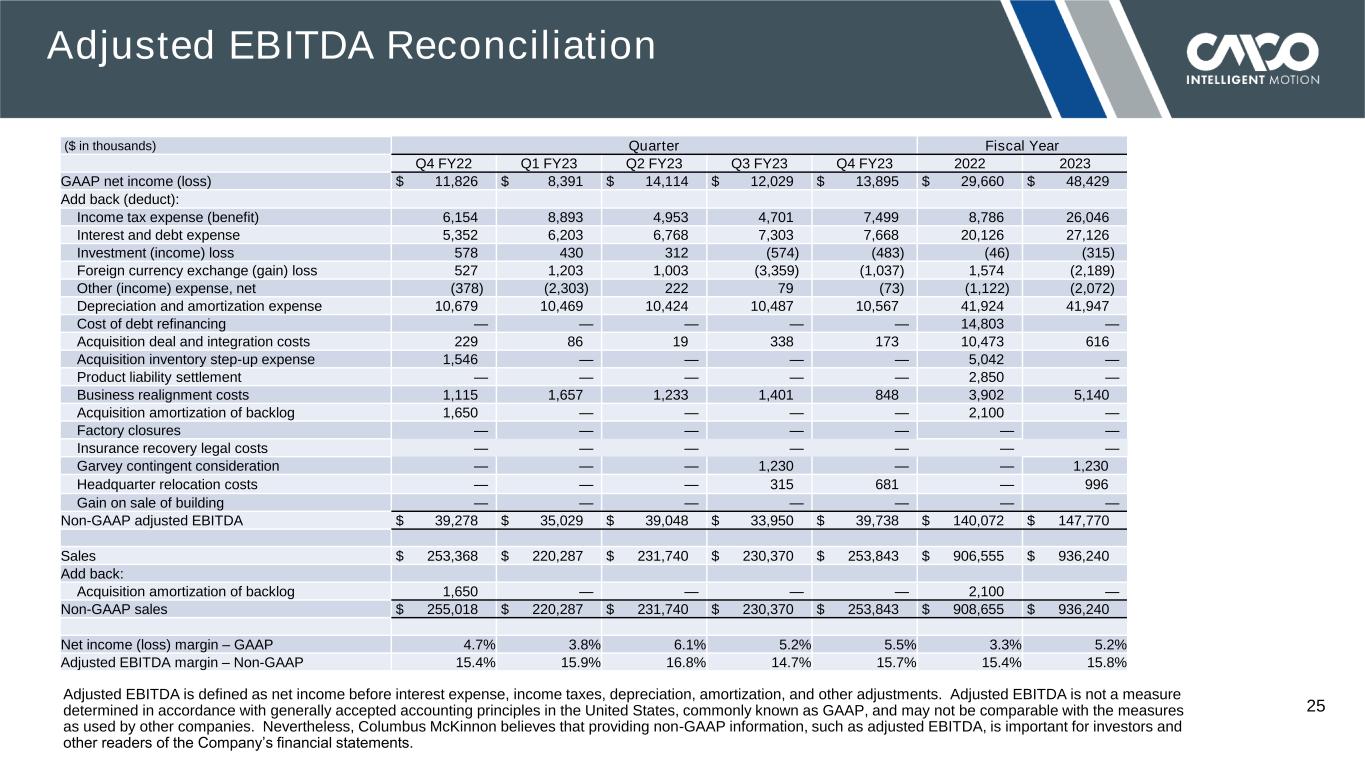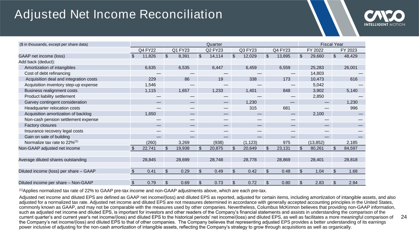 © 2023 COLUMBUS MCKINNON CORPORATION 23 Adjusted Income from Operations Reconciliation Adjusted income from operations is defined as income from operations as reported, adjusted for certain items. Adjusted income from operations is not a measure determined in accordance with generally accepted accounting principles in the United States, commonly known as GAAP, and may not be comparable with the measures as used by other companies. Nevertheless, Columbus McKinnon believes that providing non-GAAP information, such as adjusted income from operations, is important for investors and other readers of the Company’s financial statements and assists in understanding the comparison of the current quarter’s and current year's income from operations to the historical periods' income from operations, as well as facilitates a more meaningful comparison of the Company’s income from operations to that of other companies. ($ in thousands) Quarter Fiscal Year Q4 FY22 Q1 FY23 Q2 FY23 Q3 FY23 Q4 FY23 2022 2023 GAAP income from operations $ 24,059 $ 22,817 $ 27,372 $ 20,179 $ 27,469 $ 73,781 $ 97,841 Add back (deduct): Acquisition deal and integration costs 229 86 19 338 173 10,473 616 Acquisition inventory step-up expense 1,546 — — — — 5,042 — Business realignment costs 1,115 1,657 1,233 1,401 848 3,902 5,140 Garvey contingent consideration — — — 1,230 — — — Product liability settlement — — — — — 2,850 1,230 Headquarter relocation costs — — — 315 681 — 996 Acquisition amortization of backlog 1,650 — — — — 2,100 — Factory closures — — — — — — — Insurance recovery legal costs — — — — — — — Gain on sale of building — — — — — — — Non-GAAP adjusted income from operations $ 28,599 $ 24,560 $ 28,624 $ 23,463 $ 29,171 $ 98,148 $ 105,823 Sales $ 253,368 $ 220,287 $ 231,740 $ 230,370 $ 253,843 $ 906,555 $ 936,240 Add back: Acquisition amortization of backlog 1,650 — — — — 2,100 — Non-GAAP sales $ 255,018 $ 220,287 $ 231,740 $ 230,370 $ 253,843 $ 908,655 $ 936,240 Operating margin – GAAP 9.5% 10.4% 11.8% 8.8% 10.8% 8.1% 10.5% Adjusted operating margin – Non-GAAP 11.2% 11.1% 12.4% 10.2% 11.5% 10.8% 11.3%