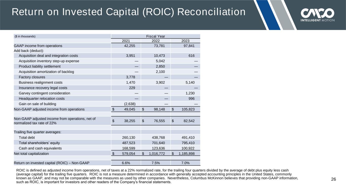 © 2023 COLUMBUS MCKINNON CORPORATION 25 Adjusted EBITDA Reconciliation Adjusted EBITDA is defined as net income before interest expense, income taxes, depreciation, amortization, and other adjustments. Adjusted EBITDA is not a measure determined in accordance with generally accepted accounting principles in the United States, commonly known as GAAP, and may not be comparable with the measures as used by other companies. Nevertheless, Columbus McKinnon believes that providing non-GAAP information, such as adjusted EBITDA, is important for investors and other readers of the Company’s financial statements. ($ in thousands) Quarter Fiscal Year Q4 FY22 Q1 FY23 Q2 FY23 Q3 FY23 Q4 FY23 2022 2023 GAAP net income (loss) $ 11,826 $ 8,391 $ 14,114 $ 12,029 $ 13,895 $ 29,660 $ 48,429 Add back (deduct): Income tax expense (benefit) 6,154 8,893 4,953 4,701 7,499 8,786 26,046 Interest and debt expense 5,352 6,203 6,768 7,303 7,668 20,126 27,126 Investment (income) loss 578 430 312 (574) (483) (46) (315) Foreign currency exchange (gain) loss 527 1,203 1,003 (3,359) (1,037) 1,574 (2,189) Other (income) expense, net (378) (2,303) 222 79 (73) (1,122) (2,072) Depreciation and amortization expense 10,679 10,469 10,424 10,487 10,567 41,924 41,947 Cost of debt refinancing — — — — — 14,803 — Acquisition deal and integration costs 229 86 19 338 173 10,473 616 Acquisition inventory step-up expense 1,546 — — — — 5,042 — Product liability settlement — — — — — 2,850 — Business realignment costs 1,115 1,657 1,233 1,401 848 3,902 5,140 Acquisition amortization of backlog 1,650 — — — — 2,100 — Factory closures — — — — — — — Insurance recovery legal costs — — — — — — — Garvey contingent consideration — — — 1,230 — — 1,230 Headquarter relocation costs — — — 315 681 — 996 Gain on sale of building — — — — — — — Non-GAAP adjusted EBITDA $ 39,278 $ 35,029 $ 39,048 $ 33,950 $ 39,738 $ 140,072 $ 147,770 Sales $ 253,368 $ 220,287 $ 231,740 $ 230,370 $ 253,843 $ 906,555 $ 936,240 Add back: Acquisition amortization of backlog 1,650 — — — — 2,100 — Non-GAAP sales $ 255,018 $ 220,287 $ 231,740 $ 230,370 $ 253,843 $ 908,655 $ 936,240 Net income (loss) margin – GAAP 4.7% 3.8% 6.1% 5.2% 5.5% 3.3% 5.2% Adjusted EBITDA margin – Non-GAAP 15.4% 15.9% 16.8% 14.7% 15.7% 15.4% 15.8%