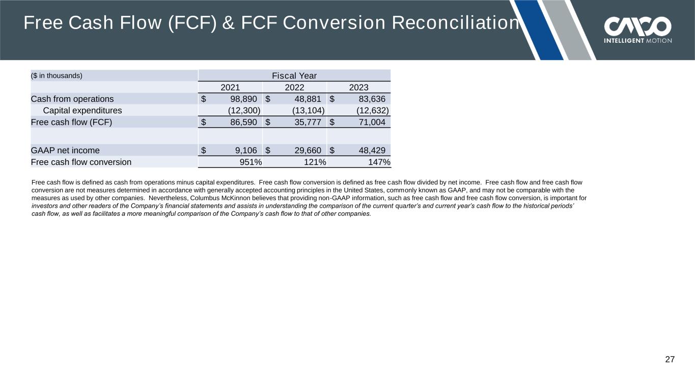 © 2023 COLUMBUS MCKINNON CORPORATION Free Cash Flow (FCF) & FCF Conversion Reconciliation Free cash flow is defined as cash from operations minus capital expenditures. Free cash flow conversion is defined as free cash flow divided by net income. Free cash flow and free cash flow conversion are not measures determined in accordance with generally accepted accounting principles in the United States, commonly known as GAAP, and may not be comparable with the measures as used by other companies. Nevertheless, Columbus McKinnon believes that providing non-GAAP information, such as free cash flow and free cash flow conversion, is important for investors and other readers of the Company’s financial statements and assists in understanding the comparison of the current quarter’s and current year’s cash flow to the historical periods’ cash flow, as well as facilitates a more meaningful comparison of the Company’s cash flow to that of other companies. 27 ($ in thousands) Fiscal Year 2021 2022 2023 Cash from operations $ 98,890 $ 48,881 $ 83,636 Capital expenditures (12,300) (13,104) (12,632) Free cash flow (FCF) $ 86,590 $ 35,777 $ 71,004 GAAP net income $ 9,106 $ 29,660 $ 48,429 Free cash flow conversion 951% 121% 147%