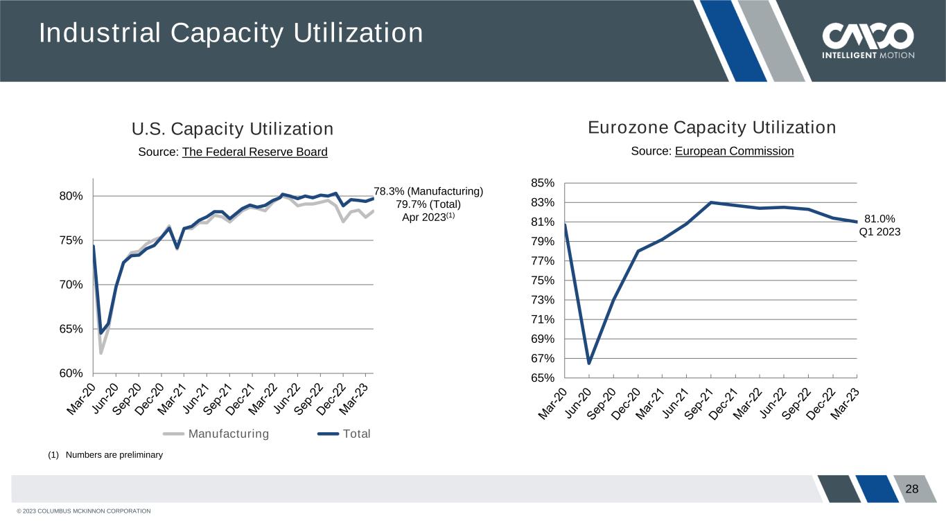 © 2023 COLUMBUS MCKINNON CORPORATION 28 U.S. Capacity Utilization Eurozone Capacity Utilization Industrial Capacity Utilization Source: The Federal Reserve Board Source: European Commission 60% 65% 70% 75% 80% Manufacturing Total 78.3% (Manufacturing) 79.7% (Total) Apr 2023(1) 65% 67% 69% 71% 73% 75% 77% 79% 81% 83% 85% 81.0% Q1 2023 (1) Numbers are preliminary