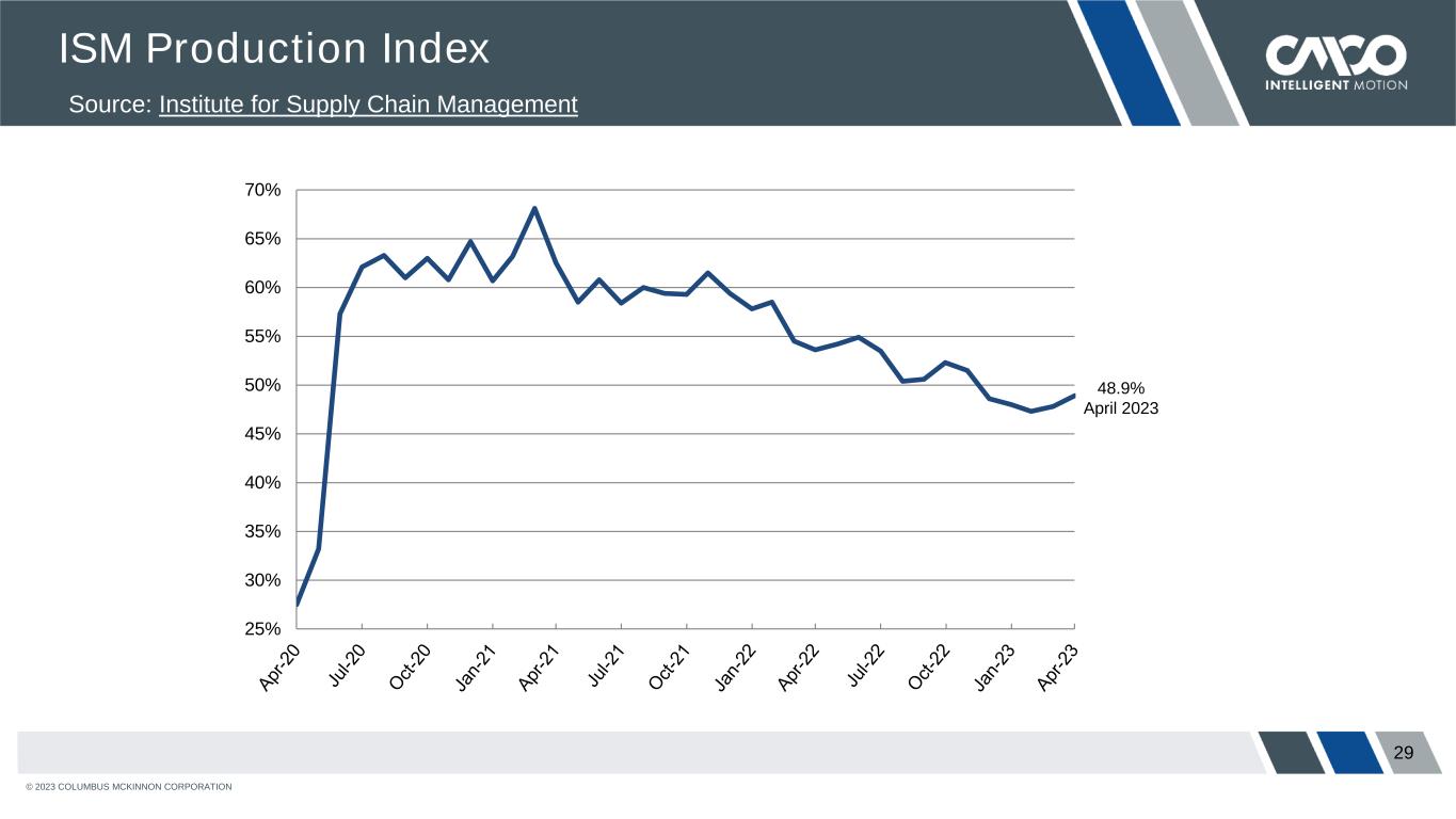 © 2023 COLUMBUS MCKINNON CORPORATION 29 ISM Production Index Source: Institute for Supply Chain Management 25% 30% 35% 40% 45% 50% 55% 60% 65% 70% 48.9% April 2023