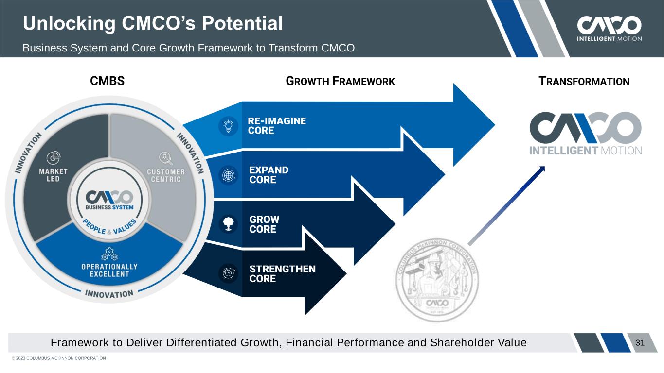 © 2023 COLUMBUS MCKINNON CORPORATION 31 Unlocking CMCO’s Potential Business System and Core Growth Framework to Transform CMCO Framework to Deliver Differentiated Growth, Financial Performance and Shareholder Value GROWTH FRAMEWORKCMBS TRANSFORMATION