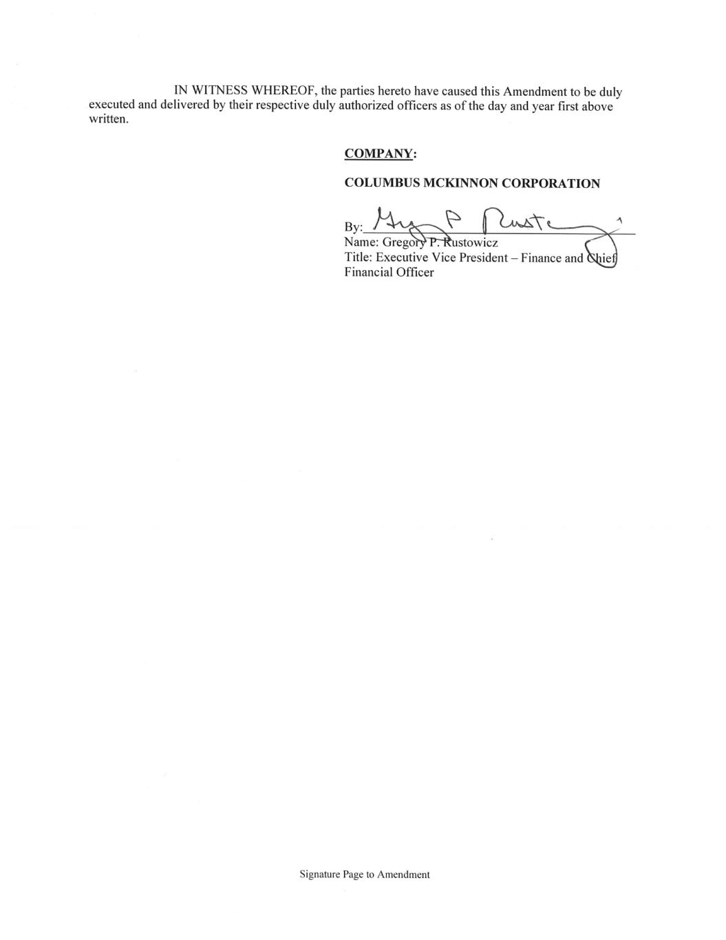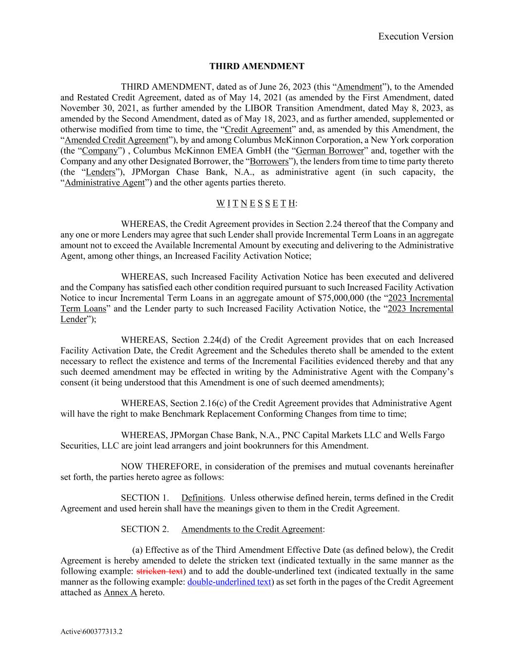 Execution Version Active\600377313.2 THIRD AMENDMENT THIRD AMENDMENT, dated as of June 26, 2023 (this “Amendment”), to the Amended and Restated Credit Agreement, dated as of May 14, 2021 (as amended by the First Amendment, dated November 30, 2021, as further amended by the LIBOR Transition Amendment, dated May 8, 2023, as amended by the Second Amendment, dated as of May 18, 2023, and as further amended, supplemented or otherwise modified from time to time, the “Credit Agreement” and, as amended by this Amendment, the “Amended Credit Agreement”), by and among Columbus McKinnon Corporation, a New York corporation (the “Company”) , Columbus McKinnon EMEA GmbH (the “German Borrower” and, together with the Company and any other Designated Borrower, the “Borrowers”), the lenders from time to time party thereto (the “Lenders”), JPMorgan Chase Bank, N.A., as administrative agent (in such capacity, the “Administrative Agent”) and the other agents parties thereto. W I T N E S S E T H: WHEREAS, the Credit Agreement provides in Section 2.24 thereof that the Company and any one or more Lenders may agree that such Lender shall provide Incremental Term Loans in an aggregate amount not to exceed the Available Incremental Amount by executing and delivering to the Administrative Agent, among other things, an Increased Facility Activation Notice; WHEREAS, such Increased Facility Activation Notice has been executed and delivered and the Company has satisfied each other condition required pursuant to such Increased Facility Activation Notice to incur Incremental Term Loans in an aggregate amount of $75,000,000 (the “2023 Incremental Term Loans” and the Lender party to such Increased Facility Activation Notice, the “2023 Incremental Lender”); WHEREAS, Section 2.24(d) of the Credit Agreement provides that on each Increased Facility Activation Date, the Credit Agreement and the Schedules thereto shall be amended to the extent necessary to reflect the existence and terms of the Incremental Facilities evidenced thereby and that any such deemed amendment may be effected in writing by the Administrative Agent with the Company’s consent (it being understood that this Amendment is one of such deemed amendments); WHEREAS, Section 2.16(c) of the Credit Agreement provides that Administrative Agent will have the right to make Benchmark Replacement Conforming Changes from time to time; WHEREAS, JPMorgan Chase Bank, N.A., PNC Capital Markets LLC and Wells Fargo Securities, LLC are joint lead arrangers and joint bookrunners for this Amendment. NOW THEREFORE, in consideration of the premises and mutual covenants hereinafter set forth, the parties hereto agree as follows: SECTION 1. Definitions. Unless otherwise defined herein, terms defined in the Credit Agreement and used herein shall have the meanings given to them in the Credit Agreement. SECTION 2. Amendments to the Credit Agreement: (a) Effective as of the Third Amendment Effective Date (as defined below), the Credit Agreement is hereby amended to delete the stricken text (indicated textually in the same manner as the following example: stricken text) and to add the double-underlined text (indicated textually in the same manner as the following example: double-underlined text) as set forth in the pages of the Credit Agreement attached as Annex A hereto.