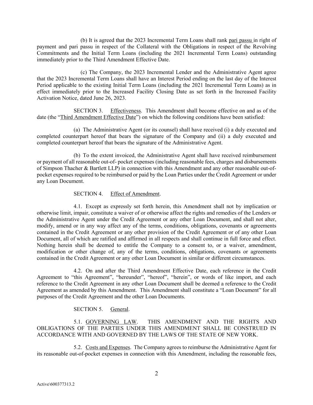 2 Active\600377313.2 (b) It is agreed that the 2023 Incremental Term Loans shall rank pari passu in right of payment and pari passu in respect of the Collateral with the Obligations in respect of the Revolving Commitments and the Initial Term Loans (including the 2021 Incremental Term Loans) outstanding immediately prior to the Third Amendment Effective Date. (c) The Company, the 2023 Incremental Lender and the Administrative Agent agree that the 2023 Incremental Term Loans shall have an Interest Period ending on the last day of the Interest Period applicable to the existing Initial Term Loans (including the 2021 Incremental Term Loans) as in effect immediately prior to the Increased Facility Closing Date as set forth in the Increased Facility Activation Notice, dated June 26, 2023. SECTION 3. Effectiveness. This Amendment shall become effective on and as of the date (the “Third Amendment Effective Date”) on which the following conditions have been satisfied: (a) The Administrative Agent (or its counsel) shall have received (i) a duly executed and completed counterpart hereof that bears the signature of the Company and (ii) a duly executed and completed counterpart hereof that bears the signature of the Administrative Agent. (b) To the extent invoiced, the Administrative Agent shall have received reimbursement or payment of all reasonable out-of- pocket expenses (including reasonable fees, charges and disbursements of Simpson Thacher & Bartlett LLP) in connection with this Amendment and any other reasonable out-of- pocket expenses required to be reimbursed or paid by the Loan Parties under the Credit Agreement or under any Loan Document. SECTION 4. Effect of Amendment. 4.1. Except as expressly set forth herein, this Amendment shall not by implication or otherwise limit, impair, constitute a waiver of or otherwise affect the rights and remedies of the Lenders or the Administrative Agent under the Credit Agreement or any other Loan Document, and shall not alter, modify, amend or in any way affect any of the terms, conditions, obligations, covenants or agreements contained in the Credit Agreement or any other provision of the Credit Agreement or of any other Loan Document, all of which are ratified and affirmed in all respects and shall continue in full force and effect. Nothing herein shall be deemed to entitle the Company to a consent to, or a waiver, amendment, modification or other change of, any of the terms, conditions, obligations, covenants or agreements contained in the Credit Agreement or any other Loan Document in similar or different circumstances. 4.2. On and after the Third Amendment Effective Date, each reference in the Credit Agreement to “this Agreement”, “hereunder”, “hereof”, “herein”, or words of like import, and each reference to the Credit Agreement in any other Loan Document shall be deemed a reference to the Credit Agreement as amended by this Amendment. This Amendment shall constitute a “Loan Document” for all purposes of the Credit Agreement and the other Loan Documents. SECTION 5. General. 5.1. GOVERNING LAW. THIS AMENDMENT AND THE RIGHTS AND OBLIGATIONS OF THE PARTIES UNDER THIS AMENDMENT SHALL BE CONSTRUED IN ACCORDANCE WITH AND GOVERNED BY THE LAWS OF THE STATE OF NEW YORK. 5.2. Costs and Expenses. The Company agrees to reimburse the Administrative Agent for its reasonable out-of-pocket expenses in connection with this Amendment, including the reasonable fees,