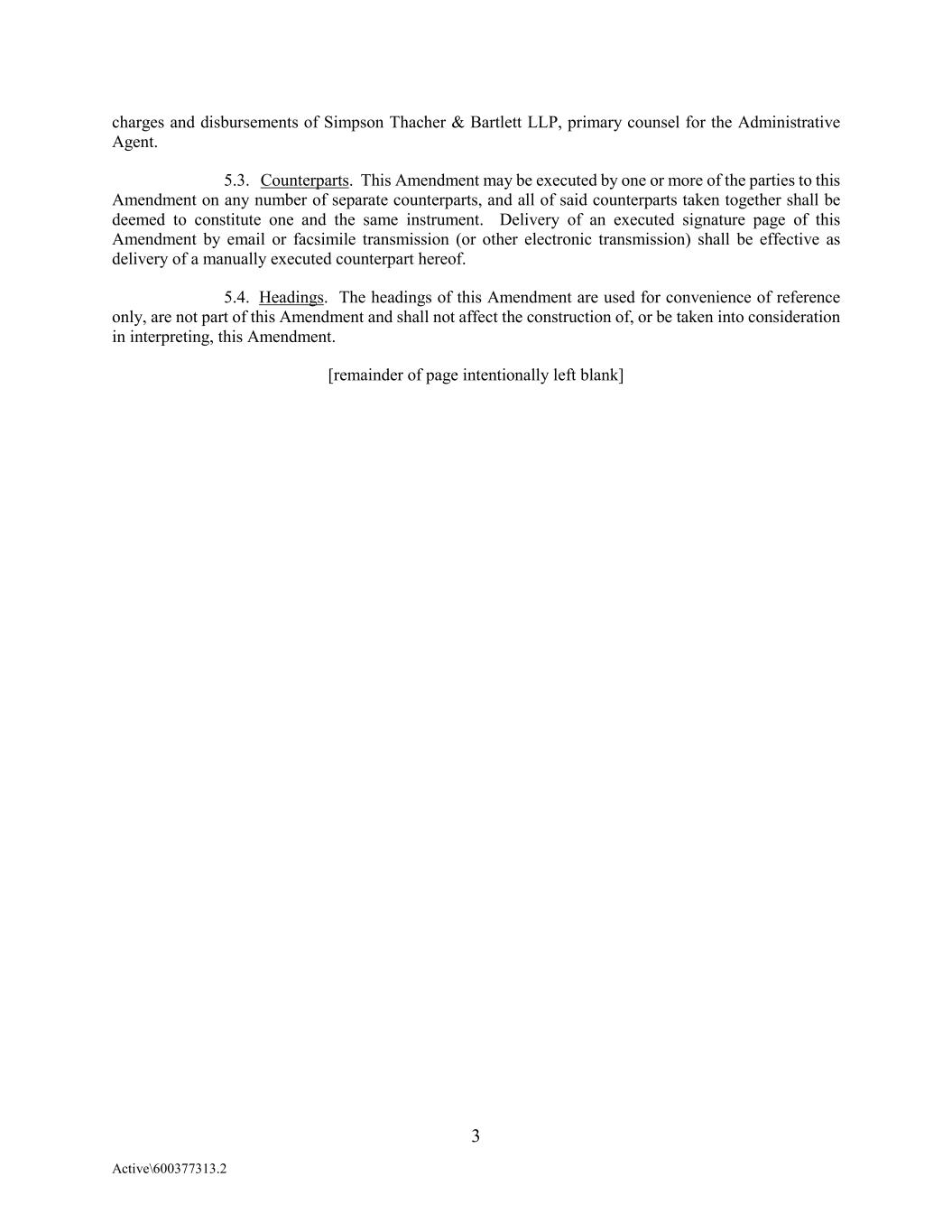 3 Active\600377313.2 charges and disbursements of Simpson Thacher & Bartlett LLP, primary counsel for the Administrative Agent. 5.3. Counterparts. This Amendment may be executed by one or more of the parties to this Amendment on any number of separate counterparts, and all of said counterparts taken together shall be deemed to constitute one and the same instrument. Delivery of an executed signature page of this Amendment by email or facsimile transmission (or other electronic transmission) shall be effective as delivery of a manually executed counterpart hereof. 5.4. Headings. The headings of this Amendment are used for convenience of reference only, are not part of this Amendment and shall not affect the construction of, or be taken into consideration in interpreting, this Amendment. [remainder of page intentionally left blank]