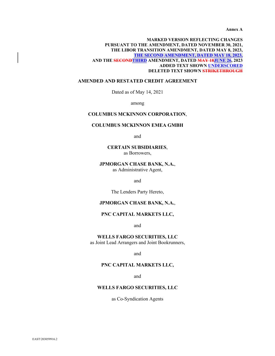 Annex A MARKED VERSION REFLECTING CHANGES PURSUANT TO THE AMENDMENT, DATED NOVEMBER 30, 2021, THE LIBOR TRANSITION AMENDMENT, DATED MAY 8, 2023, THE SECOND AMENDMENT, DATED MAY 18, 2023, AND THE SECONDTHIRD AMENDMENT, DATED MAY 18JUNE 26, 2023 ADDED TEXT SHOWN UNDERSCORED DELETED TEXT SHOWN STRIKETHROUGH AMENDED AND RESTATED CREDIT AGREEMENT Dated as of May 14, 2021 among COLUMBUS MCKINNON CORPORATION, COLUMBUS MCKINNON EMEA GMBH and CERTAIN SUBSIDIARIES, as Borrowers, JPMORGAN CHASE BANK, N.A., as Administrative Agent, and The Lenders Party Hereto, JPMORGAN CHASE BANK, N.A., PNC CAPITAL MARKETS LLC, and WELLS FARGO SECURITIES, LLC as Joint Lead Arrangers and Joint Bookrunners, and PNC CAPITAL MARKETS LLC, and WELLS FARGO SECURITIES, LLC as Co-Syndication Agents EAST\203059916.2