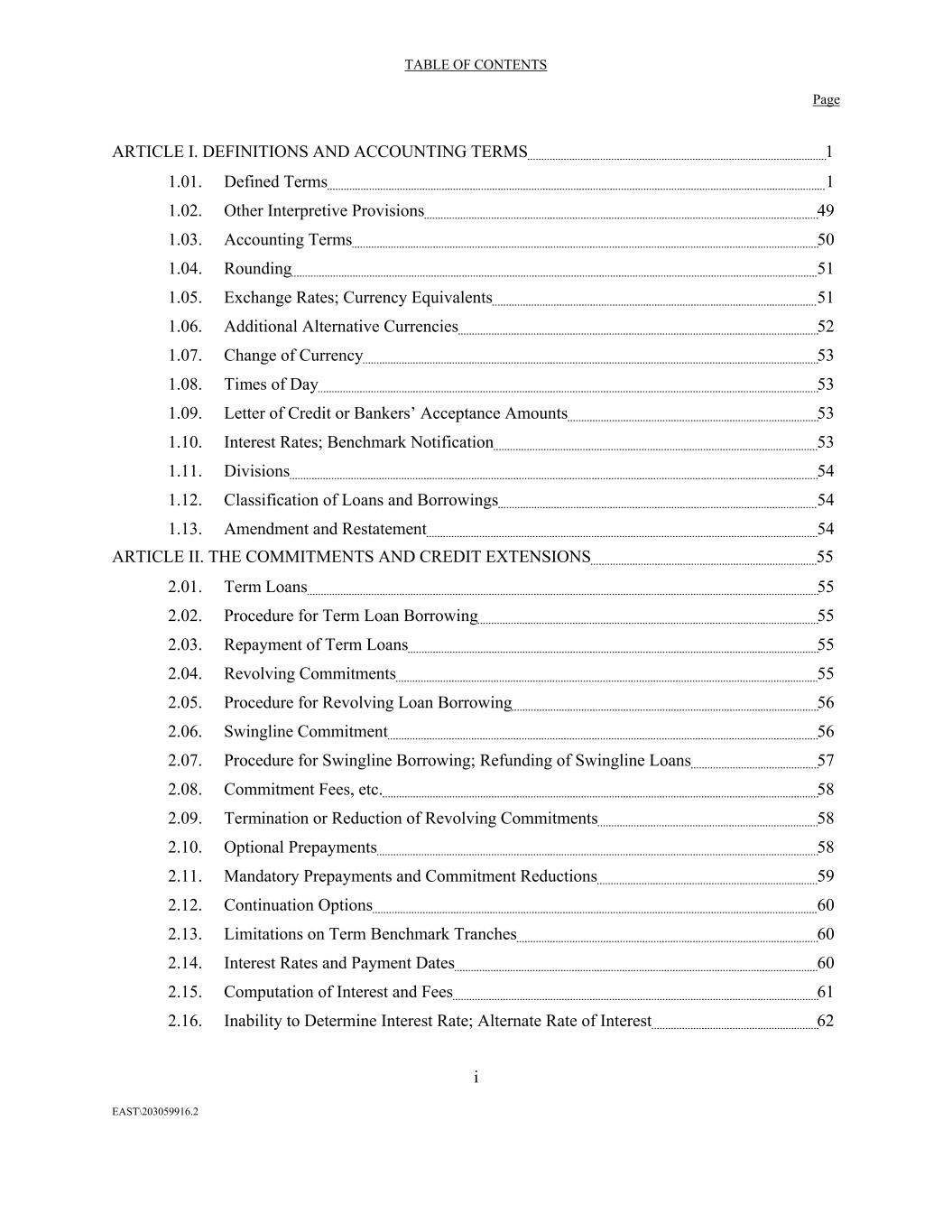 TABLE OF CONTENTS Page i EAST\203059916.2 ARTICLE I. DEFINITIONS AND ACCOUNTING TERMS 1 1.01. Defined Terms 1 1.02. Other Interpretive Provisions 49 1.03. Accounting Terms 50 1.04. Rounding 51 1.05. Exchange Rates; Currency Equivalents 51 1.06. Additional Alternative Currencies 52 1.07. Change of Currency 53 1.08. Times of Day 53 1.09. Letter of Credit or Bankers’ Acceptance Amounts 53 1.10. Interest Rates; Benchmark Notification 53 1.11. Divisions 54 1.12. Classification of Loans and Borrowings 54 1.13. Amendment and Restatement 54 ARTICLE II. THE COMMITMENTS AND CREDIT EXTENSIONS 55 2.01. Term Loans 55 2.02. Procedure for Term Loan Borrowing 55 2.03. Repayment of Term Loans 55 2.04. Revolving Commitments 55 2.05. Procedure for Revolving Loan Borrowing 56 2.06. Swingline Commitment 56 2.07. Procedure for Swingline Borrowing; Refunding of Swingline Loans 57 2.08. Commitment Fees, etc. 58 2.09. Termination or Reduction of Revolving Commitments 58 2.10. Optional Prepayments 58 2.11. Mandatory Prepayments and Commitment Reductions 59 2.12. Continuation Options 60 2.13. Limitations on Term Benchmark Tranches 60 2.14. Interest Rates and Payment Dates 60 2.15. Computation of Interest and Fees 61 2.16. Inability to Determine Interest Rate; Alternate Rate of Interest 62