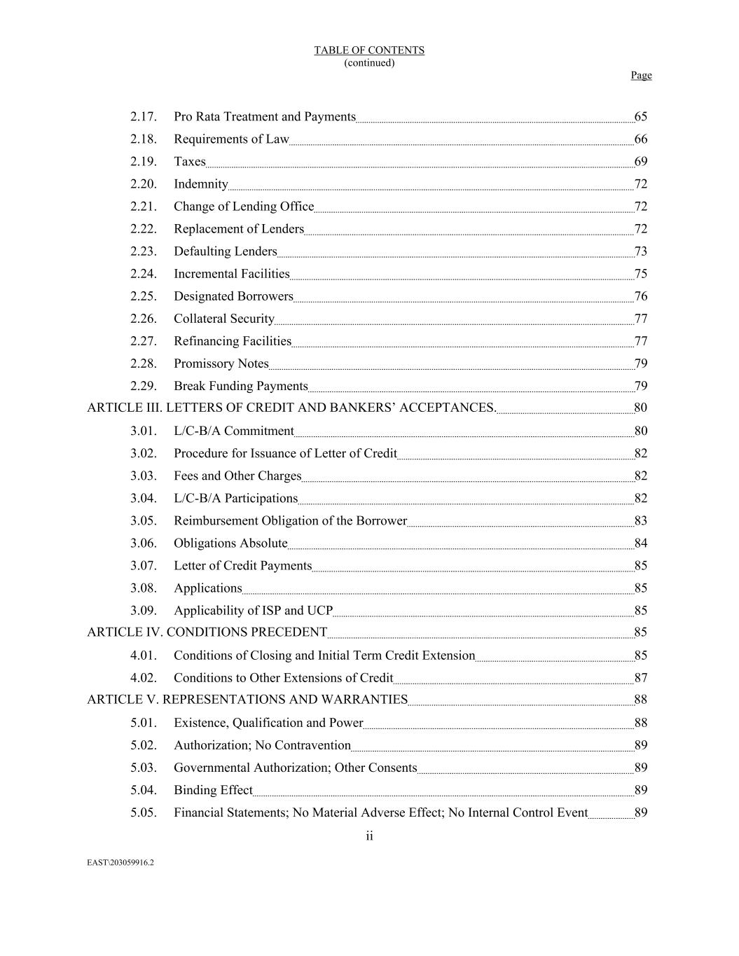 TABLE OF CONTENTS (continued) Page ii EAST\203059916.2 2.17. Pro Rata Treatment and Payments 65 2.18. Requirements of Law 66 2.19. Taxes 69 2.20. Indemnity 72 2.21. Change of Lending Office 72 2.22. Replacement of Lenders 72 2.23. Defaulting Lenders 73 2.24. Incremental Facilities 75 2.25. Designated Borrowers 76 2.26. Collateral Security 77 2.27. Refinancing Facilities 77 2.28. Promissory Notes 79 2.29. Break Funding Payments 79 ARTICLE III. LETTERS OF CREDIT AND BANKERS’ ACCEPTANCES. 80 3.01. L/C-B/A Commitment 80 3.02. Procedure for Issuance of Letter of Credit 82 3.03. Fees and Other Charges 82 3.04. L/C-B/A Participations 82 3.05. Reimbursement Obligation of the Borrower 83 3.06. Obligations Absolute 84 3.07. Letter of Credit Payments 85 3.08. Applications 85 3.09. Applicability of ISP and UCP 85 ARTICLE IV. CONDITIONS PRECEDENT 85 4.01. Conditions of Closing and Initial Term Credit Extension 85 4.02. Conditions to Other Extensions of Credit 87 ARTICLE V. REPRESENTATIONS AND WARRANTIES 88 5.01. Existence, Qualification and Power 88 5.02. Authorization; No Contravention 89 5.03. Governmental Authorization; Other Consents 89 5.04. Binding Effect 89 5.05. Financial Statements; No Material Adverse Effect; No Internal Control Event 89