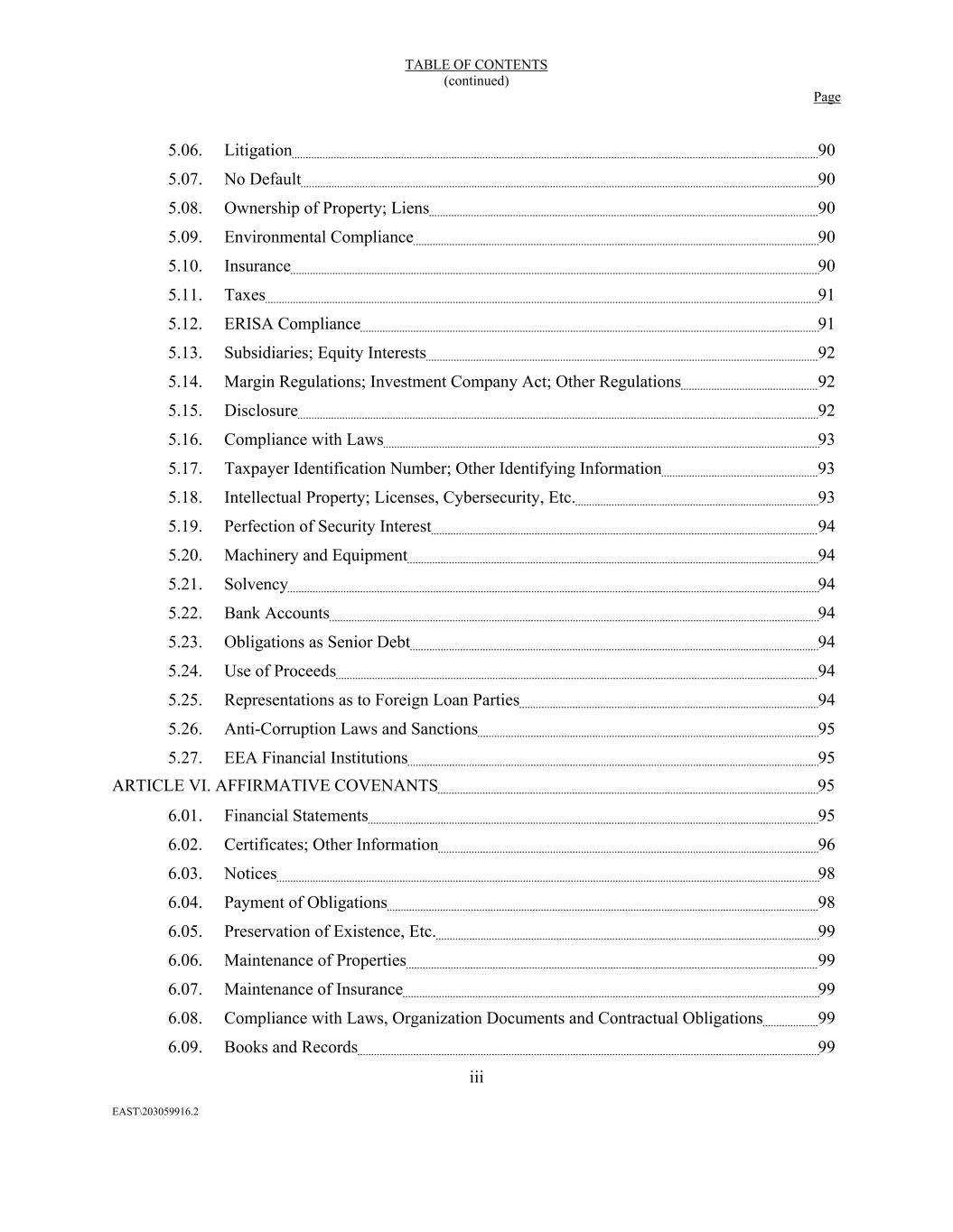 TABLE OF CONTENTS (continued) Page iii EAST\203059916.2 5.06. Litigation 90 5.07. No Default 90 5.08. Ownership of Property; Liens 90 5.09. Environmental Compliance 90 5.10. Insurance 90 5.11. Taxes 91 5.12. ERISA Compliance 91 5.13. Subsidiaries; Equity Interests 92 5.14. Margin Regulations; Investment Company Act; Other Regulations 92 5.15. Disclosure 92 5.16. Compliance with Laws 93 5.17. Taxpayer Identification Number; Other Identifying Information 93 5.18. Intellectual Property; Licenses, Cybersecurity, Etc. 93 5.19. Perfection of Security Interest 94 5.20. Machinery and Equipment 94 5.21. Solvency 94 5.22. Bank Accounts 94 5.23. Obligations as Senior Debt 94 5.24. Use of Proceeds 94 5.25. Representations as to Foreign Loan Parties 94 5.26. Anti-Corruption Laws and Sanctions 95 5.27. EEA Financial Institutions 95 ARTICLE VI. AFFIRMATIVE COVENANTS 95 6.01. Financial Statements 95 6.02. Certificates; Other Information 96 6.03. Notices 98 6.04. Payment of Obligations 98 6.05. Preservation of Existence, Etc. 99 6.06. Maintenance of Properties 99 6.07. Maintenance of Insurance 99 6.08. Compliance with Laws, Organization Documents and Contractual Obligations 99 6.09. Books and Records 99
