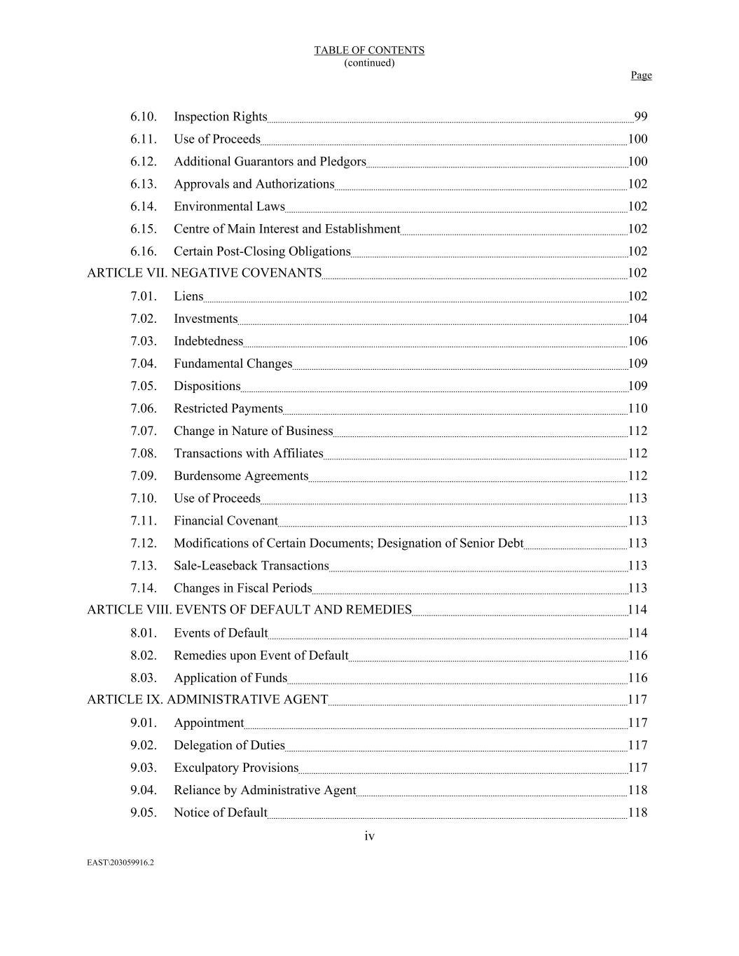 TABLE OF CONTENTS (continued) Page iv EAST\203059916.2 6.10. Inspection Rights 99 6.11. Use of Proceeds 100 6.12. Additional Guarantors and Pledgors 100 6.13. Approvals and Authorizations 102 6.14. Environmental Laws 102 6.15. Centre of Main Interest and Establishment 102 6.16. Certain Post-Closing Obligations 102 ARTICLE VII. NEGATIVE COVENANTS 102 7.01. Liens 102 7.02. Investments 104 7.03. Indebtedness 106 7.04. Fundamental Changes 109 7.05. Dispositions 109 7.06. Restricted Payments 110 7.07. Change in Nature of Business 112 7.08. Transactions with Affiliates 112 7.09. Burdensome Agreements 112 7.10. Use of Proceeds 113 7.11. Financial Covenant 113 7.12. Modifications of Certain Documents; Designation of Senior Debt 113 7.13. Sale-Leaseback Transactions 113 7.14. Changes in Fiscal Periods 113 ARTICLE VIII. EVENTS OF DEFAULT AND REMEDIES 114 8.01. Events of Default 114 8.02. Remedies upon Event of Default 116 8.03. Application of Funds 116 ARTICLE IX. ADMINISTRATIVE AGENT 117 9.01. Appointment 117 9.02. Delegation of Duties 117 9.03. Exculpatory Provisions 117 9.04. Reliance by Administrative Agent 118 9.05. Notice of Default 118