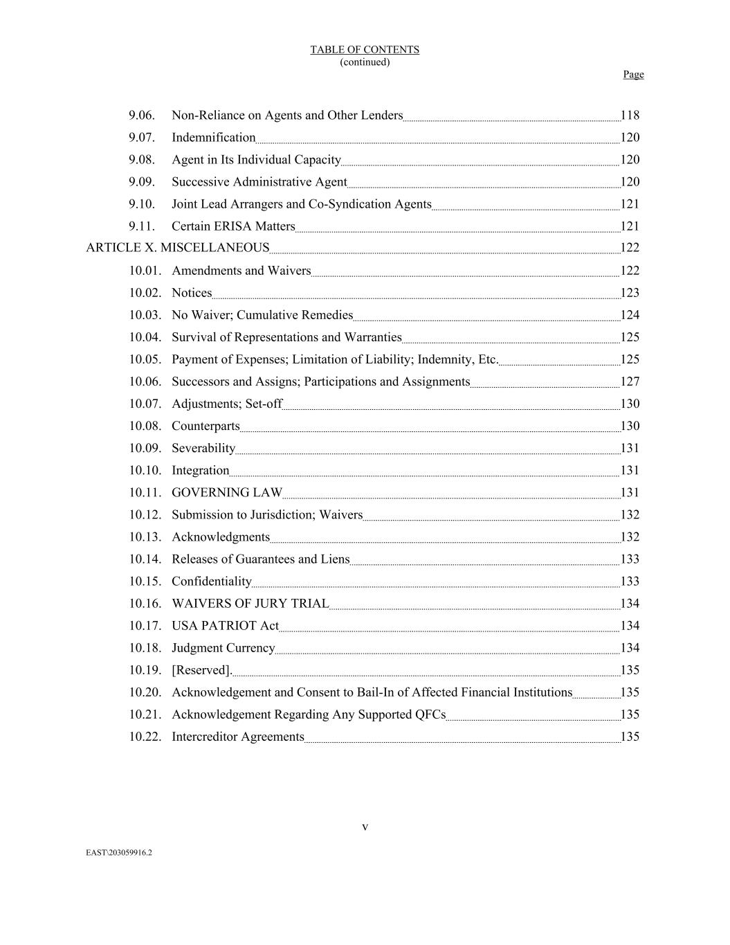 TABLE OF CONTENTS (continued) Page v EAST\203059916.2 9.06. Non-Reliance on Agents and Other Lenders 118 9.07. Indemnification 120 9.08. Agent in Its Individual Capacity 120 9.09. Successive Administrative Agent 120 9.10. Joint Lead Arrangers and Co-Syndication Agents 121 9.11. Certain ERISA Matters 121 ARTICLE X. MISCELLANEOUS 122 10.01. Amendments and Waivers 122 10.02. Notices 123 10.03. No Waiver; Cumulative Remedies 124 10.04. Survival of Representations and Warranties 125 10.05. Payment of Expenses; Limitation of Liability; Indemnity, Etc. 125 10.06. Successors and Assigns; Participations and Assignments 127 10.07. Adjustments; Set-off 130 10.08. Counterparts 130 10.09. Severability 131 10.10. Integration 131 10.11. GOVERNING LAW 131 10.12. Submission to Jurisdiction; Waivers 132 10.13. Acknowledgments 132 10.14. Releases of Guarantees and Liens 133 10.15. Confidentiality 133 10.16. WAIVERS OF JURY TRIAL 134 10.17. USA PATRIOT Act 134 10.18. Judgment Currency 134 10.19. [Reserved]. 135 10.20. Acknowledgement and Consent to Bail-In of Affected Financial Institutions 135 10.21. Acknowledgement Regarding Any Supported QFCs 135 10.22. Intercreditor Agreements 135