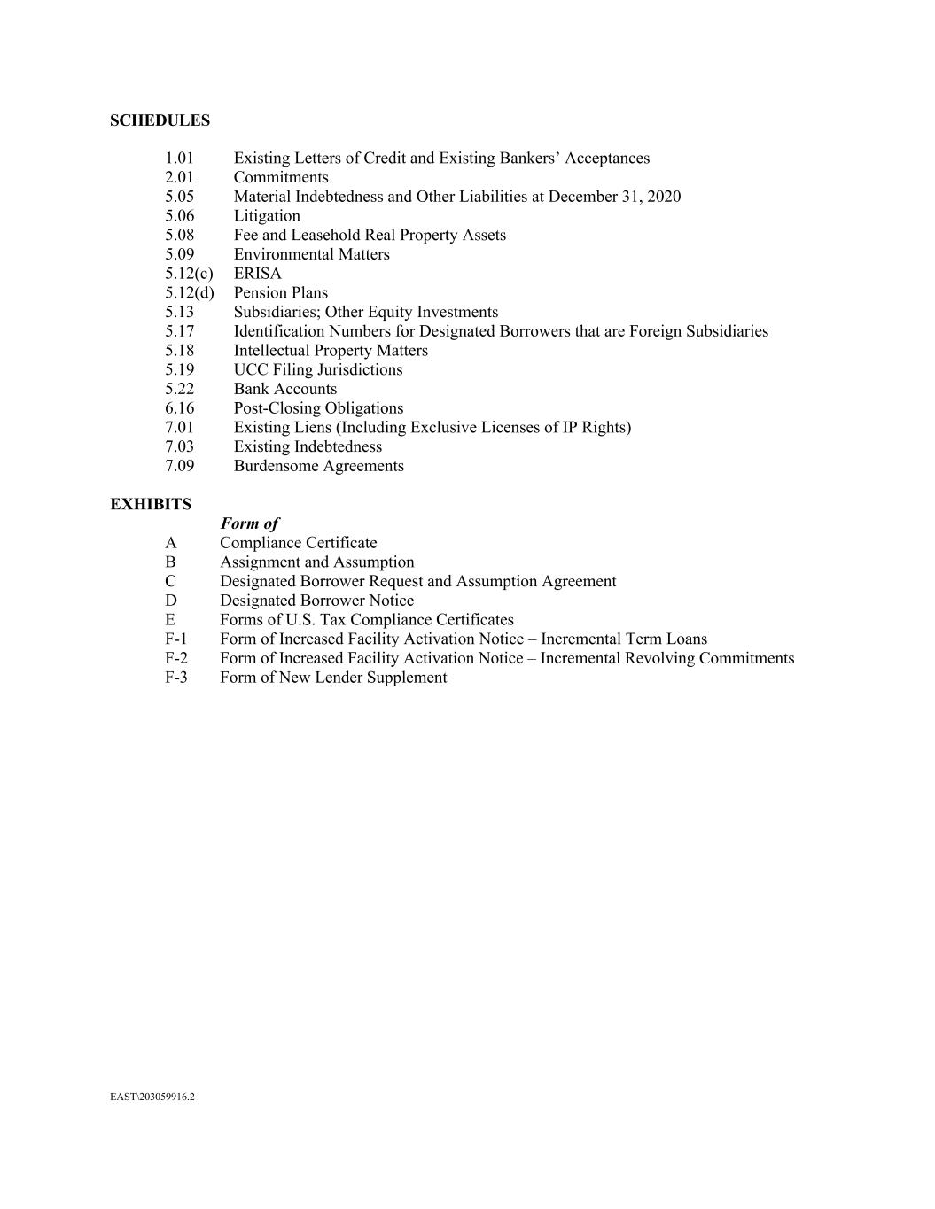 SCHEDULES 1.01 Existing Letters of Credit and Existing Bankers’ Acceptances 2.01 Commitments 5.05 Material Indebtedness and Other Liabilities at December 31, 2020 5.06 Litigation 5.08 Fee and Leasehold Real Property Assets 5.09 Environmental Matters 5.12(c) ERISA 5.12(d) Pension Plans 5.13 Subsidiaries; Other Equity Investments 5.17 Identification Numbers for Designated Borrowers that are Foreign Subsidiaries 5.18 Intellectual Property Matters 5.19 UCC Filing Jurisdictions 5.22 Bank Accounts 6.16 Post-Closing Obligations 7.01 Existing Liens (Including Exclusive Licenses of IP Rights) 7.03 Existing Indebtedness 7.09 Burdensome Agreements EXHIBITS Form of A Compliance Certificate B Assignment and Assumption C Designated Borrower Request and Assumption Agreement D Designated Borrower Notice E Forms of U.S. Tax Compliance Certificates F-1 Form of Increased Facility Activation Notice – Incremental Term Loans F-2 Form of Increased Facility Activation Notice – Incremental Revolving Commitments F-3 Form of New Lender Supplement EAST\203059916.2