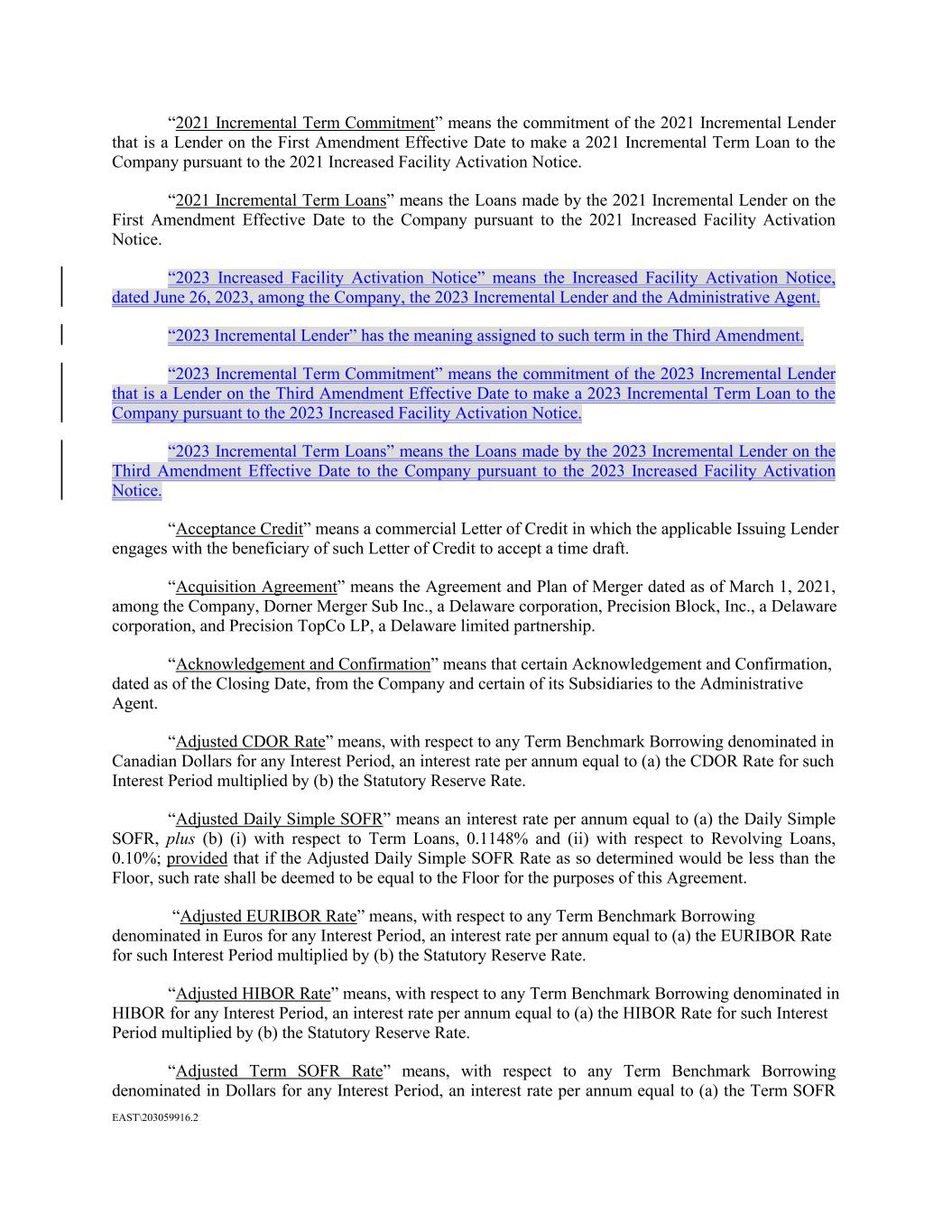 “2021 Incremental Term Commitment” means the commitment of the 2021 Incremental Lender that is a Lender on the First Amendment Effective Date to make a 2021 Incremental Term Loan to the Company pursuant to the 2021 Increased Facility Activation Notice. “2021 Incremental Term Loans” means the Loans made by the 2021 Incremental Lender on the First Amendment Effective Date to the Company pursuant to the 2021 Increased Facility Activation Notice. “2023 Increased Facility Activation Notice” means the Increased Facility Activation Notice, dated June 26, 2023, among the Company, the 2023 Incremental Lender and the Administrative Agent. “2023 Incremental Lender” has the meaning assigned to such term in the Third Amendment. “2023 Incremental Term Commitment” means the commitment of the 2023 Incremental Lender that is a Lender on the Third Amendment Effective Date to make a 2023 Incremental Term Loan to the Company pursuant to the 2023 Increased Facility Activation Notice. “2023 Incremental Term Loans” means the Loans made by the 2023 Incremental Lender on the Third Amendment Effective Date to the Company pursuant to the 2023 Increased Facility Activation Notice. “Acceptance Credit” means a commercial Letter of Credit in which the applicable Issuing Lender engages with the beneficiary of such Letter of Credit to accept a time draft. “Acquisition Agreement” means the Agreement and Plan of Merger dated as of March 1, 2021, among the Company, Dorner Merger Sub Inc., a Delaware corporation, Precision Block, Inc., a Delaware corporation, and Precision TopCo LP, a Delaware limited partnership. “Acknowledgement and Confirmation” means that certain Acknowledgement and Confirmation, dated as of the Closing Date, from the Company and certain of its Subsidiaries to the Administrative Agent. “Adjusted CDOR Rate” means, with respect to any Term Benchmark Borrowing denominated in Canadian Dollars for any Interest Period, an interest rate per annum equal to (a) the CDOR Rate for such Interest Period multiplied by (b) the Statutory Reserve Rate. “Adjusted Daily Simple SOFR” means an interest rate per annum equal to (a) the Daily Simple SOFR, plus (b) (i) with respect to Term Loans, 0.1148% and (ii) with respect to Revolving Loans, 0.10%; provided that if the Adjusted Daily Simple SOFR Rate as so determined would be less than the Floor, such rate shall be deemed to be equal to the Floor for the purposes of this Agreement. “Adjusted EURIBOR Rate” means, with respect to any Term Benchmark Borrowing denominated in Euros for any Interest Period, an interest rate per annum equal to (a) the EURIBOR Rate for such Interest Period multiplied by (b) the Statutory Reserve Rate. “Adjusted HIBOR Rate” means, with respect to any Term Benchmark Borrowing denominated in HIBOR for any Interest Period, an interest rate per annum equal to (a) the HIBOR Rate for such Interest Period multiplied by (b) the Statutory Reserve Rate. “Adjusted Term SOFR Rate” means, with respect to any Term Benchmark Borrowing denominated in Dollars for any Interest Period, an interest rate per annum equal to (a) the Term SOFR EAST\203059916.2