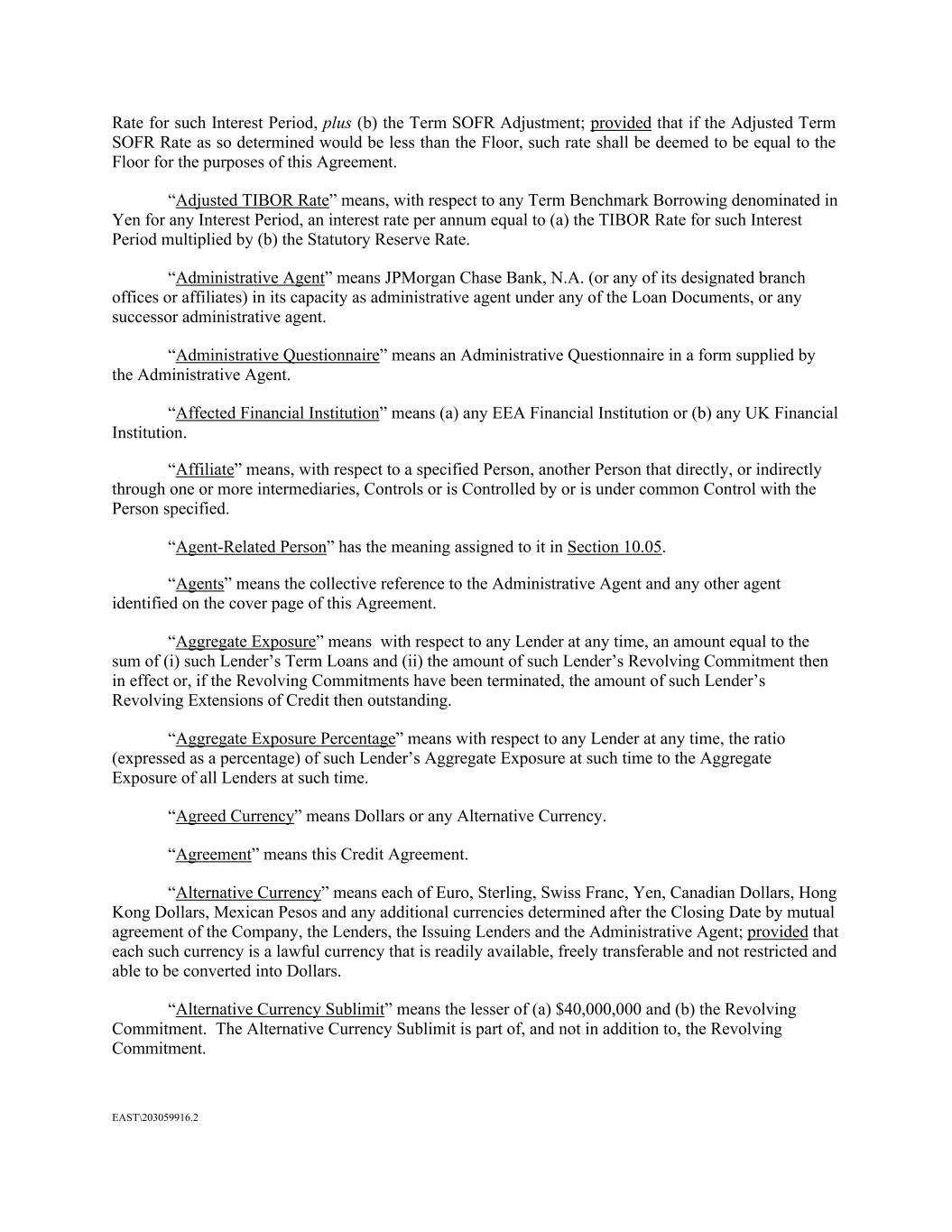 Rate for such Interest Period, plus (b) the Term SOFR Adjustment; provided that if the Adjusted Term SOFR Rate as so determined would be less than the Floor, such rate shall be deemed to be equal to the Floor for the purposes of this Agreement. “Adjusted TIBOR Rate” means, with respect to any Term Benchmark Borrowing denominated in Yen for any Interest Period, an interest rate per annum equal to (a) the TIBOR Rate for such Interest Period multiplied by (b) the Statutory Reserve Rate. “Administrative Agent” means JPMorgan Chase Bank, N.A. (or any of its designated branch offices or affiliates) in its capacity as administrative agent under any of the Loan Documents, or any successor administrative agent. “Administrative Questionnaire” means an Administrative Questionnaire in a form supplied by the Administrative Agent. “Affected Financial Institution” means (a) any EEA Financial Institution or (b) any UK Financial Institution. “Affiliate” means, with respect to a specified Person, another Person that directly, or indirectly through one or more intermediaries, Controls or is Controlled by or is under common Control with the Person specified. “Agent-Related Person” has the meaning assigned to it in Section 10.05. “Agents” means the collective reference to the Administrative Agent and any other agent identified on the cover page of this Agreement. “Aggregate Exposure” means with respect to any Lender at any time, an amount equal to the sum of (i) such Lender’s Term Loans and (ii) the amount of such Lender’s Revolving Commitment then in effect or, if the Revolving Commitments have been terminated, the amount of such Lender’s Revolving Extensions of Credit then outstanding. “Aggregate Exposure Percentage” means with respect to any Lender at any time, the ratio (expressed as a percentage) of such Lender’s Aggregate Exposure at such time to the Aggregate Exposure of all Lenders at such time. “Agreed Currency” means Dollars or any Alternative Currency. “Agreement” means this Credit Agreement. “Alternative Currency” means each of Euro, Sterling, Swiss Franc, Yen, Canadian Dollars, Hong Kong Dollars, Mexican Pesos and any additional currencies determined after the Closing Date by mutual agreement of the Company, the Lenders, the Issuing Lenders and the Administrative Agent; provided that each such currency is a lawful currency that is readily available, freely transferable and not restricted and able to be converted into Dollars. “Alternative Currency Sublimit” means the lesser of (a) $40,000,000 and (b) the Revolving Commitment. The Alternative Currency Sublimit is part of, and not in addition to, the Revolving Commitment. EAST\203059916.2