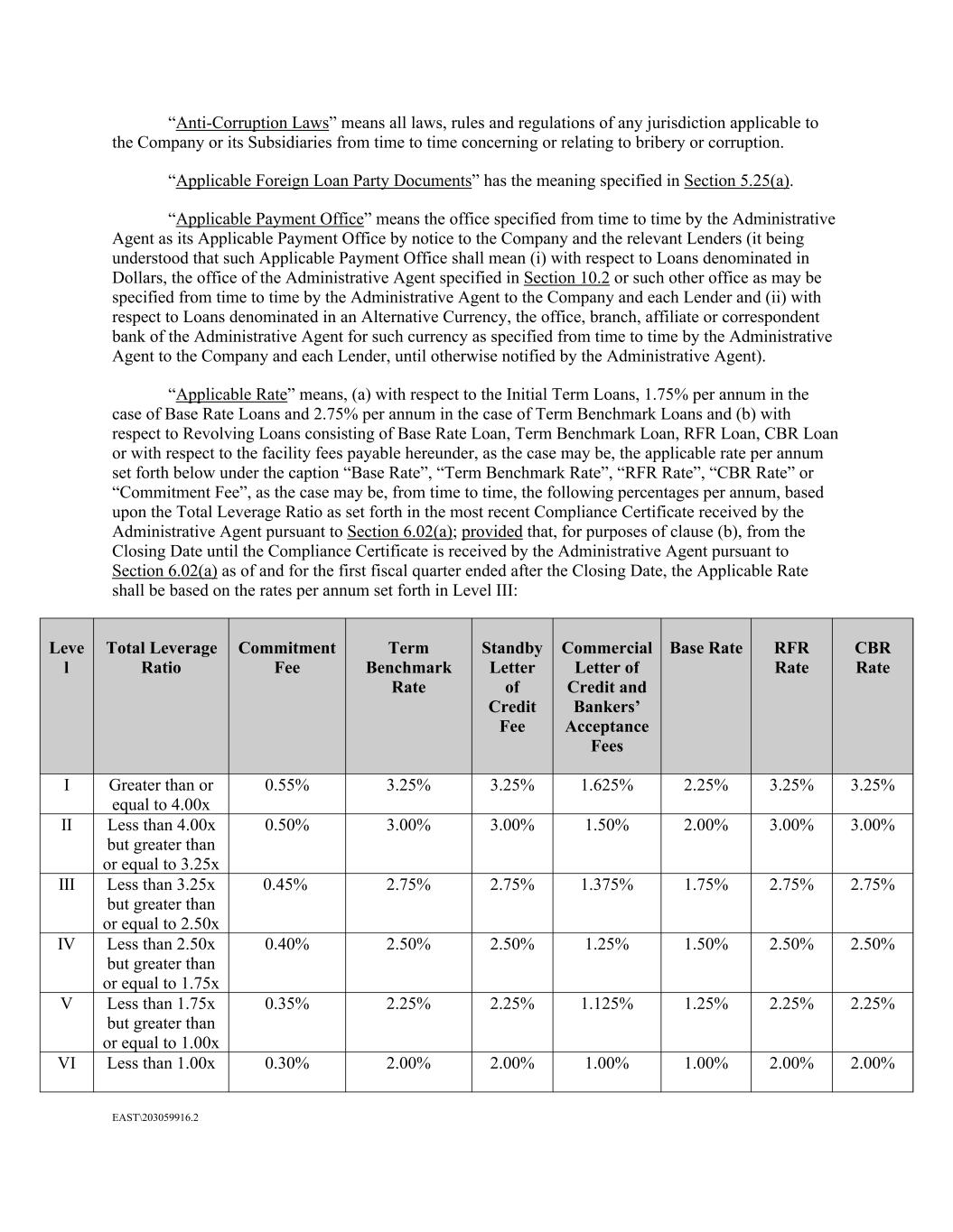 EAST\203059916.2 2.75% Commercial Letter of Credit and Bankers’ Acceptance Fees 2.75% 1.625% 1.375% 1.75% 2.25% 2.75% Base Rate 2.75% 3.25% Total Leverage Ratio IV 3.25% Less than 2.50x but greater than or equal to 1.75x RFR Rate 0.40% 2.50% “Anti-Corruption Laws” means all laws, rules and regulations of any jurisdiction applicable to the Company or its Subsidiaries from time to time concerning or relating to bribery or corruption. “Applicable Foreign Loan Party Documents” has the meaning specified in Section 5.25(a). “Applicable Payment Office” means the office specified from time to time by the Administrative Agent as its Applicable Payment Office by notice to the Company and the relevant Lenders (it being understood that such Applicable Payment Office shall mean (i) with respect to Loans denominated in Dollars, the office of the Administrative Agent specified in Section 10.2 or such other office as may be specified from time to time by the Administrative Agent to the Company and each Lender and (ii) with respect to Loans denominated in an Alternative Currency, the office, branch, affiliate or correspondent bank of the Administrative Agent for such currency as specified from time to time by the Administrative Agent to the Company and each Lender, until otherwise notified by the Administrative Agent). “Applicable Rate” means, (a) with respect to the Initial Term Loans, 1.75% per annum in the case of Base Rate Loans and 2.75% per annum in the case of Term Benchmark Loans and (b) with respect to Revolving Loans consisting of Base Rate Loan, Term Benchmark Loan, RFR Loan, CBR Loan or with respect to the facility fees payable hereunder, as the case may be, the applicable rate per annum set forth below under the caption “Base Rate”, “Term Benchmark Rate”, “RFR Rate”, “CBR Rate” or “Commitment Fee”, as the case may be, from time to time, the following percentages per annum, based upon the Total Leverage Ratio as set forth in the most recent Compliance Certificate received by the Administrative Agent pursuant to Section 6.02(a); provided that, for purposes of clause (b), from the Closing Date until the Compliance Certificate is received by the Administrative Agent pursuant to Section 6.02(a) as of and for the first fiscal quarter ended after the Closing Date, the Applicable Rate shall be based on the rates per annum set forth in Level III: 2.50% II 1.25% CBR Rate 1.50% Less than 4.00x but greater than or equal to 3.25x 2.50% Commitment Fee 2.50% 0.50% V 3.00% Less than 1.75x but greater than or equal to 1.00x 0.35% 3.00% 2.25% I 2.25% 1.50% 1.125% Term Benchmark Rate 1.25% 2.00% 2.25% Greater than or equal to 4.00x 2.25% 3.00% VI 3.00% Less than 1.00x 0.55% 0.30% 2.00% Standby Letter of Credit Fee 2.00% III 1.00% 3.25% 1.00% Less than 3.25x but greater than or equal to 2.50x 2.00% Leve l 2.00% 0.45% 3.25%