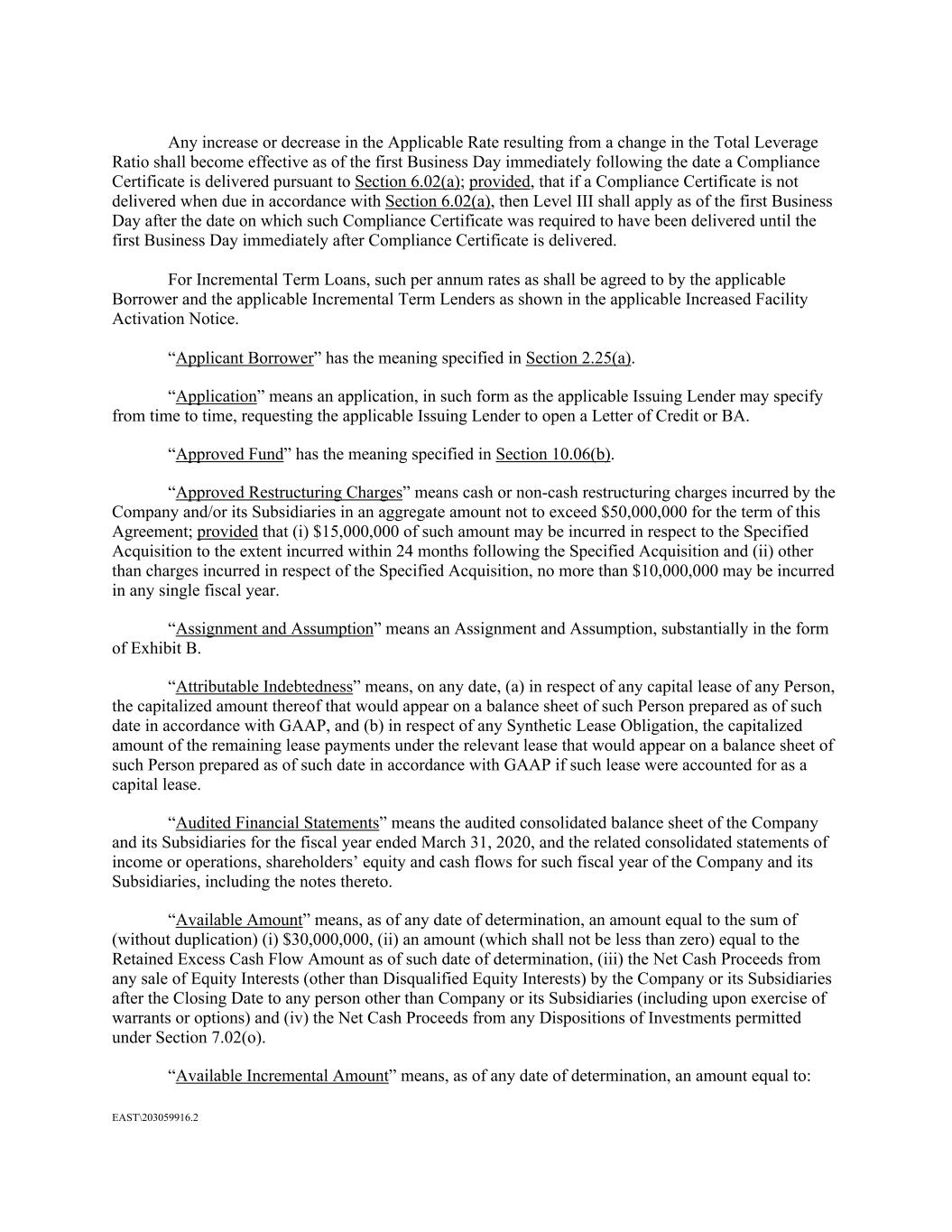 Any increase or decrease in the Applicable Rate resulting from a change in the Total Leverage Ratio shall become effective as of the first Business Day immediately following the date a Compliance Certificate is delivered pursuant to Section 6.02(a); provided, that if a Compliance Certificate is not delivered when due in accordance with Section 6.02(a), then Level III shall apply as of the first Business Day after the date on which such Compliance Certificate was required to have been delivered until the first Business Day immediately after Compliance Certificate is delivered. For Incremental Term Loans, such per annum rates as shall be agreed to by the applicable Borrower and the applicable Incremental Term Lenders as shown in the applicable Increased Facility Activation Notice. “Applicant Borrower” has the meaning specified in Section 2.25(a). “Application” means an application, in such form as the applicable Issuing Lender may specify from time to time, requesting the applicable Issuing Lender to open a Letter of Credit or BA. “Approved Fund” has the meaning specified in Section 10.06(b). “Approved Restructuring Charges” means cash or non-cash restructuring charges incurred by the Company and/or its Subsidiaries in an aggregate amount not to exceed $50,000,000 for the term of this Agreement; provided that (i) $15,000,000 of such amount may be incurred in respect to the Specified Acquisition to the extent incurred within 24 months following the Specified Acquisition and (ii) other than charges incurred in respect of the Specified Acquisition, no more than $10,000,000 may be incurred in any single fiscal year. “Assignment and Assumption” means an Assignment and Assumption, substantially in the form of Exhibit B. “Attributable Indebtedness” means, on any date, (a) in respect of any capital lease of any Person, the capitalized amount thereof that would appear on a balance sheet of such Person prepared as of such date in accordance with GAAP, and (b) in respect of any Synthetic Lease Obligation, the capitalized amount of the remaining lease payments under the relevant lease that would appear on a balance sheet of such Person prepared as of such date in accordance with GAAP if such lease were accounted for as a capital lease. “Audited Financial Statements” means the audited consolidated balance sheet of the Company and its Subsidiaries for the fiscal year ended March 31, 2020, and the related consolidated statements of income or operations, shareholders’ equity and cash flows for such fiscal year of the Company and its Subsidiaries, including the notes thereto. “Available Amount” means, as of any date of determination, an amount equal to the sum of (without duplication) (i) $30,000,000, (ii) an amount (which shall not be less than zero) equal to the Retained Excess Cash Flow Amount as of such date of determination, (iii) the Net Cash Proceeds from any sale of Equity Interests (other than Disqualified Equity Interests) by the Company or its Subsidiaries after the Closing Date to any person other than Company or its Subsidiaries (including upon exercise of warrants or options) and (iv) the Net Cash Proceeds from any Dispositions of Investments permitted under Section 7.02(o). “Available Incremental Amount” means, as of any date of determination, an amount equal to: EAST\203059916.2