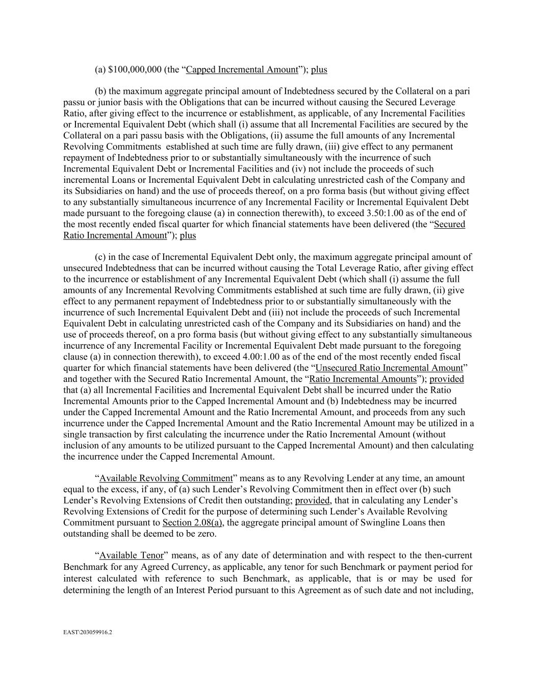 (a) $100,000,000 (the “Capped Incremental Amount”); plus (b) the maximum aggregate principal amount of Indebtedness secured by the Collateral on a pari passu or junior basis with the Obligations that can be incurred without causing the Secured Leverage Ratio, after giving effect to the incurrence or establishment, as applicable, of any Incremental Facilities or Incremental Equivalent Debt (which shall (i) assume that all Incremental Facilities are secured by the Collateral on a pari passu basis with the Obligations, (ii) assume the full amounts of any Incremental Revolving Commitments established at such time are fully drawn, (iii) give effect to any permanent repayment of Indebtedness prior to or substantially simultaneously with the incurrence of such Incremental Equivalent Debt or Incremental Facilities and (iv) not include the proceeds of such incremental Loans or Incremental Equivalent Debt in calculating unrestricted cash of the Company and its Subsidiaries on hand) and the use of proceeds thereof, on a pro forma basis (but without giving effect to any substantially simultaneous incurrence of any Incremental Facility or Incremental Equivalent Debt made pursuant to the foregoing clause (a) in connection therewith), to exceed 3.50:1.00 as of the end of the most recently ended fiscal quarter for which financial statements have been delivered (the “Secured Ratio Incremental Amount”); plus (c) in the case of Incremental Equivalent Debt only, the maximum aggregate principal amount of unsecured Indebtedness that can be incurred without causing the Total Leverage Ratio, after giving effect to the incurrence or establishment of any Incremental Equivalent Debt (which shall (i) assume the full amounts of any Incremental Revolving Commitments established at such time are fully drawn, (ii) give effect to any permanent repayment of Indebtedness prior to or substantially simultaneously with the incurrence of such Incremental Equivalent Debt and (iii) not include the proceeds of such Incremental Equivalent Debt in calculating unrestricted cash of the Company and its Subsidiaries on hand) and the use of proceeds thereof, on a pro forma basis (but without giving effect to any substantially simultaneous incurrence of any Incremental Facility or Incremental Equivalent Debt made pursuant to the foregoing clause (a) in connection therewith), to exceed 4.00:1.00 as of the end of the most recently ended fiscal quarter for which financial statements have been delivered (the “Unsecured Ratio Incremental Amount” and together with the Secured Ratio Incremental Amount, the “Ratio Incremental Amounts”); provided that (a) all Incremental Facilities and Incremental Equivalent Debt shall be incurred under the Ratio Incremental Amounts prior to the Capped Incremental Amount and (b) Indebtedness may be incurred under the Capped Incremental Amount and the Ratio Incremental Amount, and proceeds from any such incurrence under the Capped Incremental Amount and the Ratio Incremental Amount may be utilized in a single transaction by first calculating the incurrence under the Ratio Incremental Amount (without inclusion of any amounts to be utilized pursuant to the Capped Incremental Amount) and then calculating the incurrence under the Capped Incremental Amount. “Available Revolving Commitment” means as to any Revolving Lender at any time, an amount equal to the excess, if any, of (a) such Lender’s Revolving Commitment then in effect over (b) such Lender’s Revolving Extensions of Credit then outstanding; provided, that in calculating any Lender’s Revolving Extensions of Credit for the purpose of determining such Lender’s Available Revolving Commitment pursuant to Section 2.08(a), the aggregate principal amount of Swingline Loans then outstanding shall be deemed to be zero. “Available Tenor” means, as of any date of determination and with respect to the then-current Benchmark for any Agreed Currency, as applicable, any tenor for such Benchmark or payment period for interest calculated with reference to such Benchmark, as applicable, that is or may be used for determining the length of an Interest Period pursuant to this Agreement as of such date and not including, EAST\203059916.2