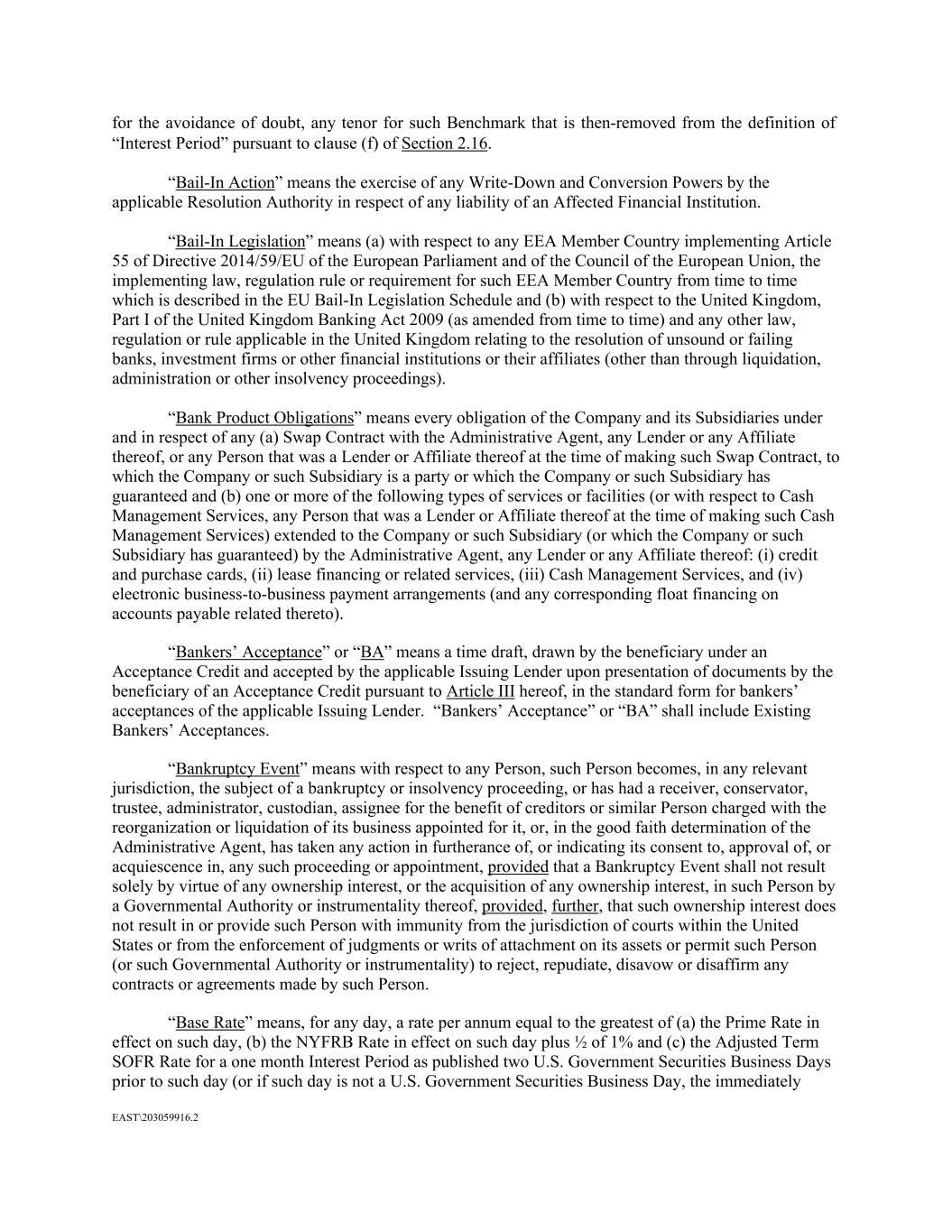 for the avoidance of doubt, any tenor for such Benchmark that is then-removed from the definition of “Interest Period” pursuant to clause (f) of Section 2.16. “Bail-In Action” means the exercise of any Write-Down and Conversion Powers by the applicable Resolution Authority in respect of any liability of an Affected Financial Institution. “Bail-In Legislation” means (a) with respect to any EEA Member Country implementing Article 55 of Directive 2014/59/EU of the European Parliament and of the Council of the European Union, the implementing law, regulation rule or requirement for such EEA Member Country from time to time which is described in the EU Bail-In Legislation Schedule and (b) with respect to the United Kingdom, Part I of the United Kingdom Banking Act 2009 (as amended from time to time) and any other law, regulation or rule applicable in the United Kingdom relating to the resolution of unsound or failing banks, investment firms or other financial institutions or their affiliates (other than through liquidation, administration or other insolvency proceedings). “Bank Product Obligations” means every obligation of the Company and its Subsidiaries under and in respect of any (a) Swap Contract with the Administrative Agent, any Lender or any Affiliate thereof, or any Person that was a Lender or Affiliate thereof at the time of making such Swap Contract, to which the Company or such Subsidiary is a party or which the Company or such Subsidiary has guaranteed and (b) one or more of the following types of services or facilities (or with respect to Cash Management Services, any Person that was a Lender or Affiliate thereof at the time of making such Cash Management Services) extended to the Company or such Subsidiary (or which the Company or such Subsidiary has guaranteed) by the Administrative Agent, any Lender or any Affiliate thereof: (i) credit and purchase cards, (ii) lease financing or related services, (iii) Cash Management Services, and (iv) electronic business-to-business payment arrangements (and any corresponding float financing on accounts payable related thereto). “Bankers’ Acceptance” or “BA” means a time draft, drawn by the beneficiary under an Acceptance Credit and accepted by the applicable Issuing Lender upon presentation of documents by the beneficiary of an Acceptance Credit pursuant to Article III hereof, in the standard form for bankers’ acceptances of the applicable Issuing Lender. “Bankers’ Acceptance” or “BA” shall include Existing Bankers’ Acceptances. “Bankruptcy Event” means with respect to any Person, such Person becomes, in any relevant jurisdiction, the subject of a bankruptcy or insolvency proceeding, or has had a receiver, conservator, trustee, administrator, custodian, assignee for the benefit of creditors or similar Person charged with the reorganization or liquidation of its business appointed for it, or, in the good faith determination of the Administrative Agent, has taken any action in furtherance of, or indicating its consent to, approval of, or acquiescence in, any such proceeding or appointment, provided that a Bankruptcy Event shall not result solely by virtue of any ownership interest, or the acquisition of any ownership interest, in such Person by a Governmental Authority or instrumentality thereof, provided, further, that such ownership interest does not result in or provide such Person with immunity from the jurisdiction of courts within the United States or from the enforcement of judgments or writs of attachment on its assets or permit such Person (or such Governmental Authority or instrumentality) to reject, repudiate, disavow or disaffirm any contracts or agreements made by such Person. “Base Rate” means, for any day, a rate per annum equal to the greatest of (a) the Prime Rate in effect on such day, (b) the NYFRB Rate in effect on such day plus ½ of 1% and (c) the Adjusted Term SOFR Rate for a one month Interest Period as published two U.S. Government Securities Business Days prior to such day (or if such day is not a U.S. Government Securities Business Day, the immediately EAST\203059916.2