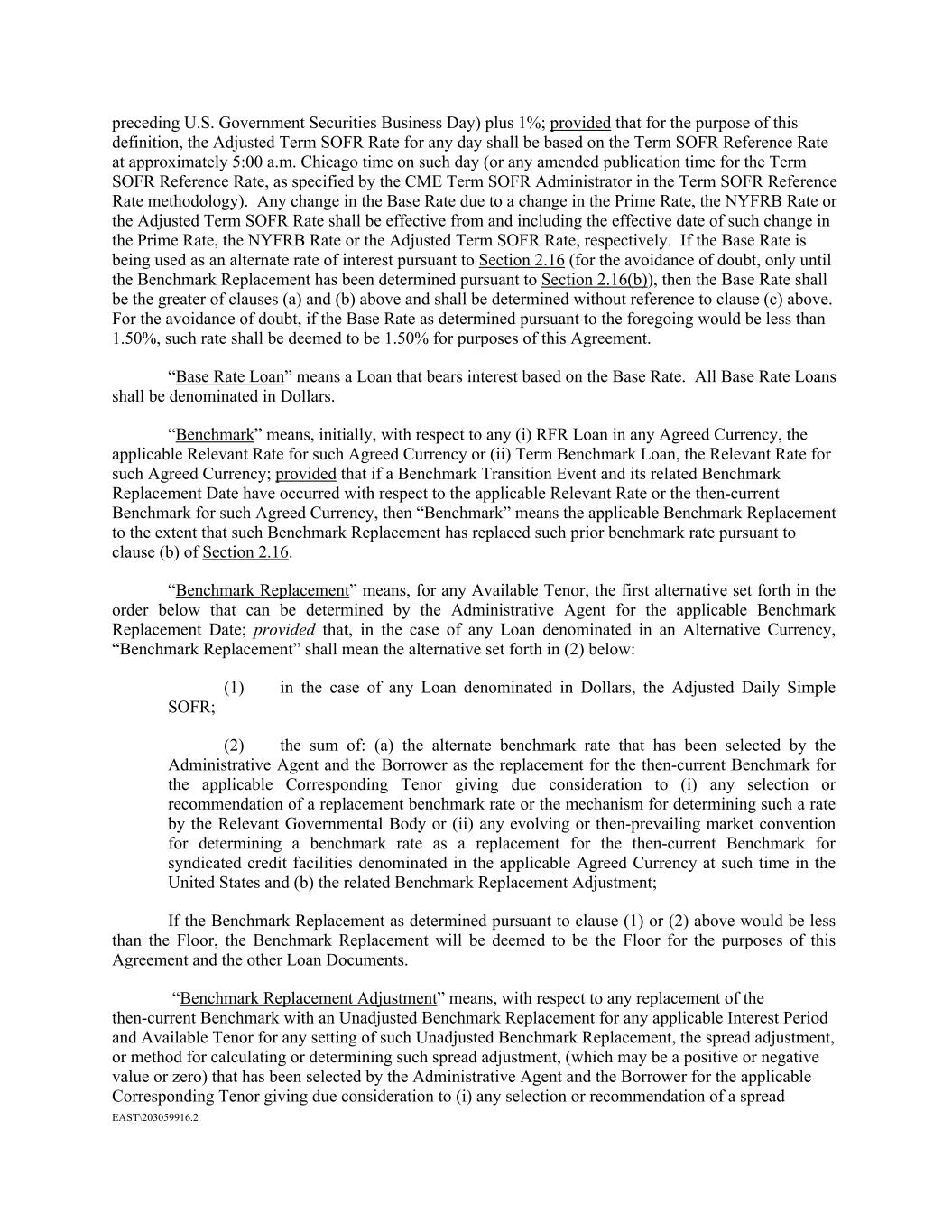 preceding U.S. Government Securities Business Day) plus 1%; provided that for the purpose of this definition, the Adjusted Term SOFR Rate for any day shall be based on the Term SOFR Reference Rate at approximately 5:00 a.m. Chicago time on such day (or any amended publication time for the Term SOFR Reference Rate, as specified by the CME Term SOFR Administrator in the Term SOFR Reference Rate methodology). Any change in the Base Rate due to a change in the Prime Rate, the NYFRB Rate or the Adjusted Term SOFR Rate shall be effective from and including the effective date of such change in the Prime Rate, the NYFRB Rate or the Adjusted Term SOFR Rate, respectively. If the Base Rate is being used as an alternate rate of interest pursuant to Section 2.16 (for the avoidance of doubt, only until the Benchmark Replacement has been determined pursuant to Section 2.16(b)), then the Base Rate shall be the greater of clauses (a) and (b) above and shall be determined without reference to clause (c) above. For the avoidance of doubt, if the Base Rate as determined pursuant to the foregoing would be less than 1.50%, such rate shall be deemed to be 1.50% for purposes of this Agreement. “Base Rate Loan” means a Loan that bears interest based on the Base Rate. All Base Rate Loans shall be denominated in Dollars. “Benchmark” means, initially, with respect to any (i) RFR Loan in any Agreed Currency, the applicable Relevant Rate for such Agreed Currency or (ii) Term Benchmark Loan, the Relevant Rate for such Agreed Currency; provided that if a Benchmark Transition Event and its related Benchmark Replacement Date have occurred with respect to the applicable Relevant Rate or the then-current Benchmark for such Agreed Currency, then “Benchmark” means the applicable Benchmark Replacement to the extent that such Benchmark Replacement has replaced such prior benchmark rate pursuant to clause (b) of Section 2.16. “Benchmark Replacement” means, for any Available Tenor, the first alternative set forth in the order below that can be determined by the Administrative Agent for the applicable Benchmark Replacement Date; provided that, in the case of any Loan denominated in an Alternative Currency, “Benchmark Replacement” shall mean the alternative set forth in (2) below: (1) in the case of any Loan denominated in Dollars, the Adjusted Daily Simple SOFR; (2) the sum of: (a) the alternate benchmark rate that has been selected by the Administrative Agent and the Borrower as the replacement for the then-current Benchmark for the applicable Corresponding Tenor giving due consideration to (i) any selection or recommendation of a replacement benchmark rate or the mechanism for determining such a rate by the Relevant Governmental Body or (ii) any evolving or then-prevailing market convention for determining a benchmark rate as a replacement for the then-current Benchmark for syndicated credit facilities denominated in the applicable Agreed Currency at such time in the United States and (b) the related Benchmark Replacement Adjustment; If the Benchmark Replacement as determined pursuant to clause (1) or (2) above would be less than the Floor, the Benchmark Replacement will be deemed to be the Floor for the purposes of this Agreement and the other Loan Documents. “Benchmark Replacement Adjustment” means, with respect to any replacement of the then-current Benchmark with an Unadjusted Benchmark Replacement for any applicable Interest Period and Available Tenor for any setting of such Unadjusted Benchmark Replacement, the spread adjustment, or method for calculating or determining such spread adjustment, (which may be a positive or negative value or zero) that has been selected by the Administrative Agent and the Borrower for the applicable Corresponding Tenor giving due consideration to (i) any selection or recommendation of a spread EAST\203059916.2