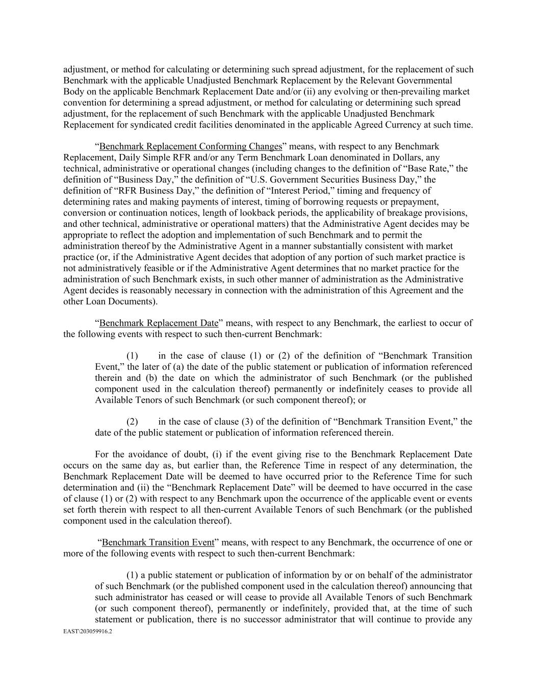 adjustment, or method for calculating or determining such spread adjustment, for the replacement of such Benchmark with the applicable Unadjusted Benchmark Replacement by the Relevant Governmental Body on the applicable Benchmark Replacement Date and/or (ii) any evolving or then-prevailing market convention for determining a spread adjustment, or method for calculating or determining such spread adjustment, for the replacement of such Benchmark with the applicable Unadjusted Benchmark Replacement for syndicated credit facilities denominated in the applicable Agreed Currency at such time. “Benchmark Replacement Conforming Changes” means, with respect to any Benchmark Replacement, Daily Simple RFR and/or any Term Benchmark Loan denominated in Dollars, any technical, administrative or operational changes (including changes to the definition of “Base Rate,” the definition of “Business Day,” the definition of “U.S. Government Securities Business Day,” the definition of “RFR Business Day,” the definition of “Interest Period,” timing and frequency of determining rates and making payments of interest, timing of borrowing requests or prepayment, conversion or continuation notices, length of lookback periods, the applicability of breakage provisions, and other technical, administrative or operational matters) that the Administrative Agent decides may be appropriate to reflect the adoption and implementation of such Benchmark and to permit the administration thereof by the Administrative Agent in a manner substantially consistent with market practice (or, if the Administrative Agent decides that adoption of any portion of such market practice is not administratively feasible or if the Administrative Agent determines that no market practice for the administration of such Benchmark exists, in such other manner of administration as the Administrative Agent decides is reasonably necessary in connection with the administration of this Agreement and the other Loan Documents). “Benchmark Replacement Date” means, with respect to any Benchmark, the earliest to occur of the following events with respect to such then-current Benchmark: (1) in the case of clause (1) or (2) of the definition of “Benchmark Transition Event,” the later of (a) the date of the public statement or publication of information referenced therein and (b) the date on which the administrator of such Benchmark (or the published component used in the calculation thereof) permanently or indefinitely ceases to provide all Available Tenors of such Benchmark (or such component thereof); or (2) in the case of clause (3) of the definition of “Benchmark Transition Event,” the date of the public statement or publication of information referenced therein. For the avoidance of doubt, (i) if the event giving rise to the Benchmark Replacement Date occurs on the same day as, but earlier than, the Reference Time in respect of any determination, the Benchmark Replacement Date will be deemed to have occurred prior to the Reference Time for such determination and (ii) the “Benchmark Replacement Date” will be deemed to have occurred in the case of clause (1) or (2) with respect to any Benchmark upon the occurrence of the applicable event or events set forth therein with respect to all then-current Available Tenors of such Benchmark (or the published component used in the calculation thereof). “Benchmark Transition Event” means, with respect to any Benchmark, the occurrence of one or more of the following events with respect to such then-current Benchmark: (1) a public statement or publication of information by or on behalf of the administrator of such Benchmark (or the published component used in the calculation thereof) announcing that such administrator has ceased or will cease to provide all Available Tenors of such Benchmark (or such component thereof), permanently or indefinitely, provided that, at the time of such statement or publication, there is no successor administrator that will continue to provide any EAST\203059916.2