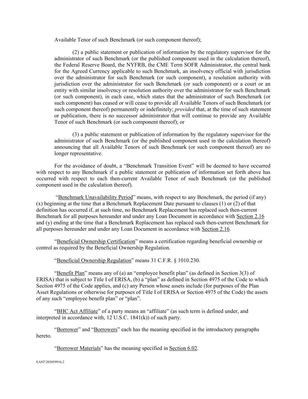 Available Tenor of such Benchmark (or such component thereof); (2) a public statement or publication of information by the regulatory supervisor for the administrator of such Benchmark (or the published component used in the calculation thereof), the Federal Reserve Board, the NYFRB, the CME Term SOFR Administrator, the central bank for the Agreed Currency applicable to such Benchmark, an insolvency official with jurisdiction over the administrator for such Benchmark (or such component), a resolution authority with jurisdiction over the administrator for such Benchmark (or such component) or a court or an entity with similar insolvency or resolution authority over the administrator for such Benchmark (or such component), in each case, which states that the administrator of such Benchmark (or such component) has ceased or will cease to provide all Available Tenors of such Benchmark (or such component thereof) permanently or indefinitely; provided that, at the time of such statement or publication, there is no successor administrator that will continue to provide any Available Tenor of such Benchmark (or such component thereof); or (3) a public statement or publication of information by the regulatory supervisor for the administrator of such Benchmark (or the published component used in the calculation thereof) announcing that all Available Tenors of such Benchmark (or such component thereof) are no longer representative. For the avoidance of doubt, a “Benchmark Transition Event” will be deemed to have occurred with respect to any Benchmark if a public statement or publication of information set forth above has occurred with respect to each then-current Available Tenor of such Benchmark (or the published component used in the calculation thereof). “Benchmark Unavailability Period” means, with respect to any Benchmark, the period (if any) (x) beginning at the time that a Benchmark Replacement Date pursuant to clauses (1) or (2) of that definition has occurred if, at such time, no Benchmark Replacement has replaced such then-current Benchmark for all purposes hereunder and under any Loan Document in accordance with Section 2.16 and (y) ending at the time that a Benchmark Replacement has replaced such then-current Benchmark for all purposes hereunder and under any Loan Document in accordance with Section 2.16. “Beneficial Ownership Certification” means a certification regarding beneficial ownership or control as required by the Beneficial Ownership Regulation. “Beneficial Ownership Regulation” means 31 C.F.R. § 1010.230. “Benefit Plan” means any of (a) an “employee benefit plan” (as defined in Section 3(3) of ERISA) that is subject to Title I of ERISA, (b) a “plan” as defined in Section 4975 of the Code to which Section 4975 of the Code applies, and (c) any Person whose assets include (for purposes of the Plan Asset Regulations or otherwise for purposes of Title I of ERISA or Section 4975 of the Code) the assets of any such “employee benefit plan” or “plan”. “BHC Act Affiliate” of a party means an “affiliate” (as such term is defined under, and interpreted in accordance with, 12 U.S.C. 1841(k)) of such party. “Borrower” and “Borrowers” each has the meaning specified in the introductory paragraphs hereto. “Borrower Materials” has the meaning specified in Section 6.02. EAST\203059916.2