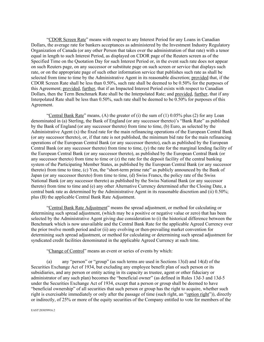 “CDOR Screen Rate” means with respect to any Interest Period for any Loans in Canadian Dollars, the average rate for bankers acceptances as administered by the Investment Industry Regulatory Organization of Canada (or any other Person that takes over the administration of that rate) with a tenor equal in length to such Interest Period, as displayed on CDOR page of the Reuters screen as of the Specified Time on the Quotation Day for such Interest Period or, in the event such rate does not appear on such Reuters page, on any successor or substitute page on such screen or service that displays such rate, or on the appropriate page of such other information service that publishes such rate as shall be selected from time to time by the Administrative Agent in its reasonable discretion; provided that, if the CDOR Screen Rate shall be less than 0.50%, such rate shall be deemed to be 0.50% for the purposes of this Agreement; provided, further, that if an Impacted Interest Period exists with respect to Canadian Dollars, then the Term Benchmark Rate shall be the Interpolated Rate; and provided, further, that if any Interpolated Rate shall be less than 0.50%, such rate shall be deemed to be 0.50% for purposes of this Agreement. “Central Bank Rate” means, (A) the greater of (i) the sum of (1) 0.05% plus (2) for any Loan denominated in (a) Sterling, the Bank of England (or any successor thereto)’s “Bank Rate” as published by the Bank of England (or any successor thereto) from time to time, (b) Euro, as selected by the Administrative Agent (x) the fixed rate for the main refinancing operations of the European Central Bank (or any successor thereto), or, if that rate is not published, the minimum bid rate for the main refinancing operations of the European Central Bank (or any successor thereto), each as published by the European Central Bank (or any successor thereto) from time to time, (y) the rate for the marginal lending facility of the European Central Bank (or any successor thereto), as published by the European Central Bank (or any successor thereto) from time to time or (z) the rate for the deposit facility of the central banking system of the Participating Member States, as published by the European Central Bank (or any successor thereto) from time to time, (c) Yen, the “short-term prime rate” as publicly announced by the Bank of Japan (or any successor thereto) from time to time, (d) Swiss Francs, the policy rate of the Swiss National Bank (or any successor thereto) as published by the Swiss National Bank (or any successor thereto) from time to time and (e) any other Alternative Currency determined after the Closing Date, a central bank rate as determined by the Administrative Agent in its reasonable discretion and (ii) 0.50%; plus (B) the applicable Central Bank Rate Adjustment. “Central Bank Rate Adjustment” means the spread adjustment, or method for calculating or determining such spread adjustment, (which may be a positive or negative value or zero) that has been selected by the Administrative Agent giving due consideration to (i) the historical difference between the Benchmark which is now unavailable and the Central Bank Rate for the applicable Agreed Currency over the prior twelve month period and/or (ii) any evolving or then-prevailing market convention for determining such spread adjustment, or method for calculating or determining such spread adjustment for syndicated credit facilities denominated in the applicable Agreed Currency at such time. “Change of Control” means an event or series of events by which: (a) any “person” or “group” (as such terms are used in Sections 13(d) and 14(d) of the Securities Exchange Act of 1934, but excluding any employee benefit plan of such person or its subsidiaries, and any person or entity acting in its capacity as trustee, agent or other fiduciary or administrator of any such plan) becomes the “beneficial owner” (as defined in Rules 13d-3 and 13d-5 under the Securities Exchange Act of 1934, except that a person or group shall be deemed to have “beneficial ownership” of all securities that such person or group has the right to acquire, whether such right is exercisable immediately or only after the passage of time (such right, an “option right”)), directly or indirectly, of 25% or more of the equity securities of the Company entitled to vote for members of the EAST\203059916.2