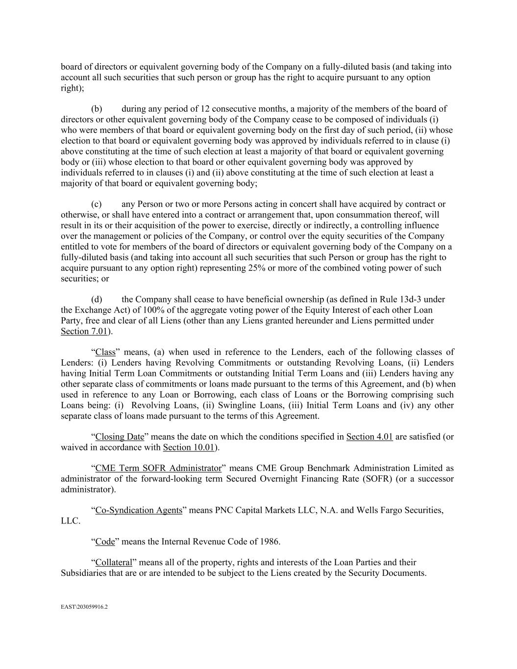 board of directors or equivalent governing body of the Company on a fully-diluted basis (and taking into account all such securities that such person or group has the right to acquire pursuant to any option right); (b) during any period of 12 consecutive months, a majority of the members of the board of directors or other equivalent governing body of the Company cease to be composed of individuals (i) who were members of that board or equivalent governing body on the first day of such period, (ii) whose election to that board or equivalent governing body was approved by individuals referred to in clause (i) above constituting at the time of such election at least a majority of that board or equivalent governing body or (iii) whose election to that board or other equivalent governing body was approved by individuals referred to in clauses (i) and (ii) above constituting at the time of such election at least a majority of that board or equivalent governing body; (c) any Person or two or more Persons acting in concert shall have acquired by contract or otherwise, or shall have entered into a contract or arrangement that, upon consummation thereof, will result in its or their acquisition of the power to exercise, directly or indirectly, a controlling influence over the management or policies of the Company, or control over the equity securities of the Company entitled to vote for members of the board of directors or equivalent governing body of the Company on a fully-diluted basis (and taking into account all such securities that such Person or group has the right to acquire pursuant to any option right) representing 25% or more of the combined voting power of such securities; or (d) the Company shall cease to have beneficial ownership (as defined in Rule 13d-3 under the Exchange Act) of 100% of the aggregate voting power of the Equity Interest of each other Loan Party, free and clear of all Liens (other than any Liens granted hereunder and Liens permitted under Section 7.01). “Class” means, (a) when used in reference to the Lenders, each of the following classes of Lenders: (i) Lenders having Revolving Commitments or outstanding Revolving Loans, (ii) Lenders having Initial Term Loan Commitments or outstanding Initial Term Loans and (iii) Lenders having any other separate class of commitments or loans made pursuant to the terms of this Agreement, and (b) when used in reference to any Loan or Borrowing, each class of Loans or the Borrowing comprising such Loans being: (i) Revolving Loans, (ii) Swingline Loans, (iii) Initial Term Loans and (iv) any other separate class of loans made pursuant to the terms of this Agreement. “Closing Date” means the date on which the conditions specified in Section 4.01 are satisfied (or waived in accordance with Section 10.01). “CME Term SOFR Administrator” means CME Group Benchmark Administration Limited as administrator of the forward-looking term Secured Overnight Financing Rate (SOFR) (or a successor administrator). “Co-Syndication Agents” means PNC Capital Markets LLC, N.A. and Wells Fargo Securities, LLC. “Code” means the Internal Revenue Code of 1986. “Collateral” means all of the property, rights and interests of the Loan Parties and their Subsidiaries that are or are intended to be subject to the Liens created by the Security Documents. EAST\203059916.2