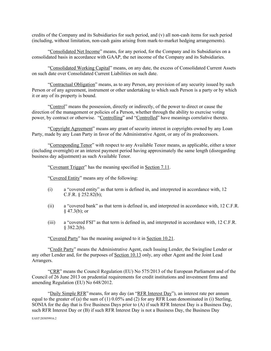 credits of the Company and its Subsidiaries for such period, and (v) all non-cash items for such period (including, without limitation, non-cash gains arising from mark-to-market hedging arrangements). “Consolidated Net Income” means, for any period, for the Company and its Subsidiaries on a consolidated basis in accordance with GAAP, the net income of the Company and its Subsidiaries. “Consolidated Working Capital” means, on any date, the excess of Consolidated Current Assets on such date over Consolidated Current Liabilities on such date. “Contractual Obligation” means, as to any Person, any provision of any security issued by such Person or of any agreement, instrument or other undertaking to which such Person is a party or by which it or any of its property is bound. “Control” means the possession, directly or indirectly, of the power to direct or cause the direction of the management or policies of a Person, whether through the ability to exercise voting power, by contract or otherwise. “Controlling” and “Controlled” have meanings correlative thereto. “Copyright Agreement” means any grant of security interest in copyrights owned by any Loan Party, made by any Loan Party in favor of the Administrative Agent, or any of its predecessors. “Corresponding Tenor” with respect to any Available Tenor means, as applicable, either a tenor (including overnight) or an interest payment period having approximately the same length (disregarding business day adjustment) as such Available Tenor. “Covenant Trigger” has the meaning specified in Section 7.11. “Covered Entity” means any of the following: (i) a “covered entity” as that term is defined in, and interpreted in accordance with, 12 C.F.R. § 252.82(b); (ii) a “covered bank” as that term is defined in, and interpreted in accordance with, 12 C.F.R. § 47.3(b); or (iii) a “covered FSI” as that term is defined in, and interpreted in accordance with, 12 C.F.R. § 382.2(b). “Covered Party” has the meaning assigned to it in Section 10.21. “Credit Party” means the Administrative Agent, each Issuing Lender, the Swingline Lender or any other Lender and, for the purposes of Section 10.13 only, any other Agent and the Joint Lead Arrangers. “CRR” means the Council Regulation (EU) No 575/2013 of the European Parliament and of the Council of 26 June 2013 on prudential requirements for credit institutions and investment firms and amending Regulation (EU) No 648/2012. “Daily Simple RFR” means, for any day (an “RFR Interest Day”), an interest rate per annum equal to the greater of (a) the sum of (1) 0.05% and (2) for any RFR Loan denominated in (i) Sterling, SONIA for the day that is five Business Days prior to (A) if such RFR Interest Day is a Business Day, such RFR Interest Day or (B) if such RFR Interest Day is not a Business Day, the Business Day EAST\203059916.2