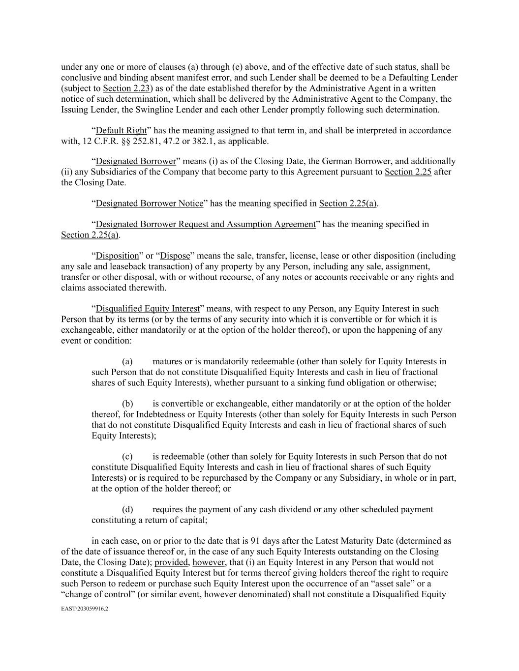 under any one or more of clauses (a) through (e) above, and of the effective date of such status, shall be conclusive and binding absent manifest error, and such Lender shall be deemed to be a Defaulting Lender (subject to Section 2.23) as of the date established therefor by the Administrative Agent in a written notice of such determination, which shall be delivered by the Administrative Agent to the Company, the Issuing Lender, the Swingline Lender and each other Lender promptly following such determination. “Default Right” has the meaning assigned to that term in, and shall be interpreted in accordance with, 12 C.F.R. §§ 252.81, 47.2 or 382.1, as applicable. “Designated Borrower” means (i) as of the Closing Date, the German Borrower, and additionally (ii) any Subsidiaries of the Company that become party to this Agreement pursuant to Section 2.25 after the Closing Date. “Designated Borrower Notice” has the meaning specified in Section 2.25(a). “Designated Borrower Request and Assumption Agreement” has the meaning specified in Section 2.25(a). “Disposition” or “Dispose” means the sale, transfer, license, lease or other disposition (including any sale and leaseback transaction) of any property by any Person, including any sale, assignment, transfer or other disposal, with or without recourse, of any notes or accounts receivable or any rights and claims associated therewith. “Disqualified Equity Interest” means, with respect to any Person, any Equity Interest in such Person that by its terms (or by the terms of any security into which it is convertible or for which it is exchangeable, either mandatorily or at the option of the holder thereof), or upon the happening of any event or condition: (a) matures or is mandatorily redeemable (other than solely for Equity Interests in such Person that do not constitute Disqualified Equity Interests and cash in lieu of fractional shares of such Equity Interests), whether pursuant to a sinking fund obligation or otherwise; (b) is convertible or exchangeable, either mandatorily or at the option of the holder thereof, for Indebtedness or Equity Interests (other than solely for Equity Interests in such Person that do not constitute Disqualified Equity Interests and cash in lieu of fractional shares of such Equity Interests); (c) is redeemable (other than solely for Equity Interests in such Person that do not constitute Disqualified Equity Interests and cash in lieu of fractional shares of such Equity Interests) or is required to be repurchased by the Company or any Subsidiary, in whole or in part, at the option of the holder thereof; or (d) requires the payment of any cash dividend or any other scheduled payment constituting a return of capital; in each case, on or prior to the date that is 91 days after the Latest Maturity Date (determined as of the date of issuance thereof or, in the case of any such Equity Interests outstanding on the Closing Date, the Closing Date); provided, however, that (i) an Equity Interest in any Person that would not constitute a Disqualified Equity Interest but for terms thereof giving holders thereof the right to require such Person to redeem or purchase such Equity Interest upon the occurrence of an “asset sale” or a “change of control” (or similar event, however denominated) shall not constitute a Disqualified Equity EAST\203059916.2