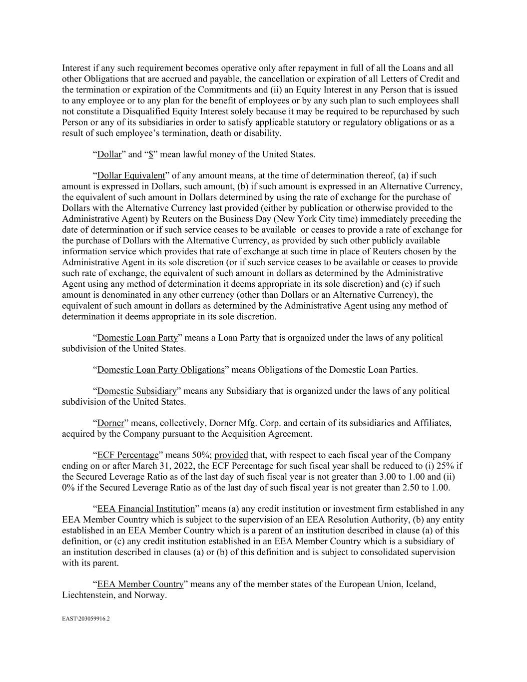 Interest if any such requirement becomes operative only after repayment in full of all the Loans and all other Obligations that are accrued and payable, the cancellation or expiration of all Letters of Credit and the termination or expiration of the Commitments and (ii) an Equity Interest in any Person that is issued to any employee or to any plan for the benefit of employees or by any such plan to such employees shall not constitute a Disqualified Equity Interest solely because it may be required to be repurchased by such Person or any of its subsidiaries in order to satisfy applicable statutory or regulatory obligations or as a result of such employee’s termination, death or disability. “Dollar” and “$” mean lawful money of the United States. “Dollar Equivalent” of any amount means, at the time of determination thereof, (a) if such amount is expressed in Dollars, such amount, (b) if such amount is expressed in an Alternative Currency, the equivalent of such amount in Dollars determined by using the rate of exchange for the purchase of Dollars with the Alternative Currency last provided (either by publication or otherwise provided to the Administrative Agent) by Reuters on the Business Day (New York City time) immediately preceding the date of determination or if such service ceases to be available or ceases to provide a rate of exchange for the purchase of Dollars with the Alternative Currency, as provided by such other publicly available information service which provides that rate of exchange at such time in place of Reuters chosen by the Administrative Agent in its sole discretion (or if such service ceases to be available or ceases to provide such rate of exchange, the equivalent of such amount in dollars as determined by the Administrative Agent using any method of determination it deems appropriate in its sole discretion) and (c) if such amount is denominated in any other currency (other than Dollars or an Alternative Currency), the equivalent of such amount in dollars as determined by the Administrative Agent using any method of determination it deems appropriate in its sole discretion. “Domestic Loan Party” means a Loan Party that is organized under the laws of any political subdivision of the United States. “Domestic Loan Party Obligations” means Obligations of the Domestic Loan Parties. “Domestic Subsidiary” means any Subsidiary that is organized under the laws of any political subdivision of the United States. “Dorner” means, collectively, Dorner Mfg. Corp. and certain of its subsidiaries and Affiliates, acquired by the Company pursuant to the Acquisition Agreement. “ECF Percentage” means 50%; provided that, with respect to each fiscal year of the Company ending on or after March 31, 2022, the ECF Percentage for such fiscal year shall be reduced to (i) 25% if the Secured Leverage Ratio as of the last day of such fiscal year is not greater than 3.00 to 1.00 and (ii) 0% if the Secured Leverage Ratio as of the last day of such fiscal year is not greater than 2.50 to 1.00. “EEA Financial Institution” means (a) any credit institution or investment firm established in any EEA Member Country which is subject to the supervision of an EEA Resolution Authority, (b) any entity established in an EEA Member Country which is a parent of an institution described in clause (a) of this definition, or (c) any credit institution established in an EEA Member Country which is a subsidiary of an institution described in clauses (a) or (b) of this definition and is subject to consolidated supervision with its parent. “EEA Member Country” means any of the member states of the European Union, Iceland, Liechtenstein, and Norway. EAST\203059916.2