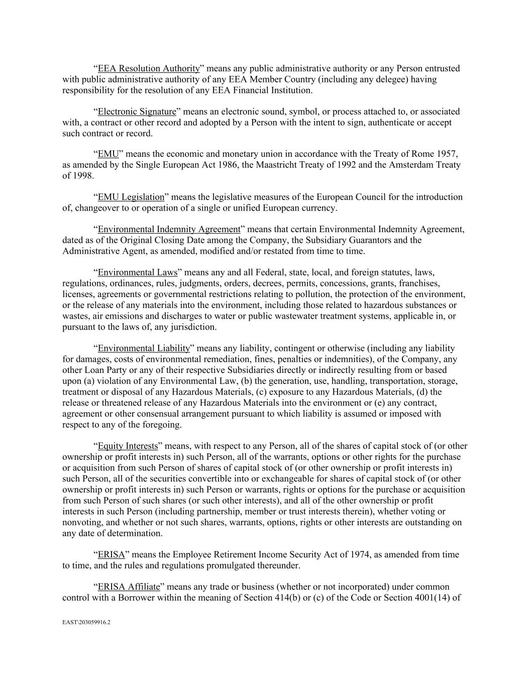 “EEA Resolution Authority” means any public administrative authority or any Person entrusted with public administrative authority of any EEA Member Country (including any delegee) having responsibility for the resolution of any EEA Financial Institution. “Electronic Signature” means an electronic sound, symbol, or process attached to, or associated with, a contract or other record and adopted by a Person with the intent to sign, authenticate or accept such contract or record. “EMU” means the economic and monetary union in accordance with the Treaty of Rome 1957, as amended by the Single European Act 1986, the Maastricht Treaty of 1992 and the Amsterdam Treaty of 1998. “EMU Legislation” means the legislative measures of the European Council for the introduction of, changeover to or operation of a single or unified European currency. “Environmental Indemnity Agreement” means that certain Environmental Indemnity Agreement, dated as of the Original Closing Date among the Company, the Subsidiary Guarantors and the Administrative Agent, as amended, modified and/or restated from time to time. “Environmental Laws” means any and all Federal, state, local, and foreign statutes, laws, regulations, ordinances, rules, judgments, orders, decrees, permits, concessions, grants, franchises, licenses, agreements or governmental restrictions relating to pollution, the protection of the environment, or the release of any materials into the environment, including those related to hazardous substances or wastes, air emissions and discharges to water or public wastewater treatment systems, applicable in, or pursuant to the laws of, any jurisdiction. “Environmental Liability” means any liability, contingent or otherwise (including any liability for damages, costs of environmental remediation, fines, penalties or indemnities), of the Company, any other Loan Party or any of their respective Subsidiaries directly or indirectly resulting from or based upon (a) violation of any Environmental Law, (b) the generation, use, handling, transportation, storage, treatment or disposal of any Hazardous Materials, (c) exposure to any Hazardous Materials, (d) the release or threatened release of any Hazardous Materials into the environment or (e) any contract, agreement or other consensual arrangement pursuant to which liability is assumed or imposed with respect to any of the foregoing. “Equity Interests” means, with respect to any Person, all of the shares of capital stock of (or other ownership or profit interests in) such Person, all of the warrants, options or other rights for the purchase or acquisition from such Person of shares of capital stock of (or other ownership or profit interests in) such Person, all of the securities convertible into or exchangeable for shares of capital stock of (or other ownership or profit interests in) such Person or warrants, rights or options for the purchase or acquisition from such Person of such shares (or such other interests), and all of the other ownership or profit interests in such Person (including partnership, member or trust interests therein), whether voting or nonvoting, and whether or not such shares, warrants, options, rights or other interests are outstanding on any date of determination. “ERISA” means the Employee Retirement Income Security Act of 1974, as amended from time to time, and the rules and regulations promulgated thereunder. “ERISA Affiliate” means any trade or business (whether or not incorporated) under common control with a Borrower within the meaning of Section 414(b) or (c) of the Code or Section 4001(14) of EAST\203059916.2