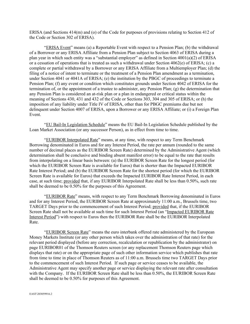 ERISA (and Sections 414(m) and (o) of the Code for purposes of provisions relating to Section 412 of the Code or Section 302 of ERISA). “ERISA Event” means (a) a Reportable Event with respect to a Pension Plan; (b) the withdrawal of a Borrower or any ERISA Affiliate from a Pension Plan subject to Section 4063 of ERISA during a plan year in which such entity was a “substantial employer” as defined in Section 4001(a)(2) of ERISA or a cessation of operations that is treated as such a withdrawal under Section 4062(e) of ERISA; (c) a complete or partial withdrawal by a Borrower or any ERISA Affiliate from a Multiemployer Plan; (d) the filing of a notice of intent to terminate or the treatment of a Pension Plan amendment as a termination, under Section 4041 or 4041A of ERISA; (e) the institution by the PBGC of proceedings to terminate a Pension Plan; (f) any event or condition which constitutes grounds under Section 4042 of ERISA for the termination of, or the appointment of a trustee to administer, any Pension Plan; (g) the determination that any Pension Plan is considered an at-risk plan or a plan in endangered or critical status within the meaning of Sections 430, 431 and 432 of the Code or Sections 303, 304 and 305 of ERISA; or (h) the imposition of any liability under Title IV of ERISA, other than for PBGC premiums due but not delinquent under Section 4007 of ERISA, upon a Borrower or any ERISA Affiliate; or (i) a Foreign Plan Event. “EU Bail-In Legislation Schedule” means the EU Bail-In Legislation Schedule published by the Loan Market Association (or any successor Person), as in effect from time to time. “EURIBOR Interpolated Rate” means, at any time, with respect to any Term Benchmark Borrowing denominated in Euros and for any Interest Period, the rate per annum (rounded to the same number of decimal places as the EURIBOR Screen Rate) determined by the Administrative Agent (which determination shall be conclusive and binding absent manifest error) to be equal to the rate that results from interpolating on a linear basis between: (a) the EURIBOR Screen Rate for the longest period (for which the EURIBOR Screen Rate is available for Euros) that is shorter than the Impacted EURIBOR Rate Interest Period; and (b) the EURIBOR Screen Rate for the shortest period (for which the EURIBOR Screen Rate is available for Euros) that exceeds the Impacted EURIBOR Rate Interest Period, in each case, at such time; provided that, if any EURIBOR Interpolated Rate shall be less than 0.50%, such rate shall be deemed to be 0.50% for the purposes of this Agreement. “EURIBOR Rate” means, with respect to any Term Benchmark Borrowing denominated in Euros and for any Interest Period, the EURIBOR Screen Rate at approximately 11:00 a.m., Brussels time, two TARGET Days prior to the commencement of such Interest Period; provided that, if the EURIBOR Screen Rate shall not be available at such time for such Interest Period (an “Impacted EURIBOR Rate Interest Period”) with respect to Euros then the EURIBOR Rate shall be the EURIBOR Interpolated Rate. “EURIBOR Screen Rate” means the euro interbank offered rate administered by the European Money Markets Institute (or any other person which takes over the administration of that rate) for the relevant period displayed (before any correction, recalculation or republication by the administrator) on page EURIBOR01 of the Thomson Reuters screen (or any replacement Thomson Reuters page which displays that rate) or on the appropriate page of such other information service which publishes that rate from time to time in place of Thomson Reuters as of 11:00 a.m. Brussels time two TARGET Days prior to the commencement of such Interest Period. If such page or service ceases to be available, the Administrative Agent may specify another page or service displaying the relevant rate after consultation with the Company. If the EURIBOR Screen Rate shall be less than 0.50%, the EURIBOR Screen Rate shall be deemed to be 0.50% for purposes of this Agreement. EAST\203059916.2