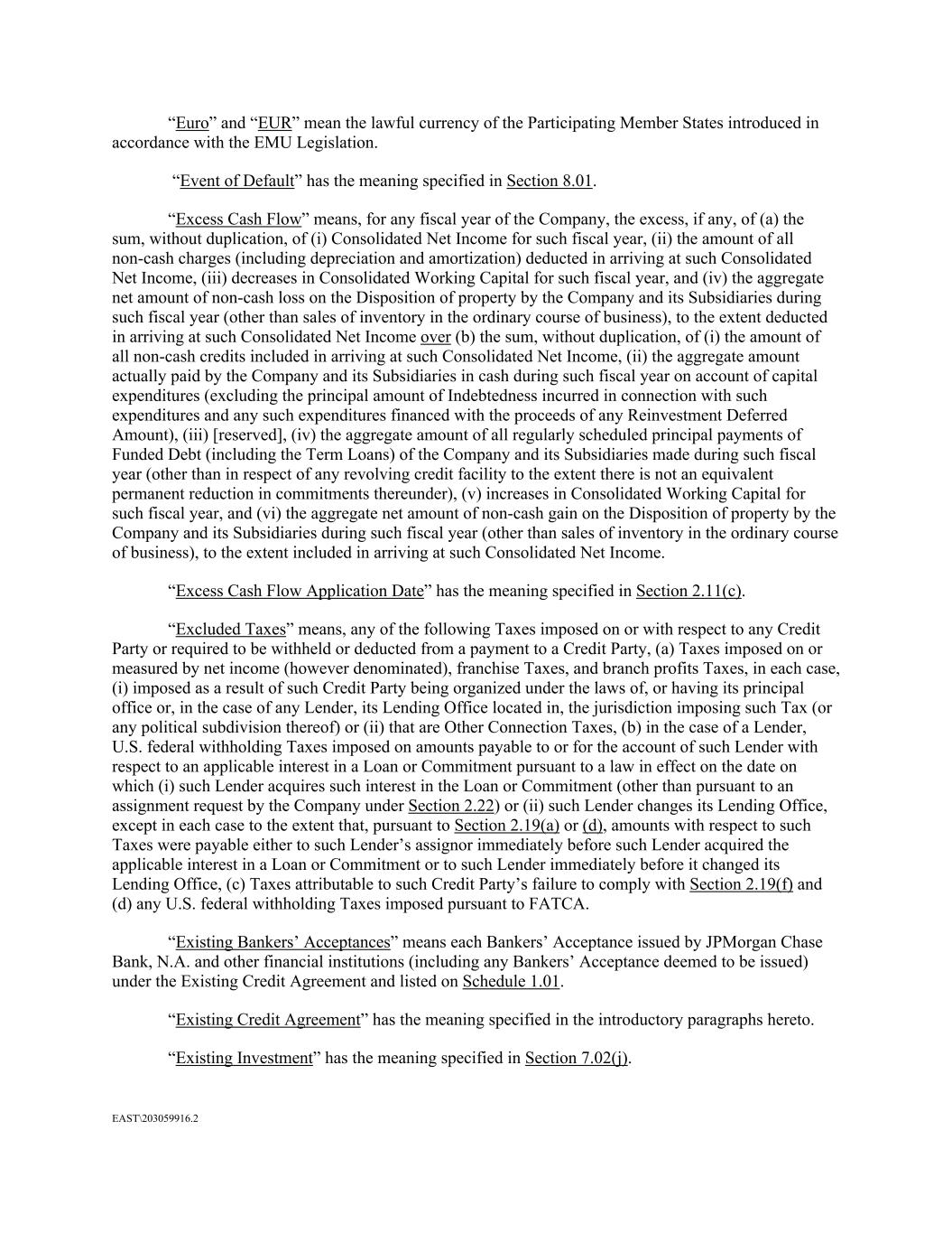 “Euro” and “EUR” mean the lawful currency of the Participating Member States introduced in accordance with the EMU Legislation. “Event of Default” has the meaning specified in Section 8.01. “Excess Cash Flow” means, for any fiscal year of the Company, the excess, if any, of (a) the sum, without duplication, of (i) Consolidated Net Income for such fiscal year, (ii) the amount of all non-cash charges (including depreciation and amortization) deducted in arriving at such Consolidated Net Income, (iii) decreases in Consolidated Working Capital for such fiscal year, and (iv) the aggregate net amount of non-cash loss on the Disposition of property by the Company and its Subsidiaries during such fiscal year (other than sales of inventory in the ordinary course of business), to the extent deducted in arriving at such Consolidated Net Income over (b) the sum, without duplication, of (i) the amount of all non-cash credits included in arriving at such Consolidated Net Income, (ii) the aggregate amount actually paid by the Company and its Subsidiaries in cash during such fiscal year on account of capital expenditures (excluding the principal amount of Indebtedness incurred in connection with such expenditures and any such expenditures financed with the proceeds of any Reinvestment Deferred Amount), (iii) [reserved], (iv) the aggregate amount of all regularly scheduled principal payments of Funded Debt (including the Term Loans) of the Company and its Subsidiaries made during such fiscal year (other than in respect of any revolving credit facility to the extent there is not an equivalent permanent reduction in commitments thereunder), (v) increases in Consolidated Working Capital for such fiscal year, and (vi) the aggregate net amount of non-cash gain on the Disposition of property by the Company and its Subsidiaries during such fiscal year (other than sales of inventory in the ordinary course of business), to the extent included in arriving at such Consolidated Net Income. “Excess Cash Flow Application Date” has the meaning specified in Section 2.11(c). “Excluded Taxes” means, any of the following Taxes imposed on or with respect to any Credit Party or required to be withheld or deducted from a payment to a Credit Party, (a) Taxes imposed on or measured by net income (however denominated), franchise Taxes, and branch profits Taxes, in each case, (i) imposed as a result of such Credit Party being organized under the laws of, or having its principal office or, in the case of any Lender, its Lending Office located in, the jurisdiction imposing such Tax (or any political subdivision thereof) or (ii) that are Other Connection Taxes, (b) in the case of a Lender, U.S. federal withholding Taxes imposed on amounts payable to or for the account of such Lender with respect to an applicable interest in a Loan or Commitment pursuant to a law in effect on the date on which (i) such Lender acquires such interest in the Loan or Commitment (other than pursuant to an assignment request by the Company under Section 2.22) or (ii) such Lender changes its Lending Office, except in each case to the extent that, pursuant to Section 2.19(a) or (d), amounts with respect to such Taxes were payable either to such Lender’s assignor immediately before such Lender acquired the applicable interest in a Loan or Commitment or to such Lender immediately before it changed its Lending Office, (c) Taxes attributable to such Credit Party’s failure to comply with Section 2.19(f) and (d) any U.S. federal withholding Taxes imposed pursuant to FATCA. “Existing Bankers’ Acceptances” means each Bankers’ Acceptance issued by JPMorgan Chase Bank, N.A. and other financial institutions (including any Bankers’ Acceptance deemed to be issued) under the Existing Credit Agreement and listed on Schedule 1.01. “Existing Credit Agreement” has the meaning specified in the introductory paragraphs hereto. “Existing Investment” has the meaning specified in Section 7.02(j). EAST\203059916.2