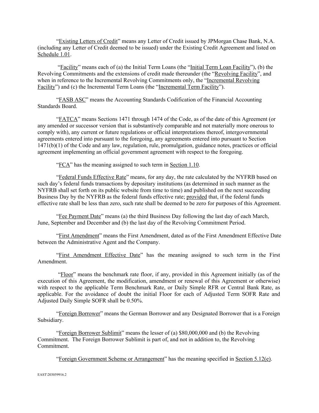 “Existing Letters of Credit” means any Letter of Credit issued by JPMorgan Chase Bank, N.A. (including any Letter of Credit deemed to be issued) under the Existing Credit Agreement and listed on Schedule 1.01. “Facility” means each of (a) the Initial Term Loans (the “Initial Term Loan Facility”), (b) the Revolving Commitments and the extensions of credit made thereunder (the “Revolving Facility”, and when in reference to the Incremental Revolving Commitments only, the “Incremental Revolving Facility”) and (c) the Incremental Term Loans (the “Incremental Term Facility”). “FASB ASC” means the Accounting Standards Codification of the Financial Accounting Standards Board. “FATCA” means Sections 1471 through 1474 of the Code, as of the date of this Agreement (or any amended or successor version that is substantively comparable and not materially more onerous to comply with), any current or future regulations or official interpretations thereof, intergovernmental agreements entered into pursuant to the foregoing, any agreements entered into pursuant to Section 1471(b)(1) of the Code and any law, regulation, rule, promulgation, guidance notes, practices or official agreement implementing an official government agreement with respect to the foregoing. “FCA” has the meaning assigned to such term in Section 1.10. “Federal Funds Effective Rate” means, for any day, the rate calculated by the NYFRB based on such day’s federal funds transactions by depositary institutions (as determined in such manner as the NYFRB shall set forth on its public website from time to time) and published on the next succeeding Business Day by the NYFRB as the federal funds effective rate; provided that, if the federal funds effective rate shall be less than zero, such rate shall be deemed to be zero for purposes of this Agreement. “Fee Payment Date” means (a) the third Business Day following the last day of each March, June, September and December and (b) the last day of the Revolving Commitment Period. “First Amendment” means the First Amendment, dated as of the First Amendment Effective Date between the Administrative Agent and the Company. “First Amendment Effective Date” has the meaning assigned to such term in the First Amendment. “Floor” means the benchmark rate floor, if any, provided in this Agreement initially (as of the execution of this Agreement, the modification, amendment or renewal of this Agreement or otherwise) with respect to the applicable Term Benchmark Rate, or Daily Simple RFR or Central Bank Rate, as applicable. For the avoidance of doubt the initial Floor for each of Adjusted Term SOFR Rate and Adjusted Daily Simple SOFR shall be 0.50%. “Foreign Borrower” means the German Borrower and any Designated Borrower that is a Foreign Subsidiary. “Foreign Borrower Sublimit” means the lesser of (a) $80,000,000 and (b) the Revolving Commitment. The Foreign Borrower Sublimit is part of, and not in addition to, the Revolving Commitment. “Foreign Government Scheme or Arrangement” has the meaning specified in Section 5.12(e). EAST\203059916.2