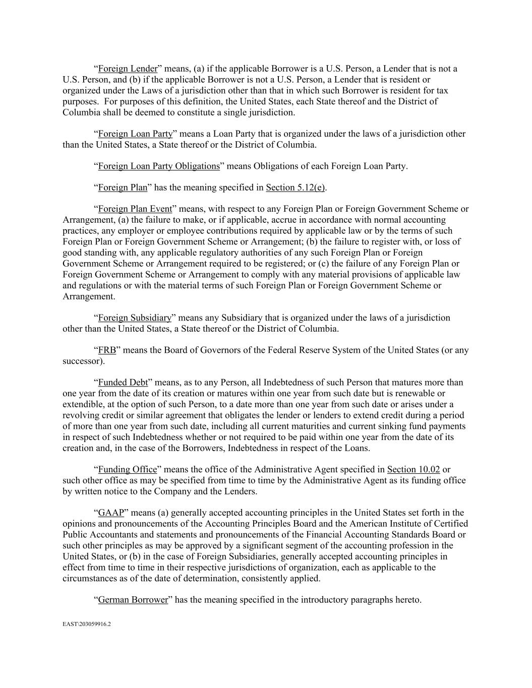 “Foreign Lender” means, (a) if the applicable Borrower is a U.S. Person, a Lender that is not a U.S. Person, and (b) if the applicable Borrower is not a U.S. Person, a Lender that is resident or organized under the Laws of a jurisdiction other than that in which such Borrower is resident for tax purposes. For purposes of this definition, the United States, each State thereof and the District of Columbia shall be deemed to constitute a single jurisdiction. “Foreign Loan Party” means a Loan Party that is organized under the laws of a jurisdiction other than the United States, a State thereof or the District of Columbia. “Foreign Loan Party Obligations” means Obligations of each Foreign Loan Party. “Foreign Plan” has the meaning specified in Section 5.12(e). “Foreign Plan Event” means, with respect to any Foreign Plan or Foreign Government Scheme or Arrangement, (a) the failure to make, or if applicable, accrue in accordance with normal accounting practices, any employer or employee contributions required by applicable law or by the terms of such Foreign Plan or Foreign Government Scheme or Arrangement; (b) the failure to register with, or loss of good standing with, any applicable regulatory authorities of any such Foreign Plan or Foreign Government Scheme or Arrangement required to be registered; or (c) the failure of any Foreign Plan or Foreign Government Scheme or Arrangement to comply with any material provisions of applicable law and regulations or with the material terms of such Foreign Plan or Foreign Government Scheme or Arrangement. “Foreign Subsidiary” means any Subsidiary that is organized under the laws of a jurisdiction other than the United States, a State thereof or the District of Columbia. “FRB” means the Board of Governors of the Federal Reserve System of the United States (or any successor). “Funded Debt” means, as to any Person, all Indebtedness of such Person that matures more than one year from the date of its creation or matures within one year from such date but is renewable or extendible, at the option of such Person, to a date more than one year from such date or arises under a revolving credit or similar agreement that obligates the lender or lenders to extend credit during a period of more than one year from such date, including all current maturities and current sinking fund payments in respect of such Indebtedness whether or not required to be paid within one year from the date of its creation and, in the case of the Borrowers, Indebtedness in respect of the Loans. “Funding Office” means the office of the Administrative Agent specified in Section 10.02 or such other office as may be specified from time to time by the Administrative Agent as its funding office by written notice to the Company and the Lenders. “GAAP” means (a) generally accepted accounting principles in the United States set forth in the opinions and pronouncements of the Accounting Principles Board and the American Institute of Certified Public Accountants and statements and pronouncements of the Financial Accounting Standards Board or such other principles as may be approved by a significant segment of the accounting profession in the United States, or (b) in the case of Foreign Subsidiaries, generally accepted accounting principles in effect from time to time in their respective jurisdictions of organization, each as applicable to the circumstances as of the date of determination, consistently applied. “German Borrower” has the meaning specified in the introductory paragraphs hereto. EAST\203059916.2