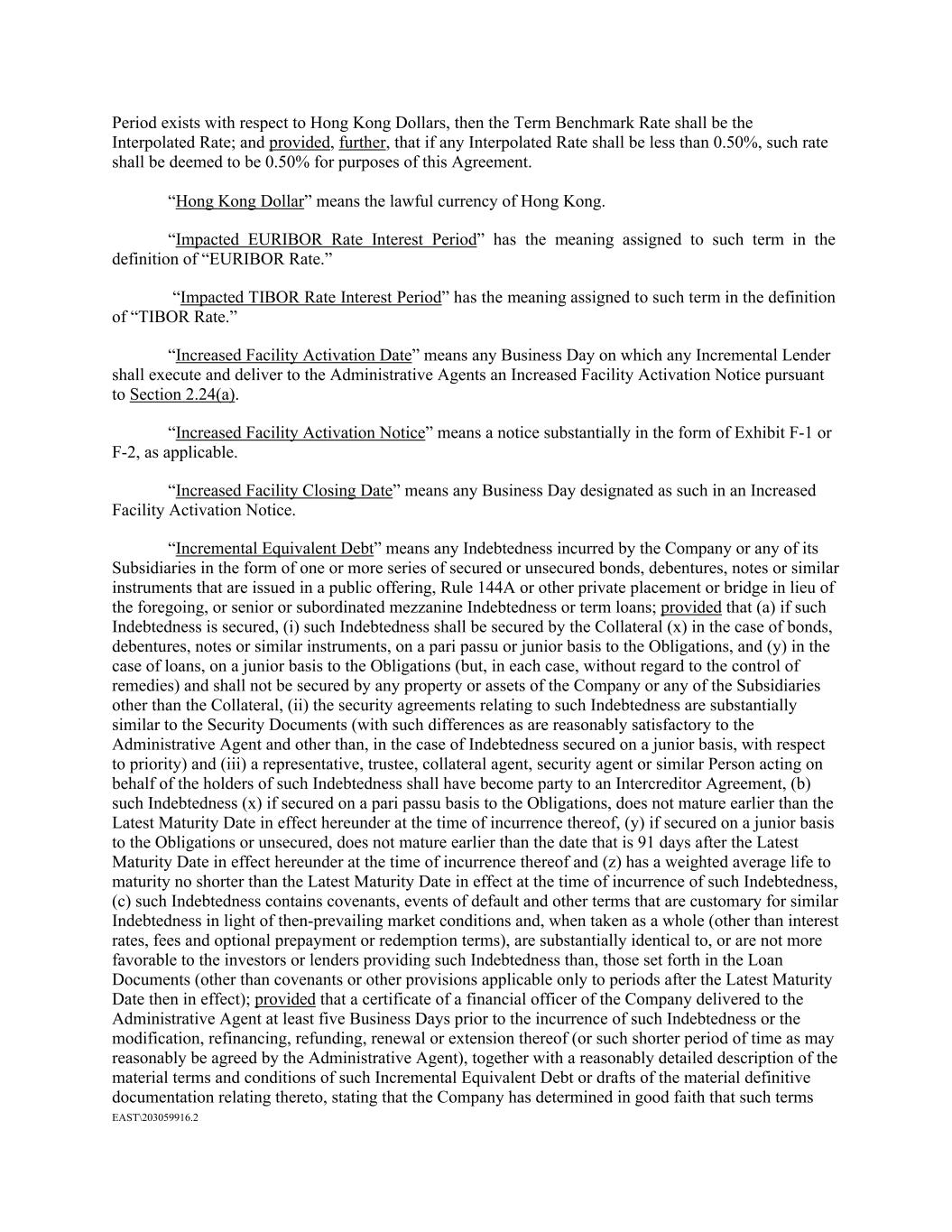 Period exists with respect to Hong Kong Dollars, then the Term Benchmark Rate shall be the Interpolated Rate; and provided, further, that if any Interpolated Rate shall be less than 0.50%, such rate shall be deemed to be 0.50% for purposes of this Agreement. “Hong Kong Dollar” means the lawful currency of Hong Kong. “Impacted EURIBOR Rate Interest Period” has the meaning assigned to such term in the definition of “EURIBOR Rate.” “Impacted TIBOR Rate Interest Period” has the meaning assigned to such term in the definition of “TIBOR Rate.” “Increased Facility Activation Date” means any Business Day on which any Incremental Lender shall execute and deliver to the Administrative Agents an Increased Facility Activation Notice pursuant to Section 2.24(a). “Increased Facility Activation Notice” means a notice substantially in the form of Exhibit F-1 or F-2, as applicable. “Increased Facility Closing Date” means any Business Day designated as such in an Increased Facility Activation Notice. “Incremental Equivalent Debt” means any Indebtedness incurred by the Company or any of its Subsidiaries in the form of one or more series of secured or unsecured bonds, debentures, notes or similar instruments that are issued in a public offering, Rule 144A or other private placement or bridge in lieu of the foregoing, or senior or subordinated mezzanine Indebtedness or term loans; provided that (a) if such Indebtedness is secured, (i) such Indebtedness shall be secured by the Collateral (x) in the case of bonds, debentures, notes or similar instruments, on a pari passu or junior basis to the Obligations, and (y) in the case of loans, on a junior basis to the Obligations (but, in each case, without regard to the control of remedies) and shall not be secured by any property or assets of the Company or any of the Subsidiaries other than the Collateral, (ii) the security agreements relating to such Indebtedness are substantially similar to the Security Documents (with such differences as are reasonably satisfactory to the Administrative Agent and other than, in the case of Indebtedness secured on a junior basis, with respect to priority) and (iii) a representative, trustee, collateral agent, security agent or similar Person acting on behalf of the holders of such Indebtedness shall have become party to an Intercreditor Agreement, (b) such Indebtedness (x) if secured on a pari passu basis to the Obligations, does not mature earlier than the Latest Maturity Date in effect hereunder at the time of incurrence thereof, (y) if secured on a junior basis to the Obligations or unsecured, does not mature earlier than the date that is 91 days after the Latest Maturity Date in effect hereunder at the time of incurrence thereof and (z) has a weighted average life to maturity no shorter than the Latest Maturity Date in effect at the time of incurrence of such Indebtedness, (c) such Indebtedness contains covenants, events of default and other terms that are customary for similar Indebtedness in light of then-prevailing market conditions and, when taken as a whole (other than interest rates, fees and optional prepayment or redemption terms), are substantially identical to, or are not more favorable to the investors or lenders providing such Indebtedness than, those set forth in the Loan Documents (other than covenants or other provisions applicable only to periods after the Latest Maturity Date then in effect); provided that a certificate of a financial officer of the Company delivered to the Administrative Agent at least five Business Days prior to the incurrence of such Indebtedness or the modification, refinancing, refunding, renewal or extension thereof (or such shorter period of time as may reasonably be agreed by the Administrative Agent), together with a reasonably detailed description of the material terms and conditions of such Incremental Equivalent Debt or drafts of the material definitive documentation relating thereto, stating that the Company has determined in good faith that such terms EAST\203059916.2