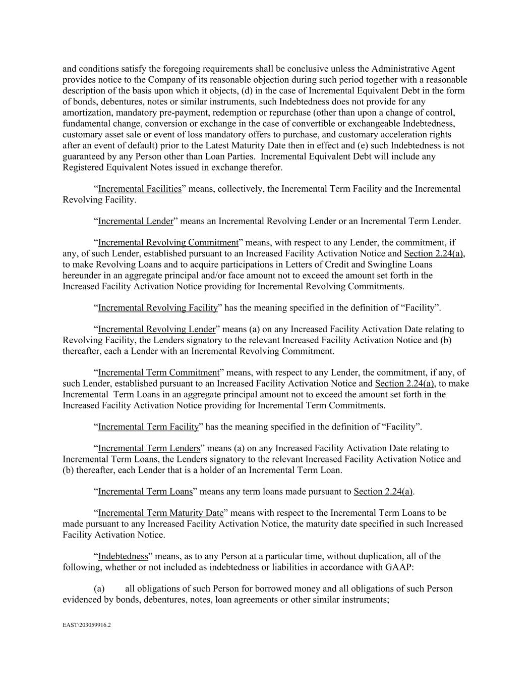 and conditions satisfy the foregoing requirements shall be conclusive unless the Administrative Agent provides notice to the Company of its reasonable objection during such period together with a reasonable description of the basis upon which it objects, (d) in the case of Incremental Equivalent Debt in the form of bonds, debentures, notes or similar instruments, such Indebtedness does not provide for any amortization, mandatory pre-payment, redemption or repurchase (other than upon a change of control, fundamental change, conversion or exchange in the case of convertible or exchangeable Indebtedness, customary asset sale or event of loss mandatory offers to purchase, and customary acceleration rights after an event of default) prior to the Latest Maturity Date then in effect and (e) such Indebtedness is not guaranteed by any Person other than Loan Parties. Incremental Equivalent Debt will include any Registered Equivalent Notes issued in exchange therefor. “Incremental Facilities” means, collectively, the Incremental Term Facility and the Incremental Revolving Facility. “Incremental Lender” means an Incremental Revolving Lender or an Incremental Term Lender. “Incremental Revolving Commitment” means, with respect to any Lender, the commitment, if any, of such Lender, established pursuant to an Increased Facility Activation Notice and Section 2.24(a), to make Revolving Loans and to acquire participations in Letters of Credit and Swingline Loans hereunder in an aggregate principal and/or face amount not to exceed the amount set forth in the Increased Facility Activation Notice providing for Incremental Revolving Commitments. “Incremental Revolving Facility” has the meaning specified in the definition of “Facility”. “Incremental Revolving Lender” means (a) on any Increased Facility Activation Date relating to Revolving Facility, the Lenders signatory to the relevant Increased Facility Activation Notice and (b) thereafter, each a Lender with an Incremental Revolving Commitment. “Incremental Term Commitment” means, with respect to any Lender, the commitment, if any, of such Lender, established pursuant to an Increased Facility Activation Notice and Section 2.24(a), to make Incremental Term Loans in an aggregate principal amount not to exceed the amount set forth in the Increased Facility Activation Notice providing for Incremental Term Commitments. “Incremental Term Facility” has the meaning specified in the definition of “Facility”. “Incremental Term Lenders” means (a) on any Increased Facility Activation Date relating to Incremental Term Loans, the Lenders signatory to the relevant Increased Facility Activation Notice and (b) thereafter, each Lender that is a holder of an Incremental Term Loan. “Incremental Term Loans” means any term loans made pursuant to Section 2.24(a). “Incremental Term Maturity Date” means with respect to the Incremental Term Loans to be made pursuant to any Increased Facility Activation Notice, the maturity date specified in such Increased Facility Activation Notice. “Indebtedness” means, as to any Person at a particular time, without duplication, all of the following, whether or not included as indebtedness or liabilities in accordance with GAAP: (a) all obligations of such Person for borrowed money and all obligations of such Person evidenced by bonds, debentures, notes, loan agreements or other similar instruments; EAST\203059916.2