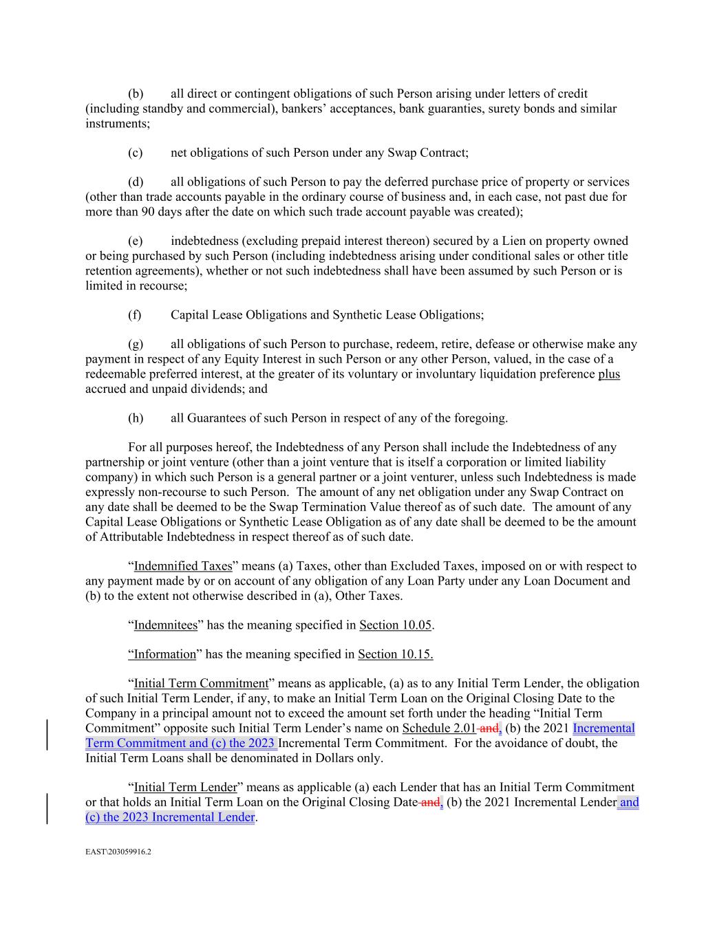 (b) all direct or contingent obligations of such Person arising under letters of credit (including standby and commercial), bankers’ acceptances, bank guaranties, surety bonds and similar instruments; (c) net obligations of such Person under any Swap Contract; (d) all obligations of such Person to pay the deferred purchase price of property or services (other than trade accounts payable in the ordinary course of business and, in each case, not past due for more than 90 days after the date on which such trade account payable was created); (e) indebtedness (excluding prepaid interest thereon) secured by a Lien on property owned or being purchased by such Person (including indebtedness arising under conditional sales or other title retention agreements), whether or not such indebtedness shall have been assumed by such Person or is limited in recourse; (f) Capital Lease Obligations and Synthetic Lease Obligations; (g) all obligations of such Person to purchase, redeem, retire, defease or otherwise make any payment in respect of any Equity Interest in such Person or any other Person, valued, in the case of a redeemable preferred interest, at the greater of its voluntary or involuntary liquidation preference plus accrued and unpaid dividends; and (h) all Guarantees of such Person in respect of any of the foregoing. For all purposes hereof, the Indebtedness of any Person shall include the Indebtedness of any partnership or joint venture (other than a joint venture that is itself a corporation or limited liability company) in which such Person is a general partner or a joint venturer, unless such Indebtedness is made expressly non-recourse to such Person. The amount of any net obligation under any Swap Contract on any date shall be deemed to be the Swap Termination Value thereof as of such date. The amount of any Capital Lease Obligations or Synthetic Lease Obligation as of any date shall be deemed to be the amount of Attributable Indebtedness in respect thereof as of such date. “Indemnified Taxes” means (a) Taxes, other than Excluded Taxes, imposed on or with respect to any payment made by or on account of any obligation of any Loan Party under any Loan Document and (b) to the extent not otherwise described in (a), Other Taxes. “Indemnitees” has the meaning specified in Section 10.05. “Information” has the meaning specified in Section 10.15. “Initial Term Commitment” means as applicable, (a) as to any Initial Term Lender, the obligation of such Initial Term Lender, if any, to make an Initial Term Loan on the Original Closing Date to the Company in a principal amount not to exceed the amount set forth under the heading “Initial Term Commitment” opposite such Initial Term Lender’s name on Schedule 2.01 and, (b) the 2021 Incremental Term Commitment and (c) the 2023 Incremental Term Commitment. For the avoidance of doubt, the Initial Term Loans shall be denominated in Dollars only. “Initial Term Lender” means as applicable (a) each Lender that has an Initial Term Commitment or that holds an Initial Term Loan on the Original Closing Date and, (b) the 2021 Incremental Lender and (c) the 2023 Incremental Lender. EAST\203059916.2