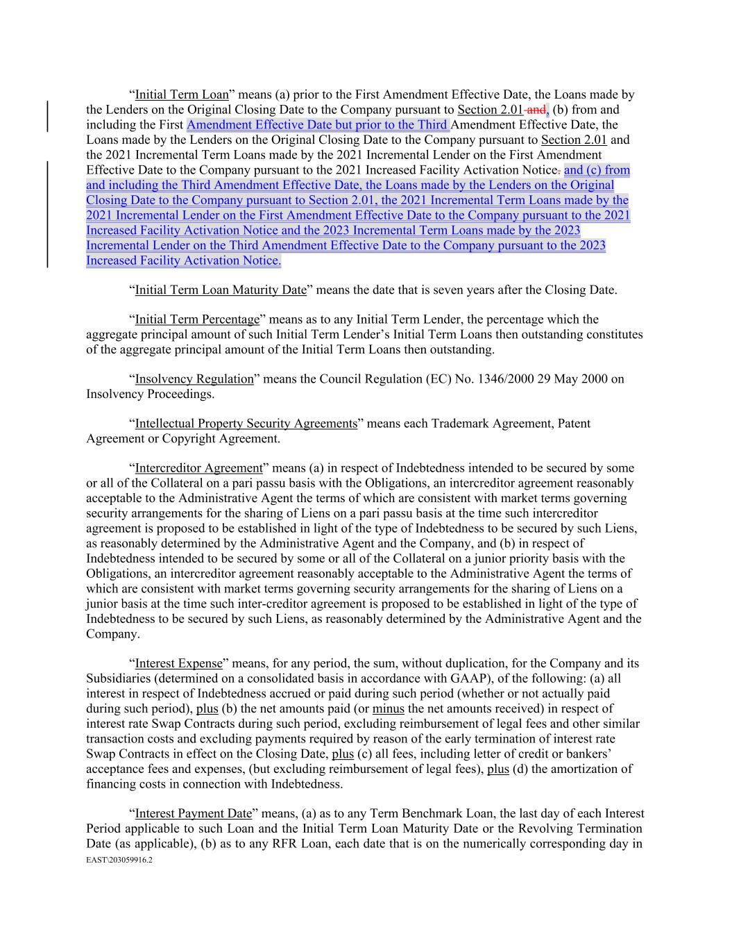 “Initial Term Loan” means (a) prior to the First Amendment Effective Date, the Loans made by the Lenders on the Original Closing Date to the Company pursuant to Section 2.01 and, (b) from and including the First Amendment Effective Date but prior to the Third Amendment Effective Date, the Loans made by the Lenders on the Original Closing Date to the Company pursuant to Section 2.01 and the 2021 Incremental Term Loans made by the 2021 Incremental Lender on the First Amendment Effective Date to the Company pursuant to the 2021 Increased Facility Activation Notice. and (c) from and including the Third Amendment Effective Date, the Loans made by the Lenders on the Original Closing Date to the Company pursuant to Section 2.01, the 2021 Incremental Term Loans made by the 2021 Incremental Lender on the First Amendment Effective Date to the Company pursuant to the 2021 Increased Facility Activation Notice and the 2023 Incremental Term Loans made by the 2023 Incremental Lender on the Third Amendment Effective Date to the Company pursuant to the 2023 Increased Facility Activation Notice. “Initial Term Loan Maturity Date” means the date that is seven years after the Closing Date. “Initial Term Percentage” means as to any Initial Term Lender, the percentage which the aggregate principal amount of such Initial Term Lender’s Initial Term Loans then outstanding constitutes of the aggregate principal amount of the Initial Term Loans then outstanding. “Insolvency Regulation” means the Council Regulation (EC) No. 1346/2000 29 May 2000 on Insolvency Proceedings. “Intellectual Property Security Agreements” means each Trademark Agreement, Patent Agreement or Copyright Agreement. “Intercreditor Agreement” means (a) in respect of Indebtedness intended to be secured by some or all of the Collateral on a pari passu basis with the Obligations, an intercreditor agreement reasonably acceptable to the Administrative Agent the terms of which are consistent with market terms governing security arrangements for the sharing of Liens on a pari passu basis at the time such intercreditor agreement is proposed to be established in light of the type of Indebtedness to be secured by such Liens, as reasonably determined by the Administrative Agent and the Company, and (b) in respect of Indebtedness intended to be secured by some or all of the Collateral on a junior priority basis with the Obligations, an intercreditor agreement reasonably acceptable to the Administrative Agent the terms of which are consistent with market terms governing security arrangements for the sharing of Liens on a junior basis at the time such inter-creditor agreement is proposed to be established in light of the type of Indebtedness to be secured by such Liens, as reasonably determined by the Administrative Agent and the Company. “Interest Expense” means, for any period, the sum, without duplication, for the Company and its Subsidiaries (determined on a consolidated basis in accordance with GAAP), of the following: (a) all interest in respect of Indebtedness accrued or paid during such period (whether or not actually paid during such period), plus (b) the net amounts paid (or minus the net amounts received) in respect of interest rate Swap Contracts during such period, excluding reimbursement of legal fees and other similar transaction costs and excluding payments required by reason of the early termination of interest rate Swap Contracts in effect on the Closing Date, plus (c) all fees, including letter of credit or bankers’ acceptance fees and expenses, (but excluding reimbursement of legal fees), plus (d) the amortization of financing costs in connection with Indebtedness. “Interest Payment Date” means, (a) as to any Term Benchmark Loan, the last day of each Interest Period applicable to such Loan and the Initial Term Loan Maturity Date or the Revolving Termination Date (as applicable), (b) as to any RFR Loan, each date that is on the numerically corresponding day in EAST\203059916.2