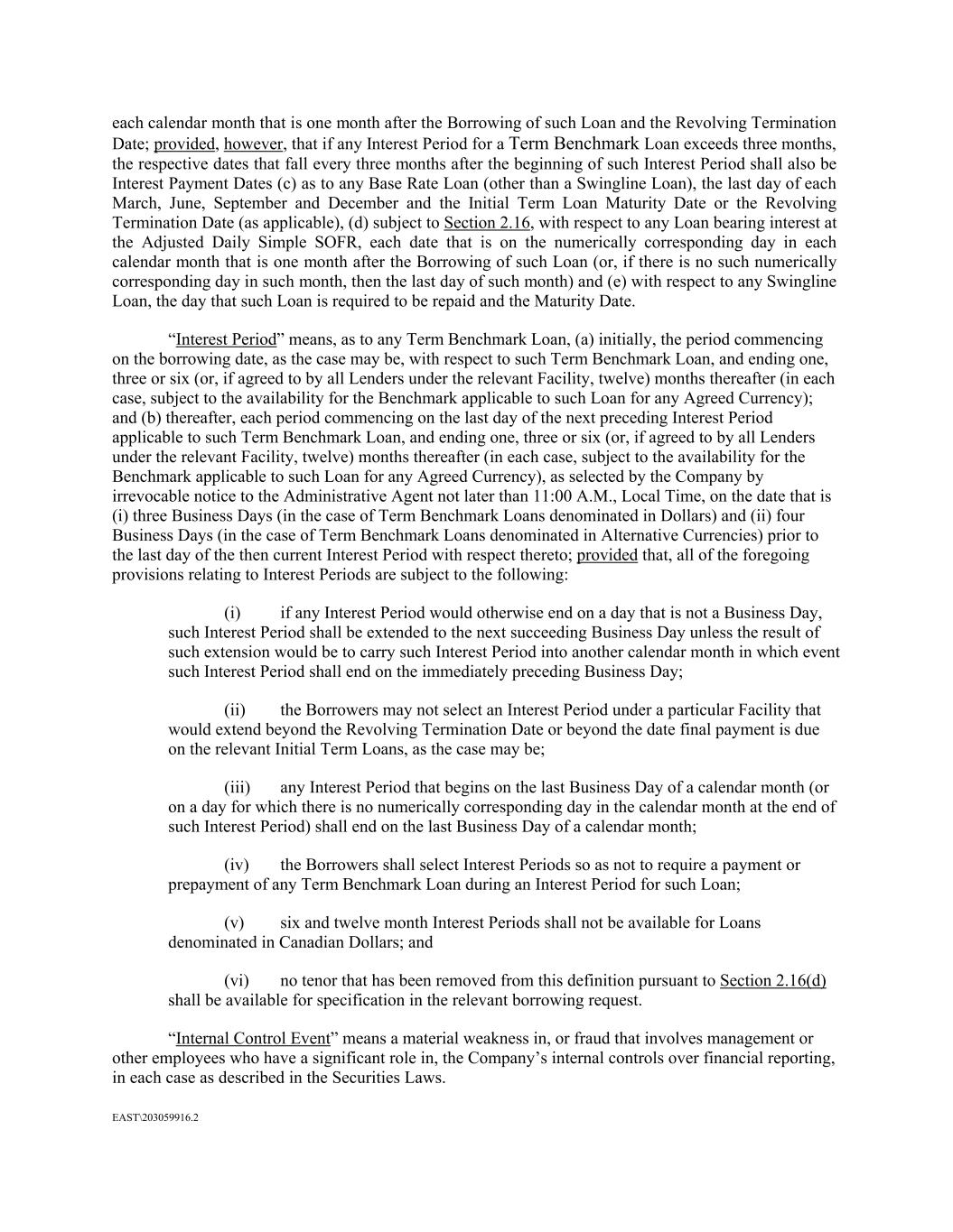 each calendar month that is one month after the Borrowing of such Loan and the Revolving Termination Date; provided, however, that if any Interest Period for a Term Benchmark Loan exceeds three months, the respective dates that fall every three months after the beginning of such Interest Period shall also be Interest Payment Dates (c) as to any Base Rate Loan (other than a Swingline Loan), the last day of each March, June, September and December and the Initial Term Loan Maturity Date or the Revolving Termination Date (as applicable), (d) subject to Section 2.16, with respect to any Loan bearing interest at the Adjusted Daily Simple SOFR, each date that is on the numerically corresponding day in each calendar month that is one month after the Borrowing of such Loan (or, if there is no such numerically corresponding day in such month, then the last day of such month) and (e) with respect to any Swingline Loan, the day that such Loan is required to be repaid and the Maturity Date. “Interest Period” means, as to any Term Benchmark Loan, (a) initially, the period commencing on the borrowing date, as the case may be, with respect to such Term Benchmark Loan, and ending one, three or six (or, if agreed to by all Lenders under the relevant Facility, twelve) months thereafter (in each case, subject to the availability for the Benchmark applicable to such Loan for any Agreed Currency); and (b) thereafter, each period commencing on the last day of the next preceding Interest Period applicable to such Term Benchmark Loan, and ending one, three or six (or, if agreed to by all Lenders under the relevant Facility, twelve) months thereafter (in each case, subject to the availability for the Benchmark applicable to such Loan for any Agreed Currency), as selected by the Company by irrevocable notice to the Administrative Agent not later than 11:00 A.M., Local Time, on the date that is (i) three Business Days (in the case of Term Benchmark Loans denominated in Dollars) and (ii) four Business Days (in the case of Term Benchmark Loans denominated in Alternative Currencies) prior to the last day of the then current Interest Period with respect thereto; provided that, all of the foregoing provisions relating to Interest Periods are subject to the following: (i) if any Interest Period would otherwise end on a day that is not a Business Day, such Interest Period shall be extended to the next succeeding Business Day unless the result of such extension would be to carry such Interest Period into another calendar month in which event such Interest Period shall end on the immediately preceding Business Day; (ii) the Borrowers may not select an Interest Period under a particular Facility that would extend beyond the Revolving Termination Date or beyond the date final payment is due on the relevant Initial Term Loans, as the case may be; (iii) any Interest Period that begins on the last Business Day of a calendar month (or on a day for which there is no numerically corresponding day in the calendar month at the end of such Interest Period) shall end on the last Business Day of a calendar month; (iv) the Borrowers shall select Interest Periods so as not to require a payment or prepayment of any Term Benchmark Loan during an Interest Period for such Loan; (v) six and twelve month Interest Periods shall not be available for Loans denominated in Canadian Dollars; and (vi) no tenor that has been removed from this definition pursuant to Section 2.16(d) shall be available for specification in the relevant borrowing request. “Internal Control Event” means a material weakness in, or fraud that involves management or other employees who have a significant role in, the Company’s internal controls over financial reporting, in each case as described in the Securities Laws. EAST\203059916.2