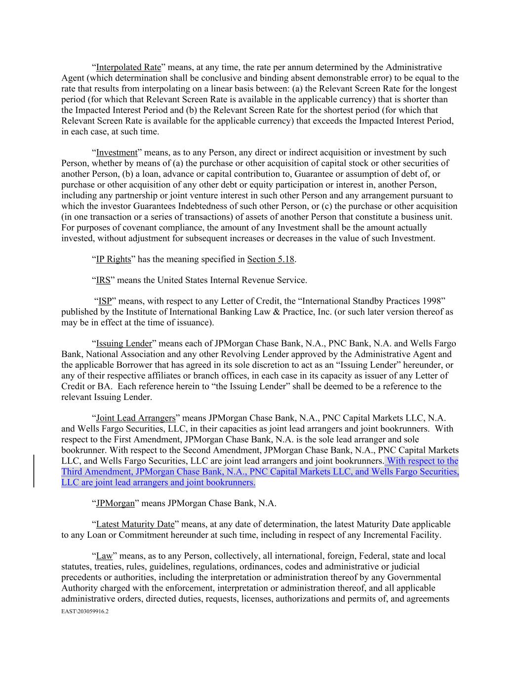 “Interpolated Rate” means, at any time, the rate per annum determined by the Administrative Agent (which determination shall be conclusive and binding absent demonstrable error) to be equal to the rate that results from interpolating on a linear basis between: (a) the Relevant Screen Rate for the longest period (for which that Relevant Screen Rate is available in the applicable currency) that is shorter than the Impacted Interest Period and (b) the Relevant Screen Rate for the shortest period (for which that Relevant Screen Rate is available for the applicable currency) that exceeds the Impacted Interest Period, in each case, at such time. “Investment” means, as to any Person, any direct or indirect acquisition or investment by such Person, whether by means of (a) the purchase or other acquisition of capital stock or other securities of another Person, (b) a loan, advance or capital contribution to, Guarantee or assumption of debt of, or purchase or other acquisition of any other debt or equity participation or interest in, another Person, including any partnership or joint venture interest in such other Person and any arrangement pursuant to which the investor Guarantees Indebtedness of such other Person, or (c) the purchase or other acquisition (in one transaction or a series of transactions) of assets of another Person that constitute a business unit. For purposes of covenant compliance, the amount of any Investment shall be the amount actually invested, without adjustment for subsequent increases or decreases in the value of such Investment. “IP Rights” has the meaning specified in Section 5.18. “IRS” means the United States Internal Revenue Service. “ISP” means, with respect to any Letter of Credit, the “International Standby Practices 1998” published by the Institute of International Banking Law & Practice, Inc. (or such later version thereof as may be in effect at the time of issuance). “Issuing Lender” means each of JPMorgan Chase Bank, N.A., PNC Bank, N.A. and Wells Fargo Bank, National Association and any other Revolving Lender approved by the Administrative Agent and the applicable Borrower that has agreed in its sole discretion to act as an “Issuing Lender” hereunder, or any of their respective affiliates or branch offices, in each case in its capacity as issuer of any Letter of Credit or BA. Each reference herein to “the Issuing Lender” shall be deemed to be a reference to the relevant Issuing Lender. “Joint Lead Arrangers” means JPMorgan Chase Bank, N.A., PNC Capital Markets LLC, N.A. and Wells Fargo Securities, LLC, in their capacities as joint lead arrangers and joint bookrunners. With respect to the First Amendment, JPMorgan Chase Bank, N.A. is the sole lead arranger and sole bookrunner. With respect to the Second Amendment, JPMorgan Chase Bank, N.A., PNC Capital Markets LLC, and Wells Fargo Securities, LLC are joint lead arrangers and joint bookrunners. With respect to the Third Amendment, JPMorgan Chase Bank, N.A., PNC Capital Markets LLC, and Wells Fargo Securities, LLC are joint lead arrangers and joint bookrunners. “JPMorgan” means JPMorgan Chase Bank, N.A. “Latest Maturity Date” means, at any date of determination, the latest Maturity Date applicable to any Loan or Commitment hereunder at such time, including in respect of any Incremental Facility. “Law” means, as to any Person, collectively, all international, foreign, Federal, state and local statutes, treaties, rules, guidelines, regulations, ordinances, codes and administrative or judicial precedents or authorities, including the interpretation or administration thereof by any Governmental Authority charged with the enforcement, interpretation or administration thereof, and all applicable administrative orders, directed duties, requests, licenses, authorizations and permits of, and agreements EAST\203059916.2