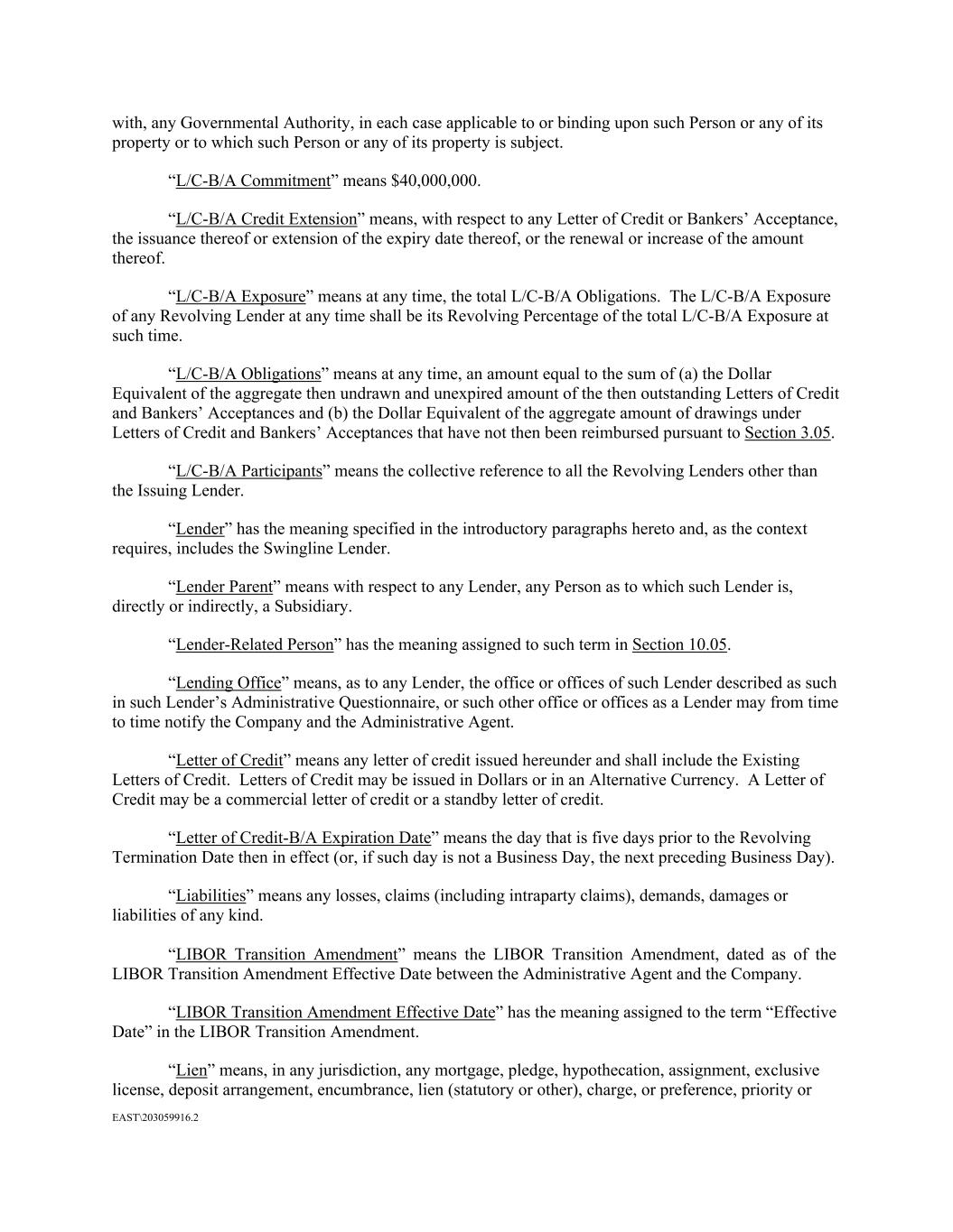 with, any Governmental Authority, in each case applicable to or binding upon such Person or any of its property or to which such Person or any of its property is subject. “L/C-B/A Commitment” means $40,000,000. “L/C-B/A Credit Extension” means, with respect to any Letter of Credit or Bankers’ Acceptance, the issuance thereof or extension of the expiry date thereof, or the renewal or increase of the amount thereof. “L/C-B/A Exposure” means at any time, the total L/C-B/A Obligations. The L/C-B/A Exposure of any Revolving Lender at any time shall be its Revolving Percentage of the total L/C-B/A Exposure at such time. “L/C-B/A Obligations” means at any time, an amount equal to the sum of (a) the Dollar Equivalent of the aggregate then undrawn and unexpired amount of the then outstanding Letters of Credit and Bankers’ Acceptances and (b) the Dollar Equivalent of the aggregate amount of drawings under Letters of Credit and Bankers’ Acceptances that have not then been reimbursed pursuant to Section 3.05. “L/C-B/A Participants” means the collective reference to all the Revolving Lenders other than the Issuing Lender. “Lender” has the meaning specified in the introductory paragraphs hereto and, as the context requires, includes the Swingline Lender. “Lender Parent” means with respect to any Lender, any Person as to which such Lender is, directly or indirectly, a Subsidiary. “Lender-Related Person” has the meaning assigned to such term in Section 10.05. “Lending Office” means, as to any Lender, the office or offices of such Lender described as such in such Lender’s Administrative Questionnaire, or such other office or offices as a Lender may from time to time notify the Company and the Administrative Agent. “Letter of Credit” means any letter of credit issued hereunder and shall include the Existing Letters of Credit. Letters of Credit may be issued in Dollars or in an Alternative Currency. A Letter of Credit may be a commercial letter of credit or a standby letter of credit. “Letter of Credit-B/A Expiration Date” means the day that is five days prior to the Revolving Termination Date then in effect (or, if such day is not a Business Day, the next preceding Business Day). “Liabilities” means any losses, claims (including intraparty claims), demands, damages or liabilities of any kind. “LIBOR Transition Amendment” means the LIBOR Transition Amendment, dated as of the LIBOR Transition Amendment Effective Date between the Administrative Agent and the Company. “LIBOR Transition Amendment Effective Date” has the meaning assigned to the term “Effective Date” in the LIBOR Transition Amendment. “Lien” means, in any jurisdiction, any mortgage, pledge, hypothecation, assignment, exclusive license, deposit arrangement, encumbrance, lien (statutory or other), charge, or preference, priority or EAST\203059916.2