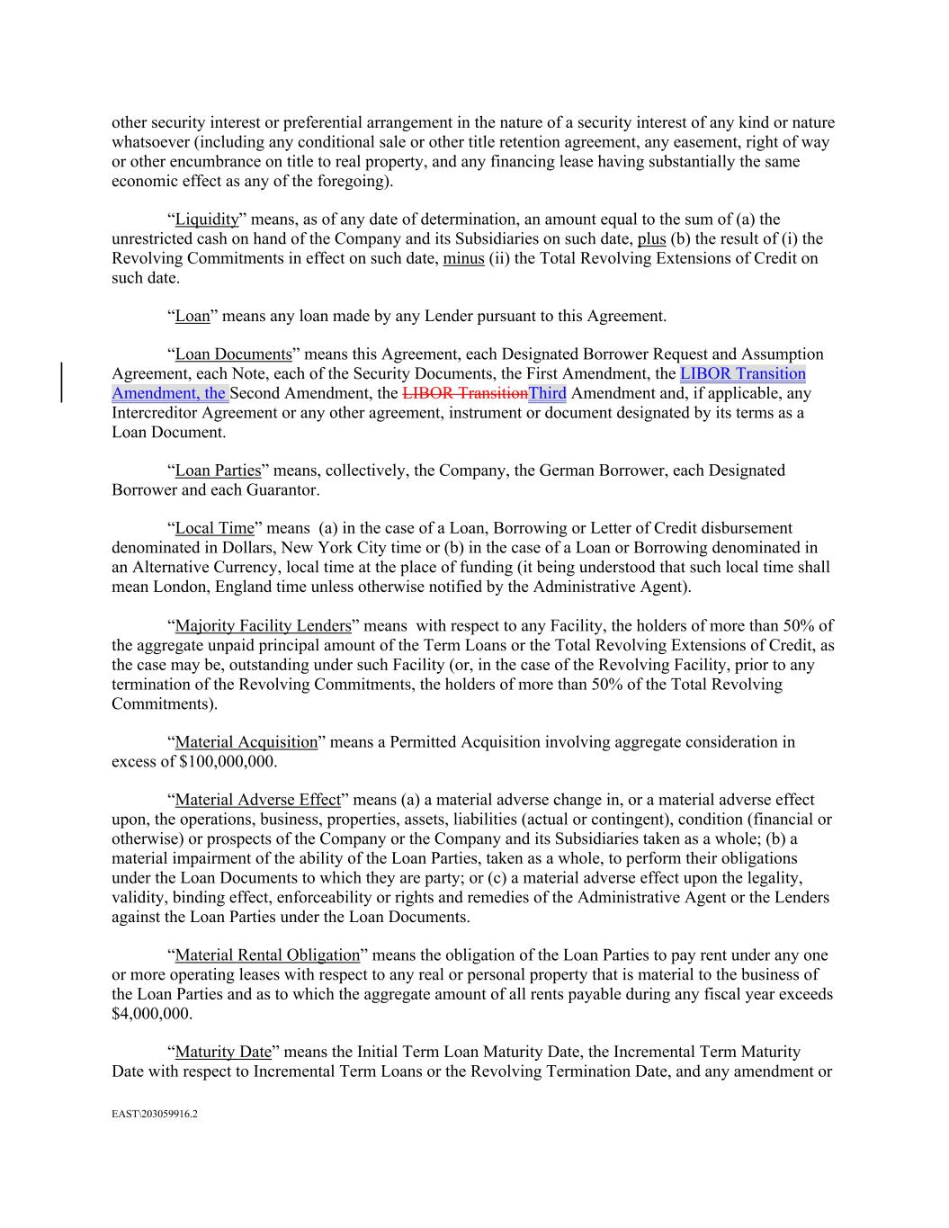 other security interest or preferential arrangement in the nature of a security interest of any kind or nature whatsoever (including any conditional sale or other title retention agreement, any easement, right of way or other encumbrance on title to real property, and any financing lease having substantially the same economic effect as any of the foregoing). “Liquidity” means, as of any date of determination, an amount equal to the sum of (a) the unrestricted cash on hand of the Company and its Subsidiaries on such date, plus (b) the result of (i) the Revolving Commitments in effect on such date, minus (ii) the Total Revolving Extensions of Credit on such date. “Loan” means any loan made by any Lender pursuant to this Agreement. “Loan Documents” means this Agreement, each Designated Borrower Request and Assumption Agreement, each Note, each of the Security Documents, the First Amendment, the LIBOR Transition Amendment, the Second Amendment, the LIBOR TransitionThird Amendment and, if applicable, any Intercreditor Agreement or any other agreement, instrument or document designated by its terms as a Loan Document. “Loan Parties” means, collectively, the Company, the German Borrower, each Designated Borrower and each Guarantor. “Local Time” means (a) in the case of a Loan, Borrowing or Letter of Credit disbursement denominated in Dollars, New York City time or (b) in the case of a Loan or Borrowing denominated in an Alternative Currency, local time at the place of funding (it being understood that such local time shall mean London, England time unless otherwise notified by the Administrative Agent). “Majority Facility Lenders” means with respect to any Facility, the holders of more than 50% of the aggregate unpaid principal amount of the Term Loans or the Total Revolving Extensions of Credit, as the case may be, outstanding under such Facility (or, in the case of the Revolving Facility, prior to any termination of the Revolving Commitments, the holders of more than 50% of the Total Revolving Commitments). “Material Acquisition” means a Permitted Acquisition involving aggregate consideration in excess of $100,000,000. “Material Adverse Effect” means (a) a material adverse change in, or a material adverse effect upon, the operations, business, properties, assets, liabilities (actual or contingent), condition (financial or otherwise) or prospects of the Company or the Company and its Subsidiaries taken as a whole; (b) a material impairment of the ability of the Loan Parties, taken as a whole, to perform their obligations under the Loan Documents to which they are party; or (c) a material adverse effect upon the legality, validity, binding effect, enforceability or rights and remedies of the Administrative Agent or the Lenders against the Loan Parties under the Loan Documents. “Material Rental Obligation” means the obligation of the Loan Parties to pay rent under any one or more operating leases with respect to any real or personal property that is material to the business of the Loan Parties and as to which the aggregate amount of all rents payable during any fiscal year exceeds $4,000,000. “Maturity Date” means the Initial Term Loan Maturity Date, the Incremental Term Maturity Date with respect to Incremental Term Loans or the Revolving Termination Date, and any amendment or EAST\203059916.2