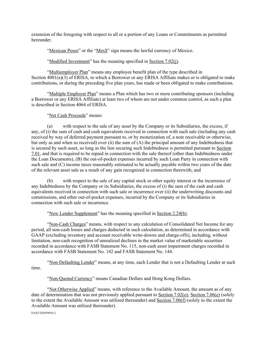 extension of the foregoing with respect to all or a portion of any Loans or Commitments as permitted hereunder. “Mexican Pesos” or the “Mex$” sign means the lawful currency of Mexico. “Modified Investment” has the meaning specified in Section 7.02(j). “Multiemployer Plan” means any employee benefit plan of the type described in Section 4001(a)(3) of ERISA, to which a Borrower or any ERISA Affiliate makes or is obligated to make contributions, or during the preceding five plan years, has made or been obligated to make contributions. “Multiple Employer Plan” means a Plan which has two or more contributing sponsors (including a Borrower or any ERISA Affiliate) at least two of whom are not under common control, as such a plan is described in Section 4064 of ERISA. “Net Cash Proceeds” means: (a) with respect to the sale of any asset by the Company or its Subsidiaries, the excess, if any, of (i) the sum of cash and cash equivalents received in connection with such sale (including any cash received by way of deferred payment pursuant to, or by monetization of, a note receivable or otherwise, but only as and when so received) over (ii) the sum of (A) the principal amount of any Indebtedness that is secured by such asset, so long as the lien securing such Indebtedness is permitted pursuant to Section 7.01, and that is required to be repaid in connection with the sale thereof (other than Indebtedness under the Loan Documents), (B) the out-of-pocket expenses incurred by such Loan Party in connection with such sale and (C) income taxes reasonably estimated to be actually payable within two years of the date of the relevant asset sale as a result of any gain recognized in connection therewith; and (b) with respect to the sale of any capital stock or other equity interest or the incurrence of any Indebtedness by the Company or its Subsidiaries, the excess of (i) the sum of the cash and cash equivalents received in connection with such sale or incurrence over (ii) the underwriting discounts and commissions, and other out-of-pocket expenses, incurred by the Company or its Subsidiaries in connection with such sale or incurrence. “New Lender Supplement” has the meaning specified in Section 2.24(b). “Non-Cash Charges” means, with respect to any calculation of Consolidated Net Income for any period, all non-cash losses and charges deducted in such calculation, as determined in accordance with GAAP (excluding inventory and account receivable write-downs and charge-offs), including, without limitation, non-cash recognition of unrealized declines in the market value of marketable securities recorded in accordance with FASB Statement No. 115, non-cash asset impairment charges recorded in accordance with FASB Statement No. 142 and FASB Statement No. 144. “Non-Defaulting Lender” means, at any time, each Lender that is not a Defaulting Lender at such time. “Non-Quoted Currency” means Canadian Dollars and Hong Kong Dollars. “Not Otherwise Applied” means, with reference to the Available Amount, the amount as of any date of determination that was not previously applied pursuant to Section 7.02(o), Section 7.06(e) (solely to the extent the Available Amount was utilized thereunder) and Section 7.06(f) (solely to the extent the Available Amount was utilized thereunder). EAST\203059916.2