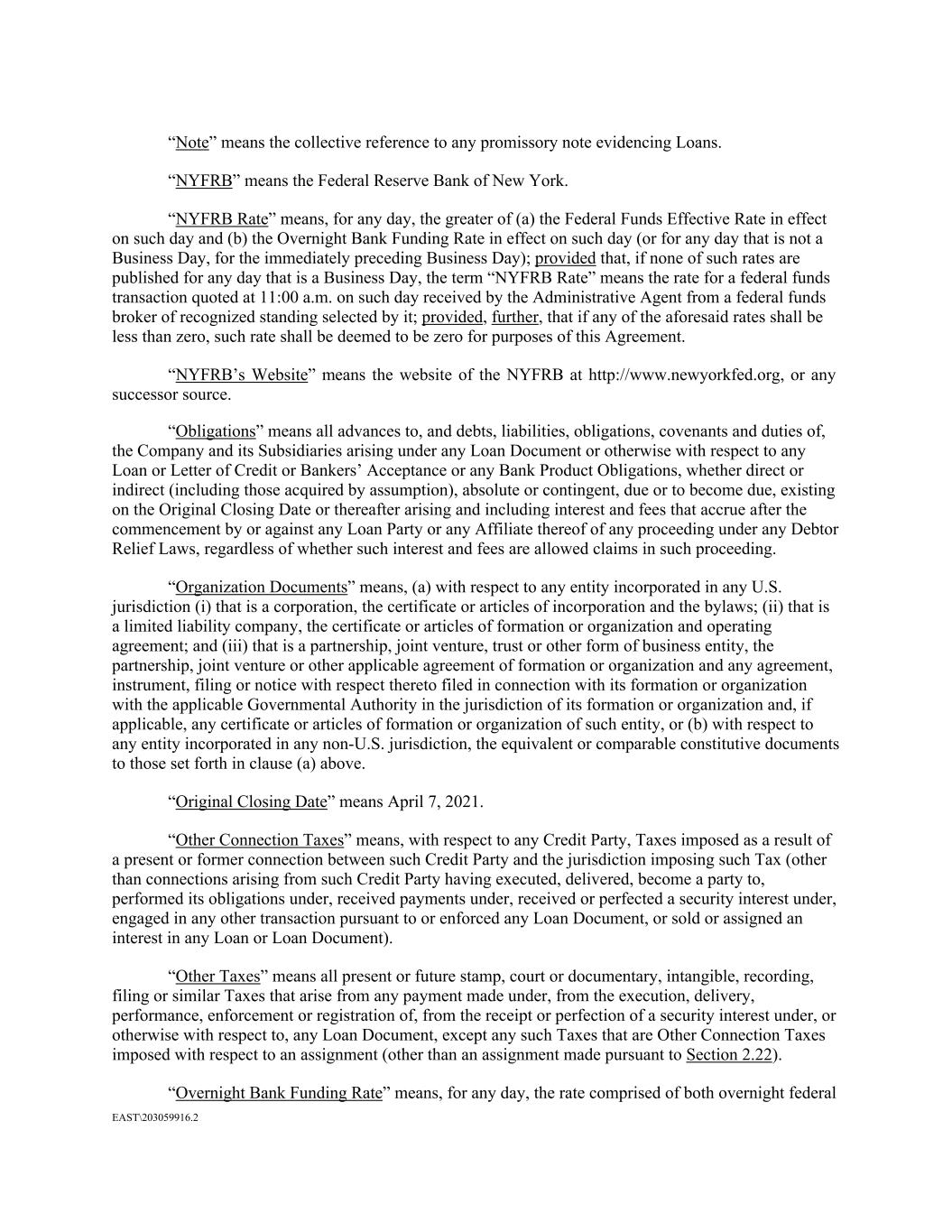 “Note” means the collective reference to any promissory note evidencing Loans. “NYFRB” means the Federal Reserve Bank of New York. “NYFRB Rate” means, for any day, the greater of (a) the Federal Funds Effective Rate in effect on such day and (b) the Overnight Bank Funding Rate in effect on such day (or for any day that is not a Business Day, for the immediately preceding Business Day); provided that, if none of such rates are published for any day that is a Business Day, the term “NYFRB Rate” means the rate for a federal funds transaction quoted at 11:00 a.m. on such day received by the Administrative Agent from a federal funds broker of recognized standing selected by it; provided, further, that if any of the aforesaid rates shall be less than zero, such rate shall be deemed to be zero for purposes of this Agreement. “NYFRB’s Website” means the website of the NYFRB at http://www.newyorkfed.org, or any successor source. “Obligations” means all advances to, and debts, liabilities, obligations, covenants and duties of, the Company and its Subsidiaries arising under any Loan Document or otherwise with respect to any Loan or Letter of Credit or Bankers’ Acceptance or any Bank Product Obligations, whether direct or indirect (including those acquired by assumption), absolute or contingent, due or to become due, existing on the Original Closing Date or thereafter arising and including interest and fees that accrue after the commencement by or against any Loan Party or any Affiliate thereof of any proceeding under any Debtor Relief Laws, regardless of whether such interest and fees are allowed claims in such proceeding. “Organization Documents” means, (a) with respect to any entity incorporated in any U.S. jurisdiction (i) that is a corporation, the certificate or articles of incorporation and the bylaws; (ii) that is a limited liability company, the certificate or articles of formation or organization and operating agreement; and (iii) that is a partnership, joint venture, trust or other form of business entity, the partnership, joint venture or other applicable agreement of formation or organization and any agreement, instrument, filing or notice with respect thereto filed in connection with its formation or organization with the applicable Governmental Authority in the jurisdiction of its formation or organization and, if applicable, any certificate or articles of formation or organization of such entity, or (b) with respect to any entity incorporated in any non-U.S. jurisdiction, the equivalent or comparable constitutive documents to those set forth in clause (a) above. “Original Closing Date” means April 7, 2021. “Other Connection Taxes” means, with respect to any Credit Party, Taxes imposed as a result of a present or former connection between such Credit Party and the jurisdiction imposing such Tax (other than connections arising from such Credit Party having executed, delivered, become a party to, performed its obligations under, received payments under, received or perfected a security interest under, engaged in any other transaction pursuant to or enforced any Loan Document, or sold or assigned an interest in any Loan or Loan Document). “Other Taxes” means all present or future stamp, court or documentary, intangible, recording, filing or similar Taxes that arise from any payment made under, from the execution, delivery, performance, enforcement or registration of, from the receipt or perfection of a security interest under, or otherwise with respect to, any Loan Document, except any such Taxes that are Other Connection Taxes imposed with respect to an assignment (other than an assignment made pursuant to Section 2.22). “Overnight Bank Funding Rate” means, for any day, the rate comprised of both overnight federal EAST\203059916.2