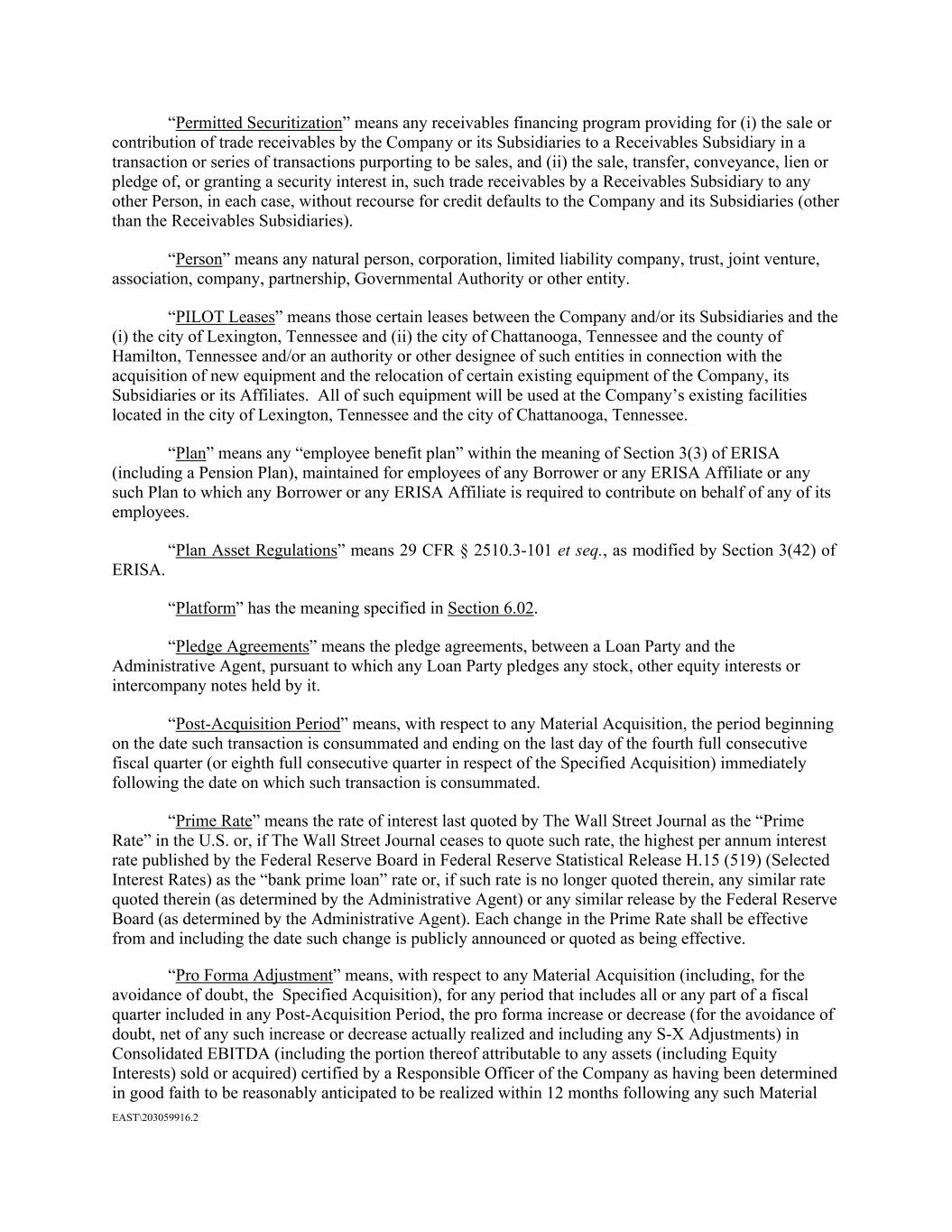 “Permitted Securitization” means any receivables financing program providing for (i) the sale or contribution of trade receivables by the Company or its Subsidiaries to a Receivables Subsidiary in a transaction or series of transactions purporting to be sales, and (ii) the sale, transfer, conveyance, lien or pledge of, or granting a security interest in, such trade receivables by a Receivables Subsidiary to any other Person, in each case, without recourse for credit defaults to the Company and its Subsidiaries (other than the Receivables Subsidiaries). “Person” means any natural person, corporation, limited liability company, trust, joint venture, association, company, partnership, Governmental Authority or other entity. “PILOT Leases” means those certain leases between the Company and/or its Subsidiaries and the (i) the city of Lexington, Tennessee and (ii) the city of Chattanooga, Tennessee and the county of Hamilton, Tennessee and/or an authority or other designee of such entities in connection with the acquisition of new equipment and the relocation of certain existing equipment of the Company, its Subsidiaries or its Affiliates. All of such equipment will be used at the Company’s existing facilities located in the city of Lexington, Tennessee and the city of Chattanooga, Tennessee. “Plan” means any “employee benefit plan” within the meaning of Section 3(3) of ERISA (including a Pension Plan), maintained for employees of any Borrower or any ERISA Affiliate or any such Plan to which any Borrower or any ERISA Affiliate is required to contribute on behalf of any of its employees. “Plan Asset Regulations” means 29 CFR § 2510.3-101 et seq., as modified by Section 3(42) of ERISA. “Platform” has the meaning specified in Section 6.02. “Pledge Agreements” means the pledge agreements, between a Loan Party and the Administrative Agent, pursuant to which any Loan Party pledges any stock, other equity interests or intercompany notes held by it. “Post-Acquisition Period” means, with respect to any Material Acquisition, the period beginning on the date such transaction is consummated and ending on the last day of the fourth full consecutive fiscal quarter (or eighth full consecutive quarter in respect of the Specified Acquisition) immediately following the date on which such transaction is consummated. “Prime Rate” means the rate of interest last quoted by The Wall Street Journal as the “Prime Rate” in the U.S. or, if The Wall Street Journal ceases to quote such rate, the highest per annum interest rate published by the Federal Reserve Board in Federal Reserve Statistical Release H.15 (519) (Selected Interest Rates) as the “bank prime loan” rate or, if such rate is no longer quoted therein, any similar rate quoted therein (as determined by the Administrative Agent) or any similar release by the Federal Reserve Board (as determined by the Administrative Agent). Each change in the Prime Rate shall be effective from and including the date such change is publicly announced or quoted as being effective. “Pro Forma Adjustment” means, with respect to any Material Acquisition (including, for the avoidance of doubt, the Specified Acquisition), for any period that includes all or any part of a fiscal quarter included in any Post-Acquisition Period, the pro forma increase or decrease (for the avoidance of doubt, net of any such increase or decrease actually realized and including any S-X Adjustments) in Consolidated EBITDA (including the portion thereof attributable to any assets (including Equity Interests) sold or acquired) certified by a Responsible Officer of the Company as having been determined in good faith to be reasonably anticipated to be realized within 12 months following any such Material EAST\203059916.2