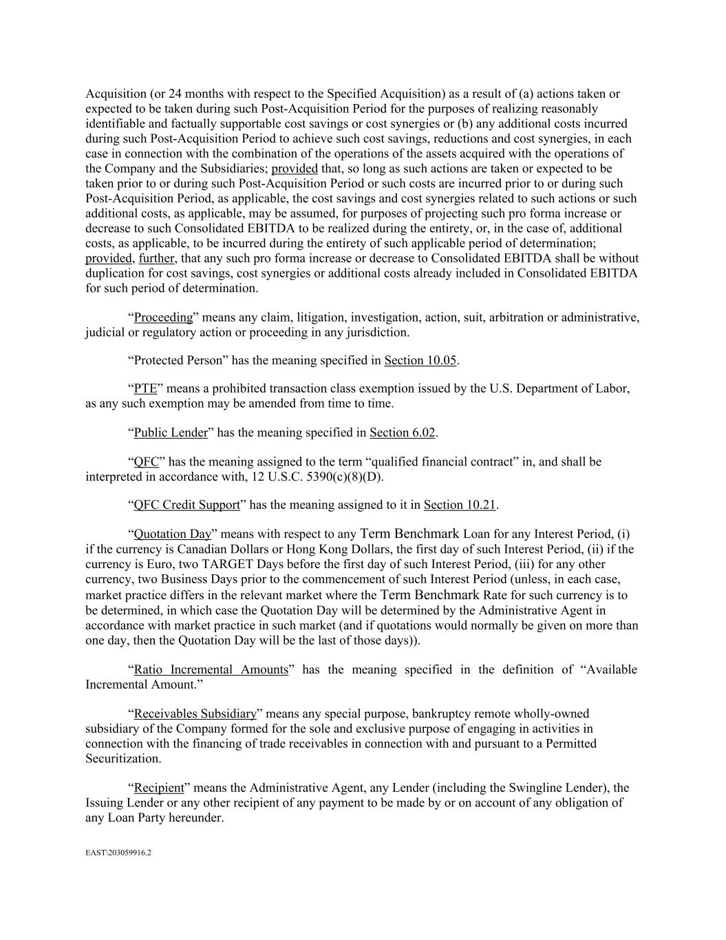 Acquisition (or 24 months with respect to the Specified Acquisition) as a result of (a) actions taken or expected to be taken during such Post-Acquisition Period for the purposes of realizing reasonably identifiable and factually supportable cost savings or cost synergies or (b) any additional costs incurred during such Post-Acquisition Period to achieve such cost savings, reductions and cost synergies, in each case in connection with the combination of the operations of the assets acquired with the operations of the Company and the Subsidiaries; provided that, so long as such actions are taken or expected to be taken prior to or during such Post-Acquisition Period or such costs are incurred prior to or during such Post-Acquisition Period, as applicable, the cost savings and cost synergies related to such actions or such additional costs, as applicable, may be assumed, for purposes of projecting such pro forma increase or decrease to such Consolidated EBITDA to be realized during the entirety, or, in the case of, additional costs, as applicable, to be incurred during the entirety of such applicable period of determination; provided, further, that any such pro forma increase or decrease to Consolidated EBITDA shall be without duplication for cost savings, cost synergies or additional costs already included in Consolidated EBITDA for such period of determination. “Proceeding” means any claim, litigation, investigation, action, suit, arbitration or administrative, judicial or regulatory action or proceeding in any jurisdiction. “Protected Person” has the meaning specified in Section 10.05. “PTE” means a prohibited transaction class exemption issued by the U.S. Department of Labor, as any such exemption may be amended from time to time. “Public Lender” has the meaning specified in Section 6.02. “QFC” has the meaning assigned to the term “qualified financial contract” in, and shall be interpreted in accordance with, 12 U.S.C. 5390(c)(8)(D). “QFC Credit Support” has the meaning assigned to it in Section 10.21. “Quotation Day” means with respect to any Term Benchmark Loan for any Interest Period, (i) if the currency is Canadian Dollars or Hong Kong Dollars, the first day of such Interest Period, (ii) if the currency is Euro, two TARGET Days before the first day of such Interest Period, (iii) for any other currency, two Business Days prior to the commencement of such Interest Period (unless, in each case, market practice differs in the relevant market where the Term Benchmark Rate for such currency is to be determined, in which case the Quotation Day will be determined by the Administrative Agent in accordance with market practice in such market (and if quotations would normally be given on more than one day, then the Quotation Day will be the last of those days)). “Ratio Incremental Amounts” has the meaning specified in the definition of “Available Incremental Amount.” “Receivables Subsidiary” means any special purpose, bankruptcy remote wholly-owned subsidiary of the Company formed for the sole and exclusive purpose of engaging in activities in connection with the financing of trade receivables in connection with and pursuant to a Permitted Securitization. “Recipient” means the Administrative Agent, any Lender (including the Swingline Lender), the Issuing Lender or any other recipient of any payment to be made by or on account of any obligation of any Loan Party hereunder. EAST\203059916.2
