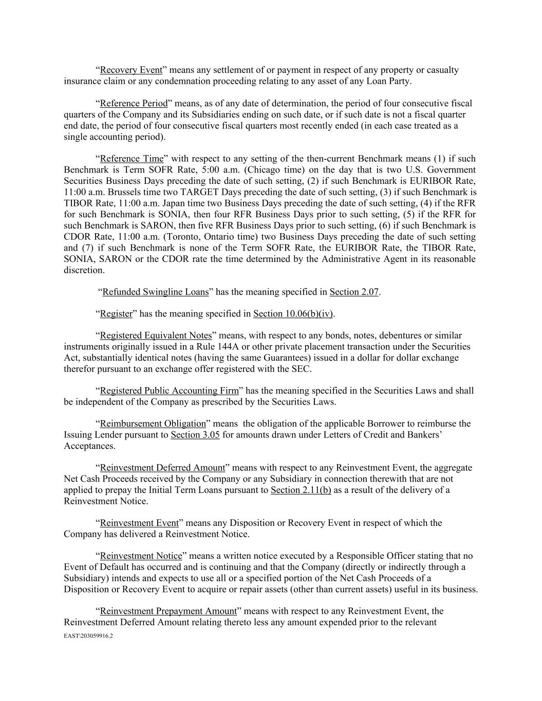 “Recovery Event” means any settlement of or payment in respect of any property or casualty insurance claim or any condemnation proceeding relating to any asset of any Loan Party. “Reference Period” means, as of any date of determination, the period of four consecutive fiscal quarters of the Company and its Subsidiaries ending on such date, or if such date is not a fiscal quarter end date, the period of four consecutive fiscal quarters most recently ended (in each case treated as a single accounting period). “Reference Time” with respect to any setting of the then-current Benchmark means (1) if such Benchmark is Term SOFR Rate, 5:00 a.m. (Chicago time) on the day that is two U.S. Government Securities Business Days preceding the date of such setting, (2) if such Benchmark is EURIBOR Rate, 11:00 a.m. Brussels time two TARGET Days preceding the date of such setting, (3) if such Benchmark is TIBOR Rate, 11:00 a.m. Japan time two Business Days preceding the date of such setting, (4) if the RFR for such Benchmark is SONIA, then four RFR Business Days prior to such setting, (5) if the RFR for such Benchmark is SARON, then five RFR Business Days prior to such setting, (6) if such Benchmark is CDOR Rate, 11:00 a.m. (Toronto, Ontario time) two Business Days preceding the date of such setting and (7) if such Benchmark is none of the Term SOFR Rate, the EURIBOR Rate, the TIBOR Rate, SONIA, SARON or the CDOR rate the time determined by the Administrative Agent in its reasonable discretion. “Refunded Swingline Loans” has the meaning specified in Section 2.07. “Register” has the meaning specified in Section 10.06(b)(iv). “Registered Equivalent Notes” means, with respect to any bonds, notes, debentures or similar instruments originally issued in a Rule 144A or other private placement transaction under the Securities Act, substantially identical notes (having the same Guarantees) issued in a dollar for dollar exchange therefor pursuant to an exchange offer registered with the SEC. “Registered Public Accounting Firm” has the meaning specified in the Securities Laws and shall be independent of the Company as prescribed by the Securities Laws. “Reimbursement Obligation” means the obligation of the applicable Borrower to reimburse the Issuing Lender pursuant to Section 3.05 for amounts drawn under Letters of Credit and Bankers’ Acceptances. “Reinvestment Deferred Amount” means with respect to any Reinvestment Event, the aggregate Net Cash Proceeds received by the Company or any Subsidiary in connection therewith that are not applied to prepay the Initial Term Loans pursuant to Section 2.11(b) as a result of the delivery of a Reinvestment Notice. “Reinvestment Event” means any Disposition or Recovery Event in respect of which the Company has delivered a Reinvestment Notice. “Reinvestment Notice” means a written notice executed by a Responsible Officer stating that no Event of Default has occurred and is continuing and that the Company (directly or indirectly through a Subsidiary) intends and expects to use all or a specified portion of the Net Cash Proceeds of a Disposition or Recovery Event to acquire or repair assets (other than current assets) useful in its business. “Reinvestment Prepayment Amount” means with respect to any Reinvestment Event, the Reinvestment Deferred Amount relating thereto less any amount expended prior to the relevant EAST\203059916.2
