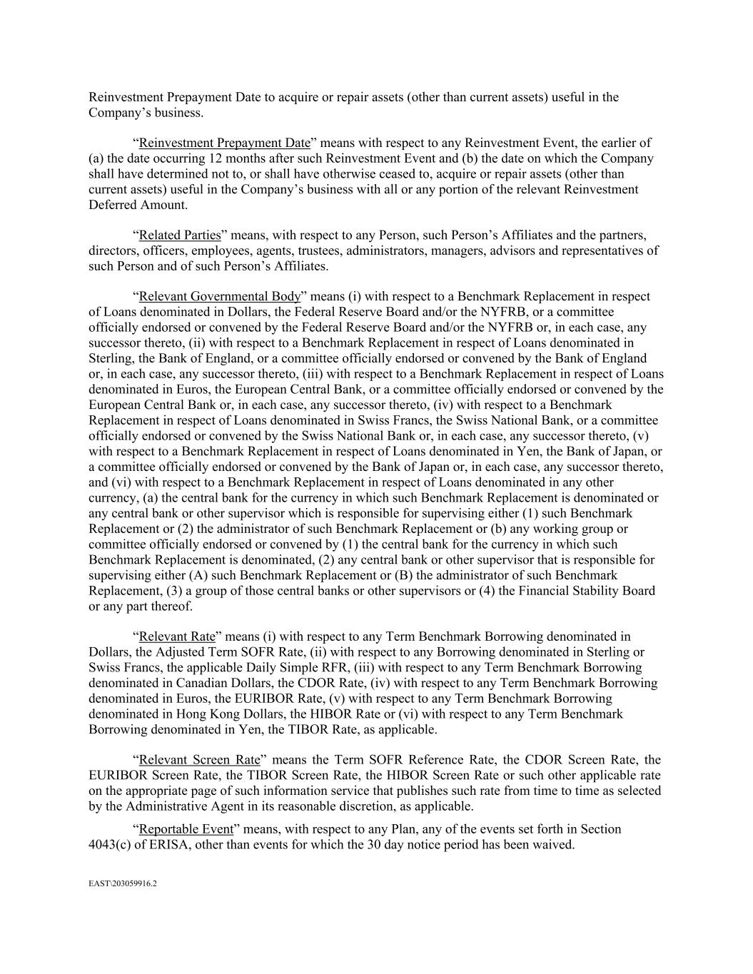 Reinvestment Prepayment Date to acquire or repair assets (other than current assets) useful in the Company’s business. “Reinvestment Prepayment Date” means with respect to any Reinvestment Event, the earlier of (a) the date occurring 12 months after such Reinvestment Event and (b) the date on which the Company shall have determined not to, or shall have otherwise ceased to, acquire or repair assets (other than current assets) useful in the Company’s business with all or any portion of the relevant Reinvestment Deferred Amount. “Related Parties” means, with respect to any Person, such Person’s Affiliates and the partners, directors, officers, employees, agents, trustees, administrators, managers, advisors and representatives of such Person and of such Person’s Affiliates. “Relevant Governmental Body” means (i) with respect to a Benchmark Replacement in respect of Loans denominated in Dollars, the Federal Reserve Board and/or the NYFRB, or a committee officially endorsed or convened by the Federal Reserve Board and/or the NYFRB or, in each case, any successor thereto, (ii) with respect to a Benchmark Replacement in respect of Loans denominated in Sterling, the Bank of England, or a committee officially endorsed or convened by the Bank of England or, in each case, any successor thereto, (iii) with respect to a Benchmark Replacement in respect of Loans denominated in Euros, the European Central Bank, or a committee officially endorsed or convened by the European Central Bank or, in each case, any successor thereto, (iv) with respect to a Benchmark Replacement in respect of Loans denominated in Swiss Francs, the Swiss National Bank, or a committee officially endorsed or convened by the Swiss National Bank or, in each case, any successor thereto, (v) with respect to a Benchmark Replacement in respect of Loans denominated in Yen, the Bank of Japan, or a committee officially endorsed or convened by the Bank of Japan or, in each case, any successor thereto, and (vi) with respect to a Benchmark Replacement in respect of Loans denominated in any other currency, (a) the central bank for the currency in which such Benchmark Replacement is denominated or any central bank or other supervisor which is responsible for supervising either (1) such Benchmark Replacement or (2) the administrator of such Benchmark Replacement or (b) any working group or committee officially endorsed or convened by (1) the central bank for the currency in which such Benchmark Replacement is denominated, (2) any central bank or other supervisor that is responsible for supervising either (A) such Benchmark Replacement or (B) the administrator of such Benchmark Replacement, (3) a group of those central banks or other supervisors or (4) the Financial Stability Board or any part thereof. “Relevant Rate” means (i) with respect to any Term Benchmark Borrowing denominated in Dollars, the Adjusted Term SOFR Rate, (ii) with respect to any Borrowing denominated in Sterling or Swiss Francs, the applicable Daily Simple RFR, (iii) with respect to any Term Benchmark Borrowing denominated in Canadian Dollars, the CDOR Rate, (iv) with respect to any Term Benchmark Borrowing denominated in Euros, the EURIBOR Rate, (v) with respect to any Term Benchmark Borrowing denominated in Hong Kong Dollars, the HIBOR Rate or (vi) with respect to any Term Benchmark Borrowing denominated in Yen, the TIBOR Rate, as applicable. “Relevant Screen Rate” means the Term SOFR Reference Rate, the CDOR Screen Rate, the EURIBOR Screen Rate, the TIBOR Screen Rate, the HIBOR Screen Rate or such other applicable rate on the appropriate page of such information service that publishes such rate from time to time as selected by the Administrative Agent in its reasonable discretion, as applicable. “Reportable Event” means, with respect to any Plan, any of the events set forth in Section 4043(c) of ERISA, other than events for which the 30 day notice period has been waived. EAST\203059916.2