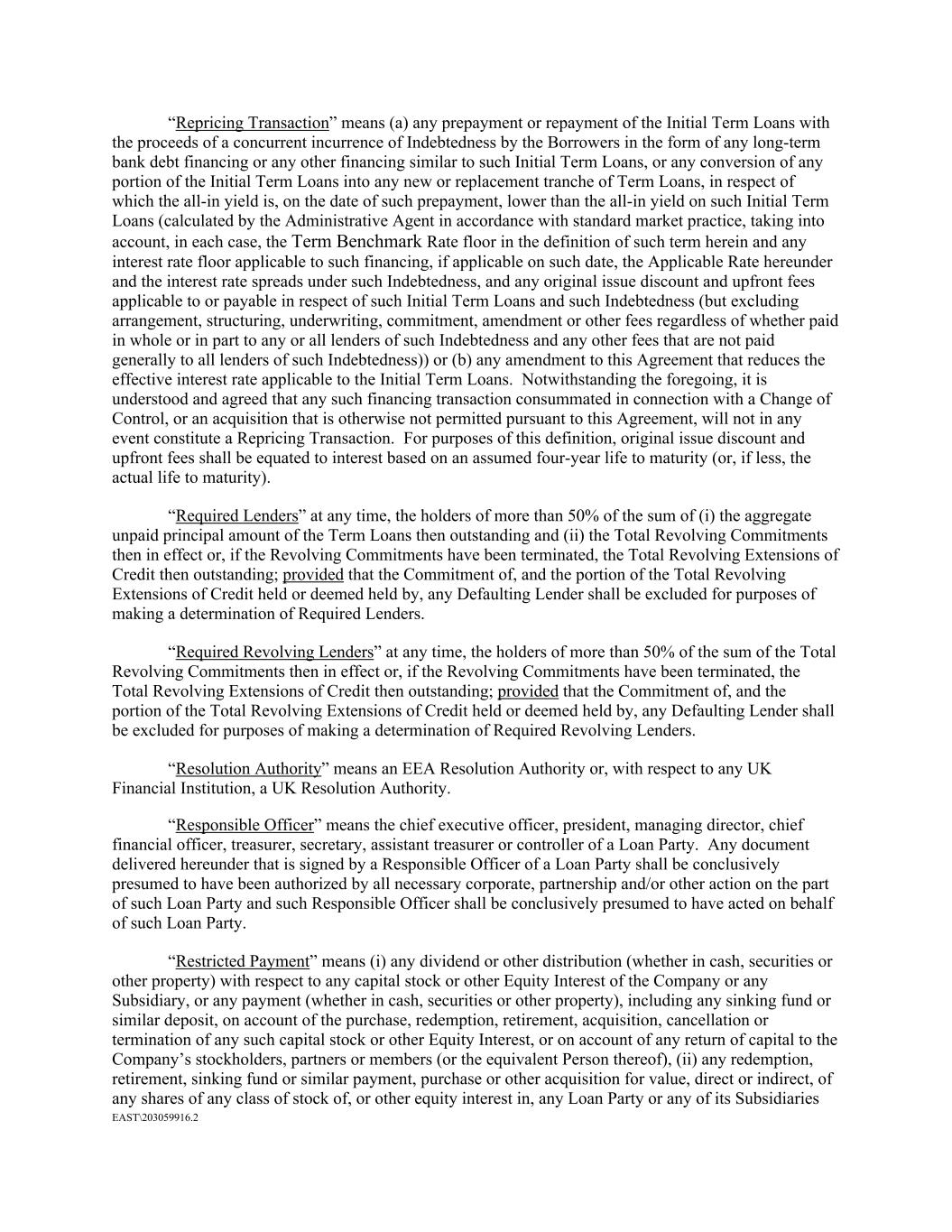 “Repricing Transaction” means (a) any prepayment or repayment of the Initial Term Loans with the proceeds of a concurrent incurrence of Indebtedness by the Borrowers in the form of any long-term bank debt financing or any other financing similar to such Initial Term Loans, or any conversion of any portion of the Initial Term Loans into any new or replacement tranche of Term Loans, in respect of which the all-in yield is, on the date of such prepayment, lower than the all-in yield on such Initial Term Loans (calculated by the Administrative Agent in accordance with standard market practice, taking into account, in each case, the Term Benchmark Rate floor in the definition of such term herein and any interest rate floor applicable to such financing, if applicable on such date, the Applicable Rate hereunder and the interest rate spreads under such Indebtedness, and any original issue discount and upfront fees applicable to or payable in respect of such Initial Term Loans and such Indebtedness (but excluding arrangement, structuring, underwriting, commitment, amendment or other fees regardless of whether paid in whole or in part to any or all lenders of such Indebtedness and any other fees that are not paid generally to all lenders of such Indebtedness)) or (b) any amendment to this Agreement that reduces the effective interest rate applicable to the Initial Term Loans. Notwithstanding the foregoing, it is understood and agreed that any such financing transaction consummated in connection with a Change of Control, or an acquisition that is otherwise not permitted pursuant to this Agreement, will not in any event constitute a Repricing Transaction. For purposes of this definition, original issue discount and upfront fees shall be equated to interest based on an assumed four-year life to maturity (or, if less, the actual life to maturity). “Required Lenders” at any time, the holders of more than 50% of the sum of (i) the aggregate unpaid principal amount of the Term Loans then outstanding and (ii) the Total Revolving Commitments then in effect or, if the Revolving Commitments have been terminated, the Total Revolving Extensions of Credit then outstanding; provided that the Commitment of, and the portion of the Total Revolving Extensions of Credit held or deemed held by, any Defaulting Lender shall be excluded for purposes of making a determination of Required Lenders. “Required Revolving Lenders” at any time, the holders of more than 50% of the sum of the Total Revolving Commitments then in effect or, if the Revolving Commitments have been terminated, the Total Revolving Extensions of Credit then outstanding; provided that the Commitment of, and the portion of the Total Revolving Extensions of Credit held or deemed held by, any Defaulting Lender shall be excluded for purposes of making a determination of Required Revolving Lenders. “Resolution Authority” means an EEA Resolution Authority or, with respect to any UK Financial Institution, a UK Resolution Authority. “Responsible Officer” means the chief executive officer, president, managing director, chief financial officer, treasurer, secretary, assistant treasurer or controller of a Loan Party. Any document delivered hereunder that is signed by a Responsible Officer of a Loan Party shall be conclusively presumed to have been authorized by all necessary corporate, partnership and/or other action on the part of such Loan Party and such Responsible Officer shall be conclusively presumed to have acted on behalf of such Loan Party. “Restricted Payment” means (i) any dividend or other distribution (whether in cash, securities or other property) with respect to any capital stock or other Equity Interest of the Company or any Subsidiary, or any payment (whether in cash, securities or other property), including any sinking fund or similar deposit, on account of the purchase, redemption, retirement, acquisition, cancellation or termination of any such capital stock or other Equity Interest, or on account of any return of capital to the Company’s stockholders, partners or members (or the equivalent Person thereof), (ii) any redemption, retirement, sinking fund or similar payment, purchase or other acquisition for value, direct or indirect, of any shares of any class of stock of, or other equity interest in, any Loan Party or any of its Subsidiaries EAST\203059916.2